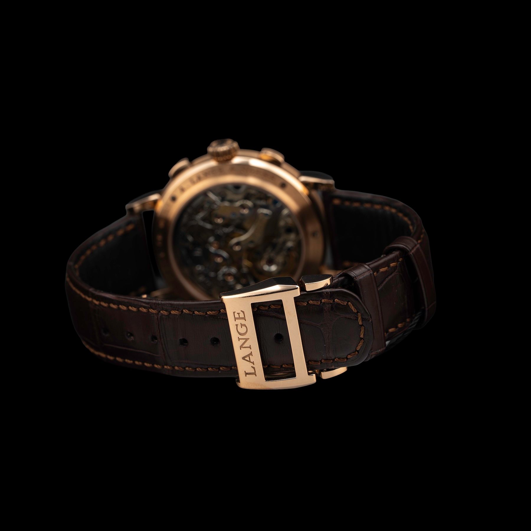 This watch features a 41mm 18-carat pink gold case on leather strap. This watch also sports a black dial. Powered by a manually wound movement. Water resistance up to 30 meters.