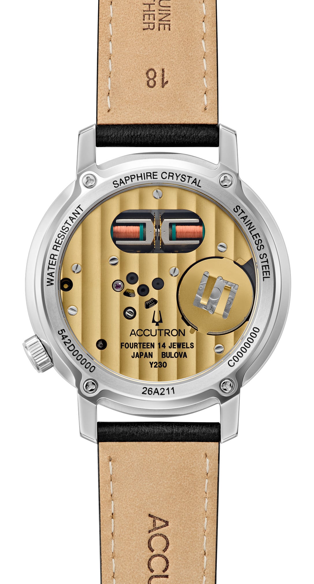 The new, hand-assembled Accutron Caliber Y230 is accurate to within two seconds per day, vibrating at 360hz to create the tuning fork’s signature F-sharp hum and smooth sweeping second hand.