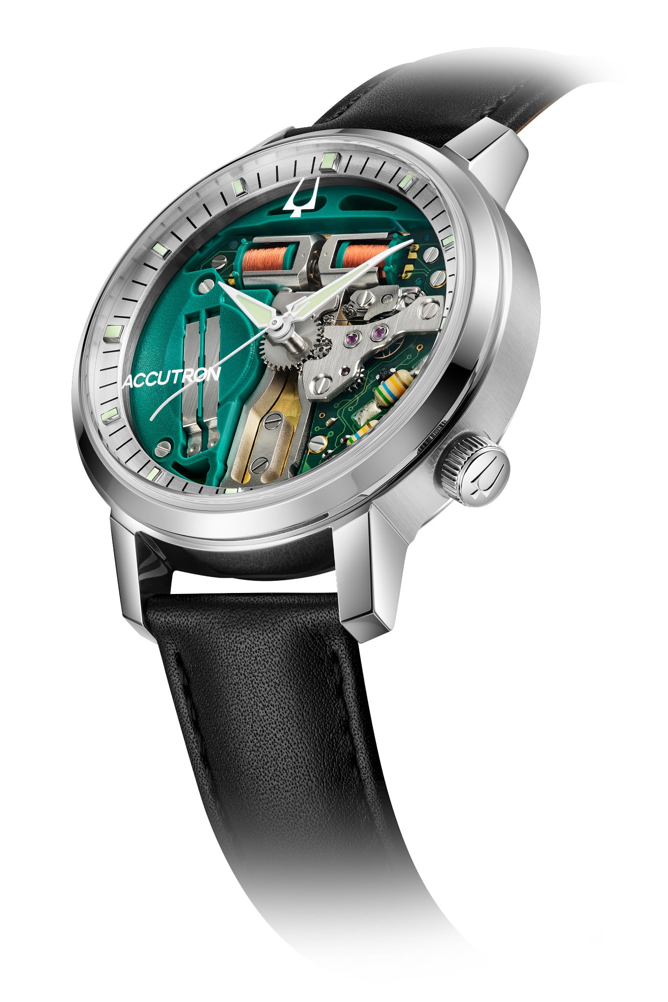 In 1960, Accutron changed timekeeping forever with its tuning fork movement. Its smooth sweeping seconds hand and signature hum marked a revolution in precision. Today, the Spaceview 314 honors that legacy with modern craftsmanship and timeless innovation, marked with its signature F-sharp hum.