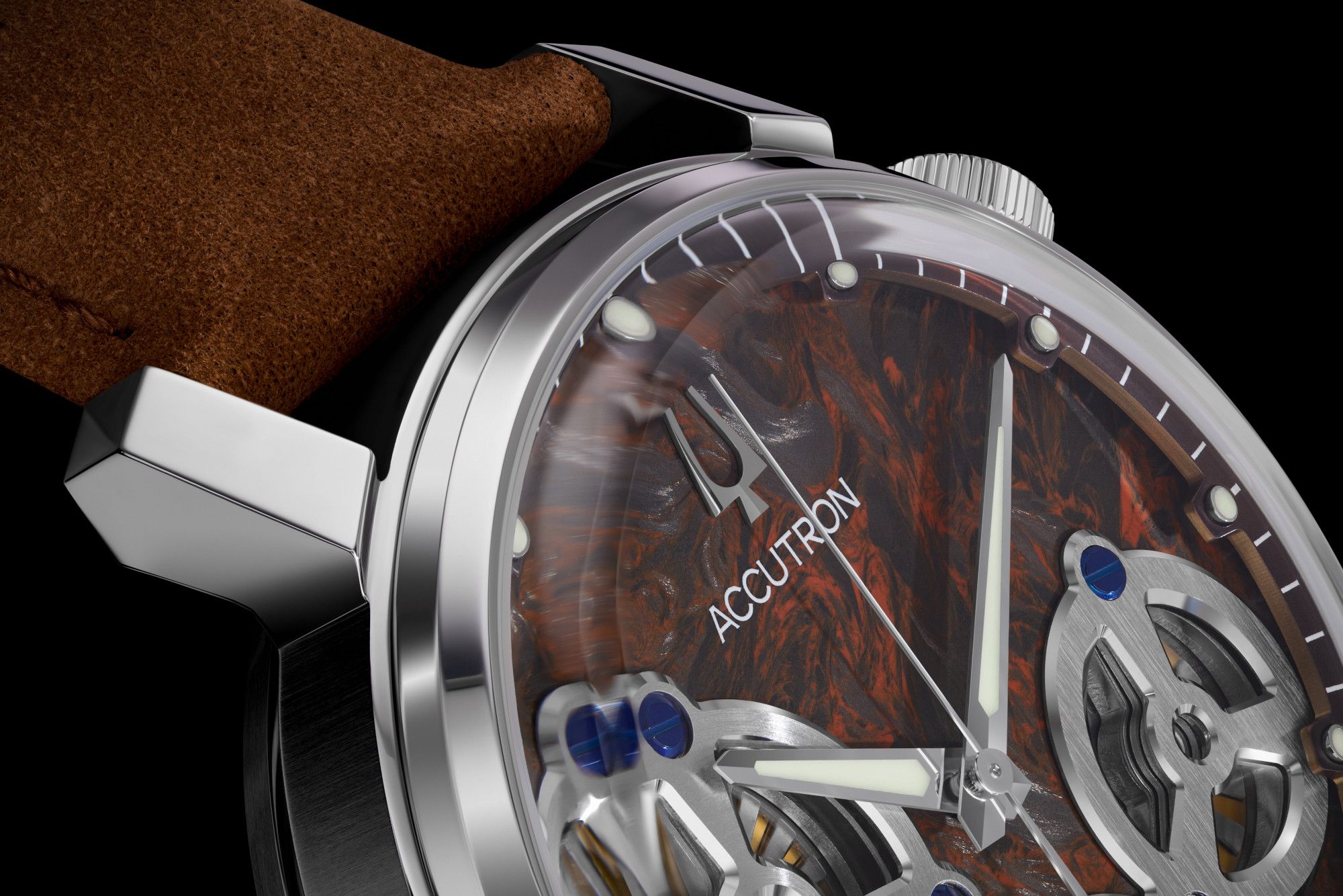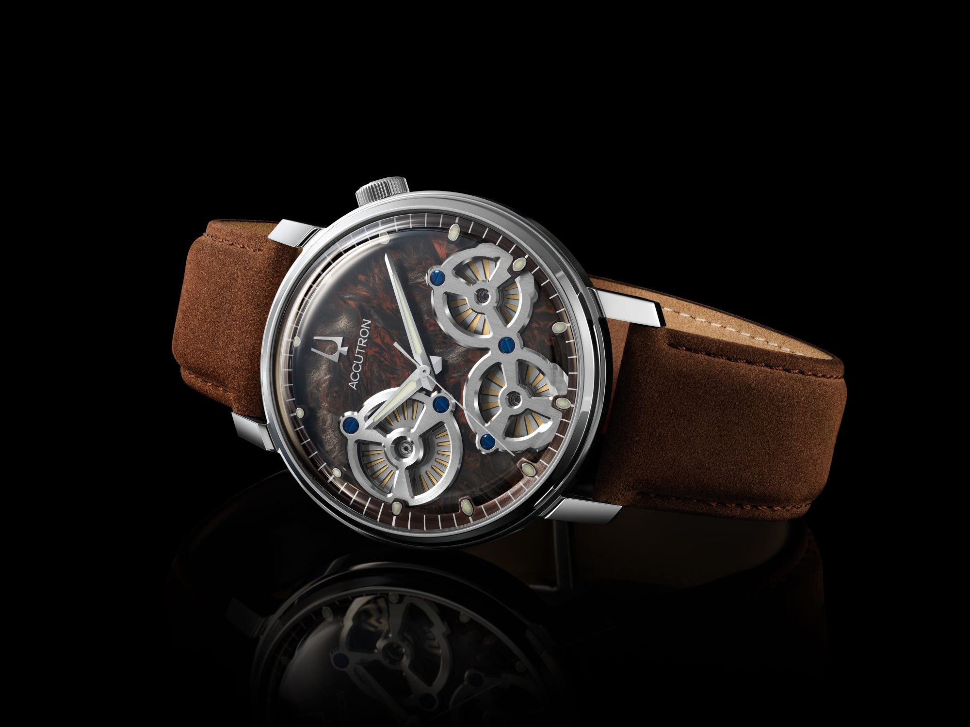Retaining the iconic and distinctive case of the Spaceview 2020, each Evolution model features an updated movement orientation shifted by 30 degrees, repositioned turbines, and a crown uniquely positioned at two o’clock for added comfort and eye-catching style. Enhanced bridgework details, including fine knurled finishing and contrast screws accentuate dial details. The introduction of four new forged carbon dial Spaceview Evolution continues Accutron’s trendsetting legacy. Due to the meticulous hand-built process, each timepiece is produced in small batches.
