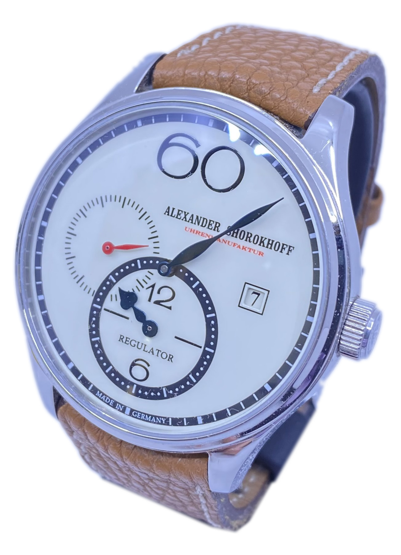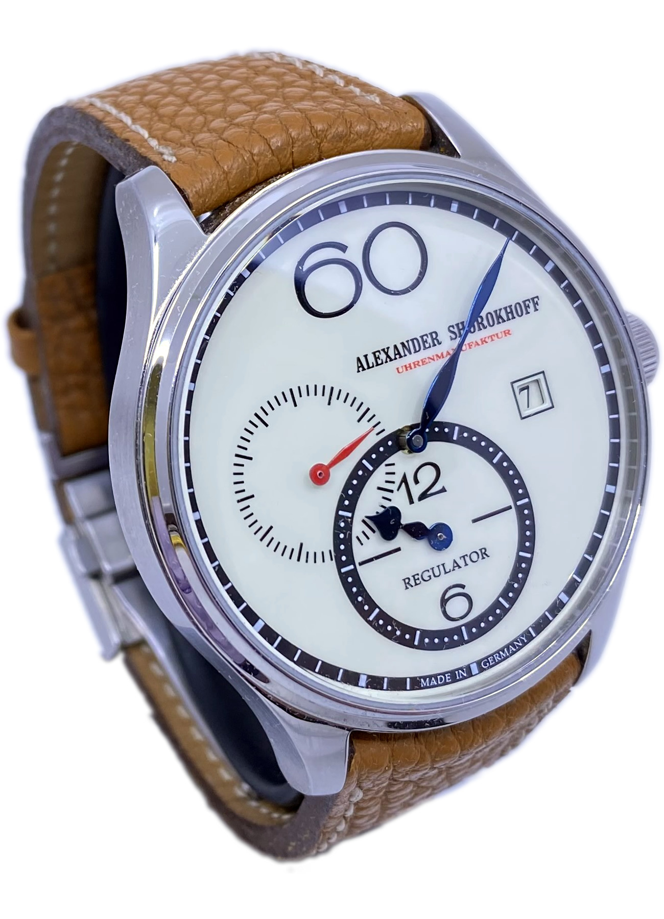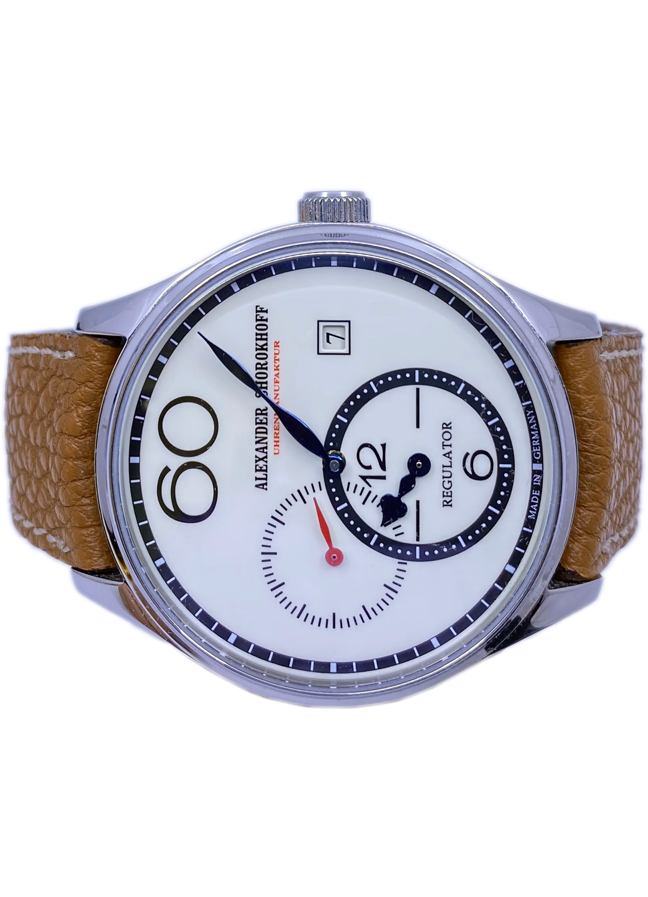 - This timepiece features a 43.5mm steel case paired with a high quality leather strap. It showcases a distinctive white dial and is powered by a precise manual winding movement. The watch is designed with a water resistance of up to 50m.