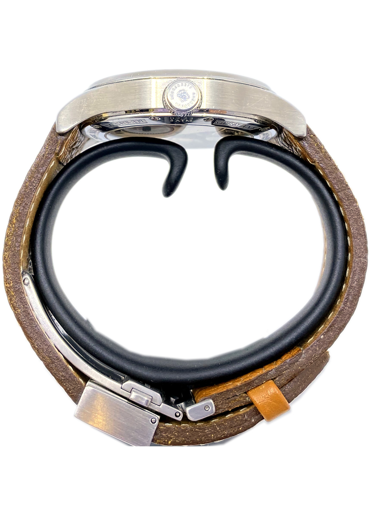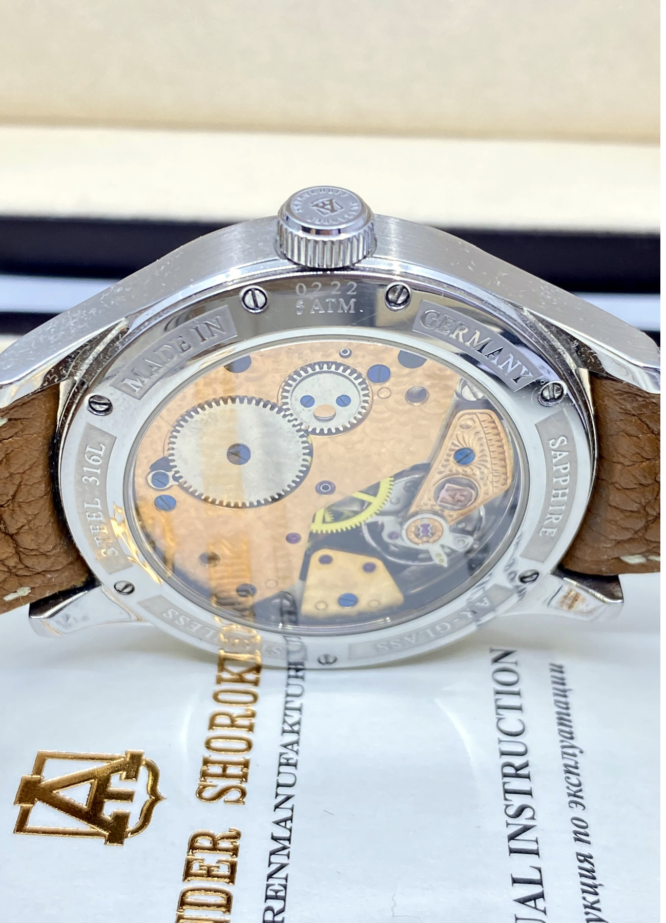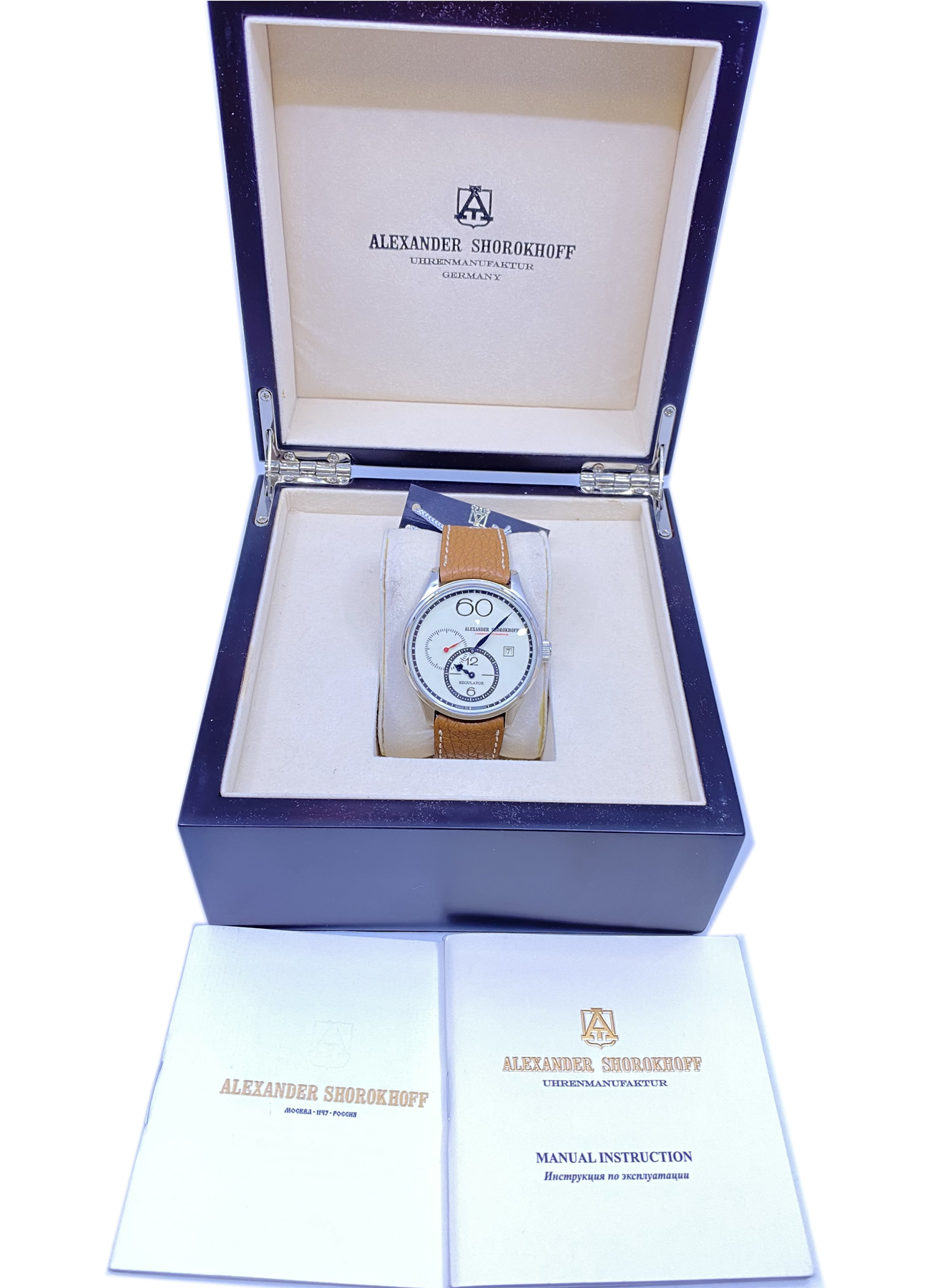 - This timepiece features a 43.5mm steel case paired with a high quality leather strap. It showcases a distinctive white dial and is powered by a precise manual winding movement. The watch is designed with a water resistance of up to 50m.