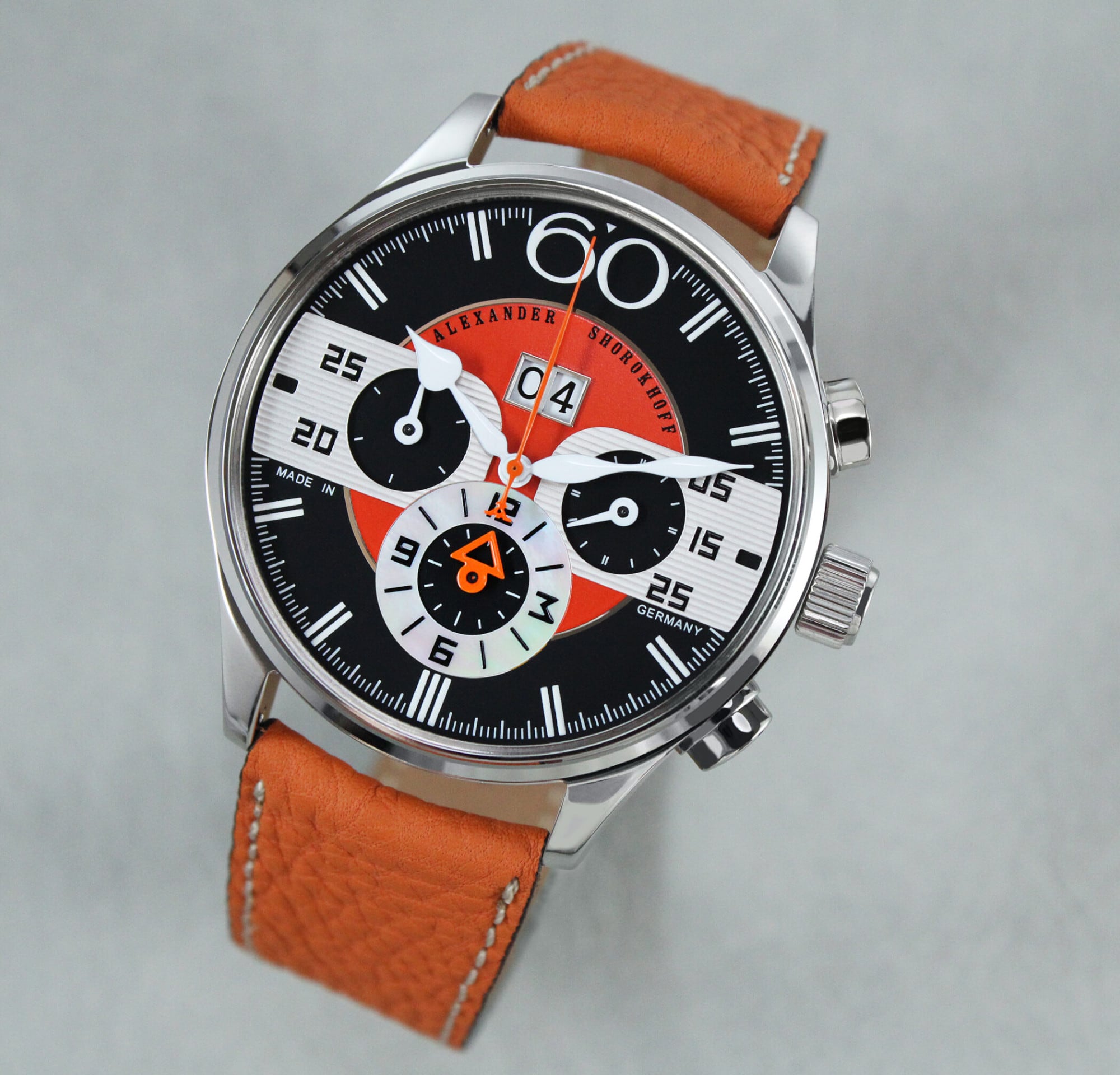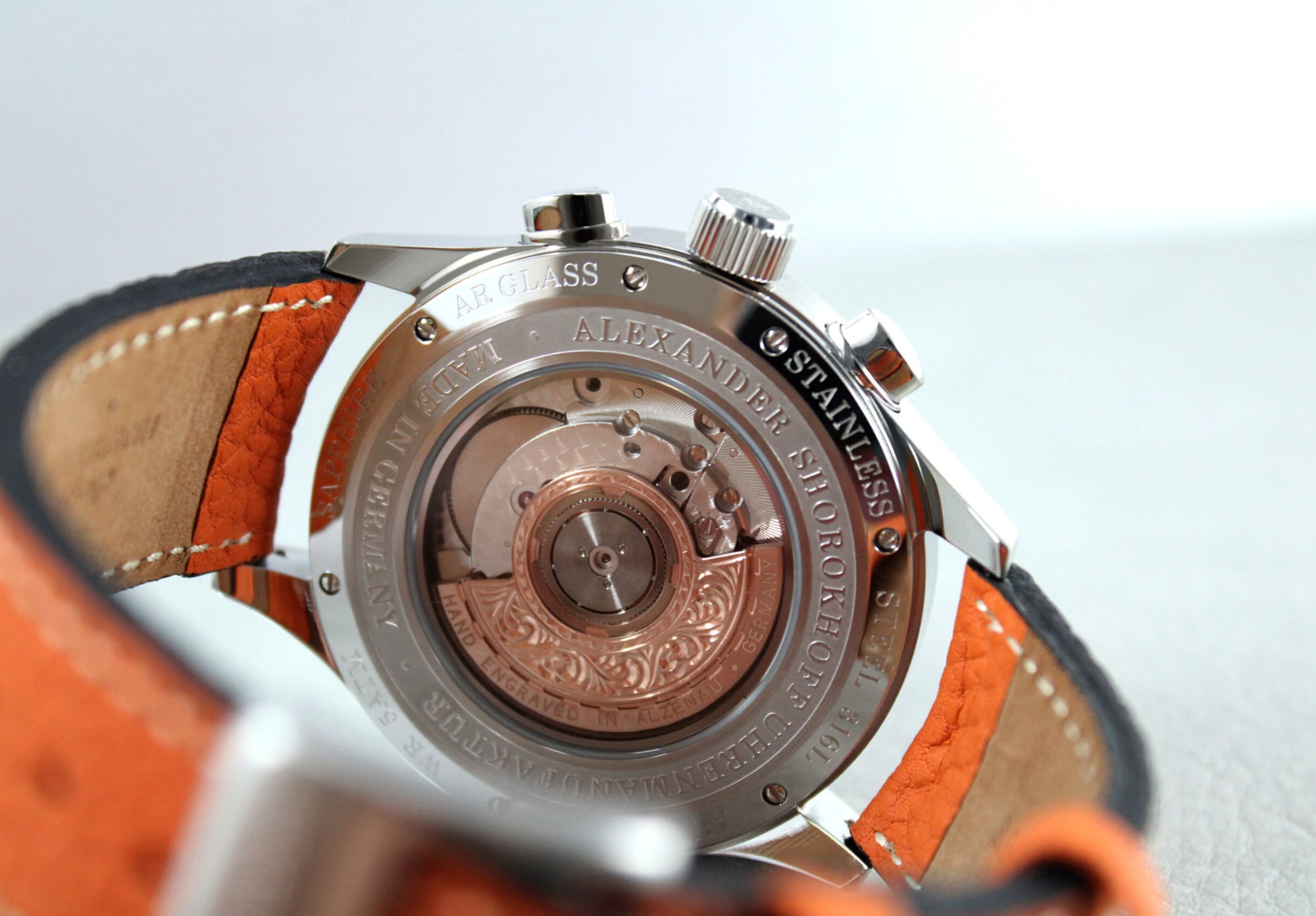 The mechanics of the “Big Date Chrono” necessitate a sophisticated movement to synchronize and accurately move the two digits. The Alexander Shorokhoff watch manufactory employs the reliable Swiss automatic chronograph movement Dubois-Dépraz DD4500. This movement offers exceptional precision, along with a stopwatch function and a luminous mother-of-pearl hour display at the 6 o’clock position. Additionally, it features a power reserve of 42 hours, complemented by a hand-engraved rotor.