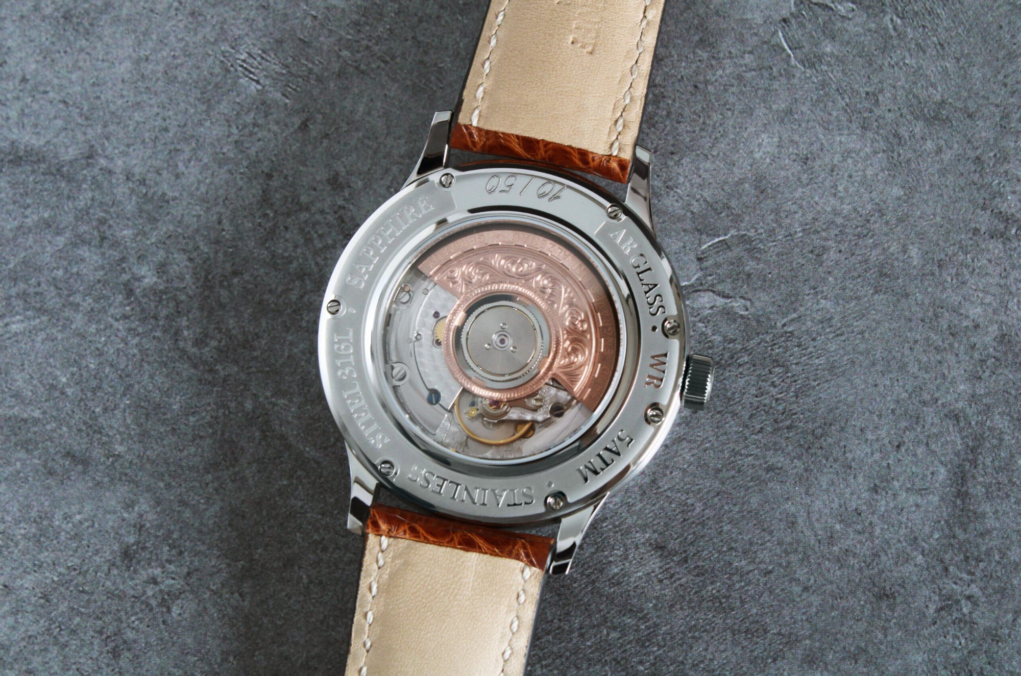 The watch is worn on a high-quality leather strap that perfectly emphasizes its avant-garde, elegant character. Inside beats the refined and hand-engraved SW300 automatic movement, whose artistic details are visible through the sapphire crystal case back.