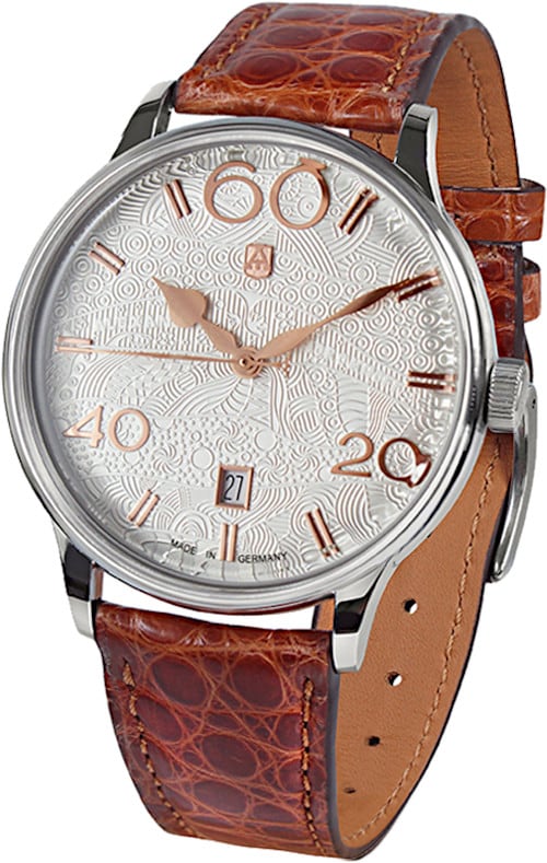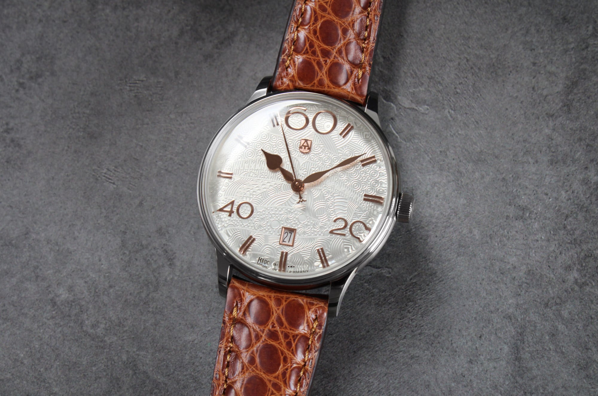 The dial is available in two versions: a warm and a cooler color scheme, each complemented by gold or silver-colored hands. This model also features the iconic large numerals 60, 20 and 40.