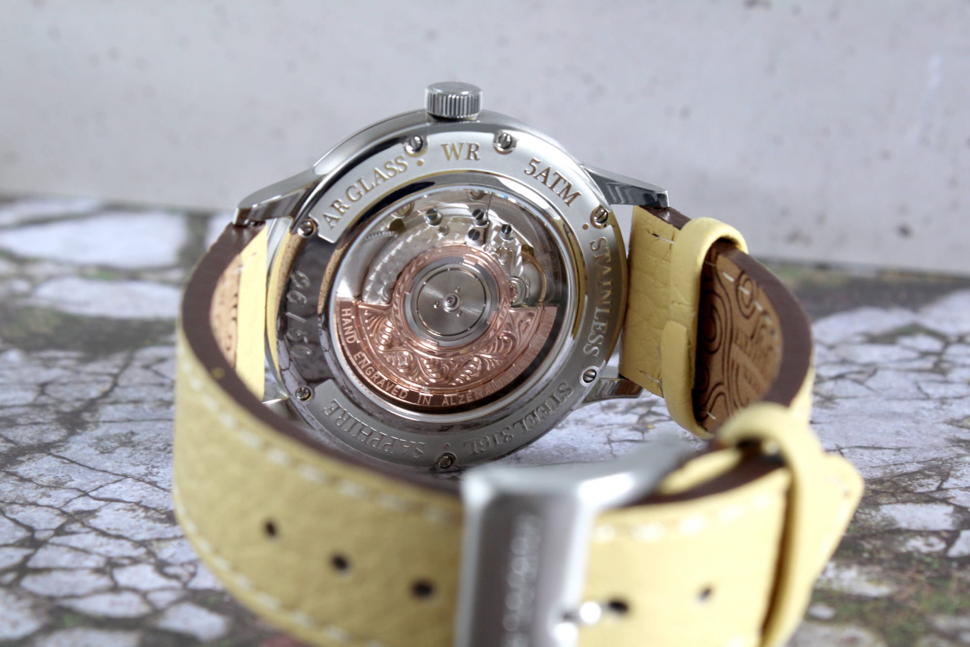 The watch is worn on a high-quality leather strap that perfectly emphasizes its avant-garde, elegant character. Inside beats the refined and hand-engraved SW300 automatic movement, whose artistic details are visible through the sapphire crystal case back.