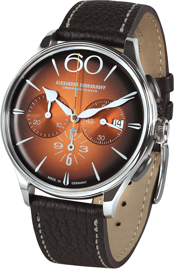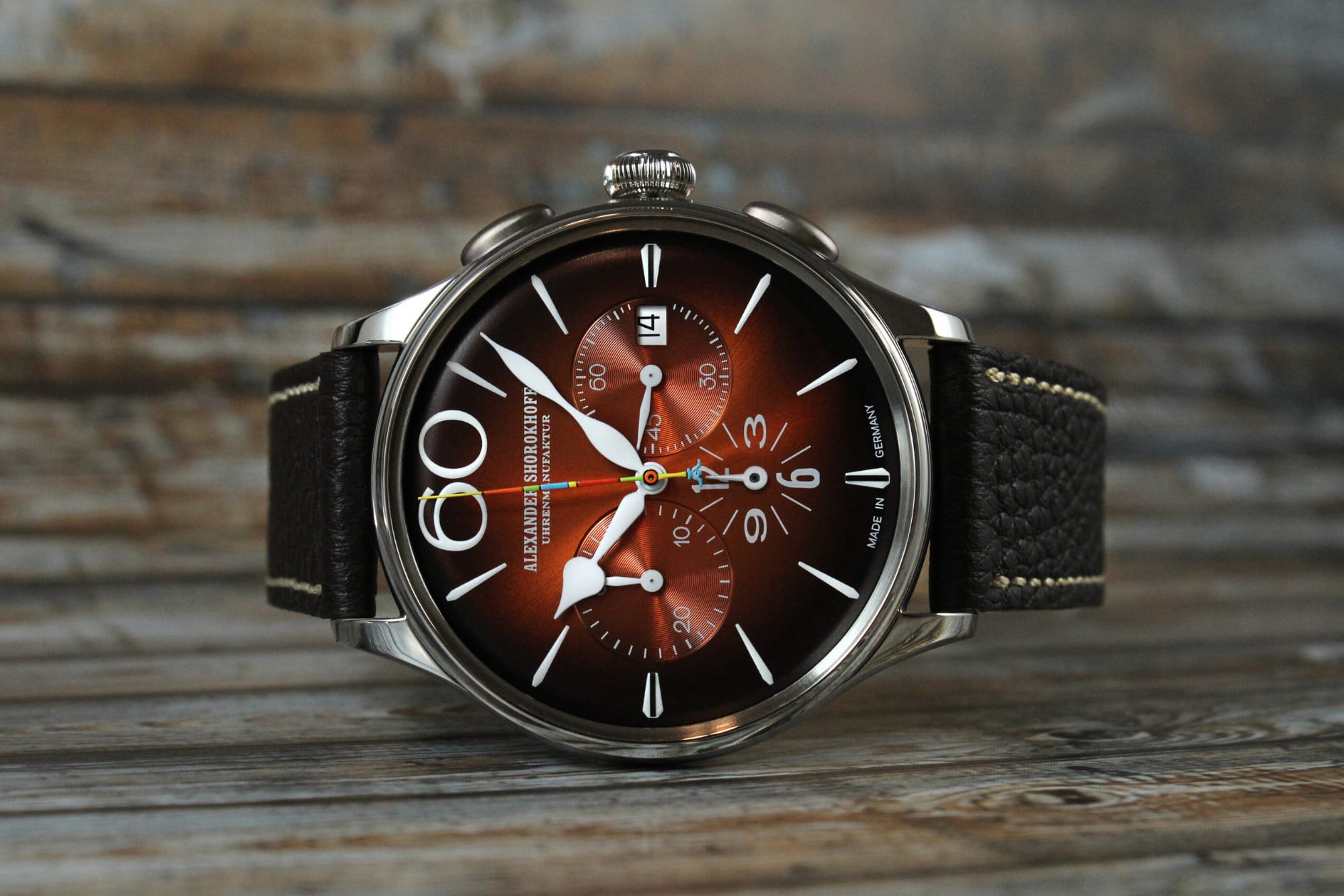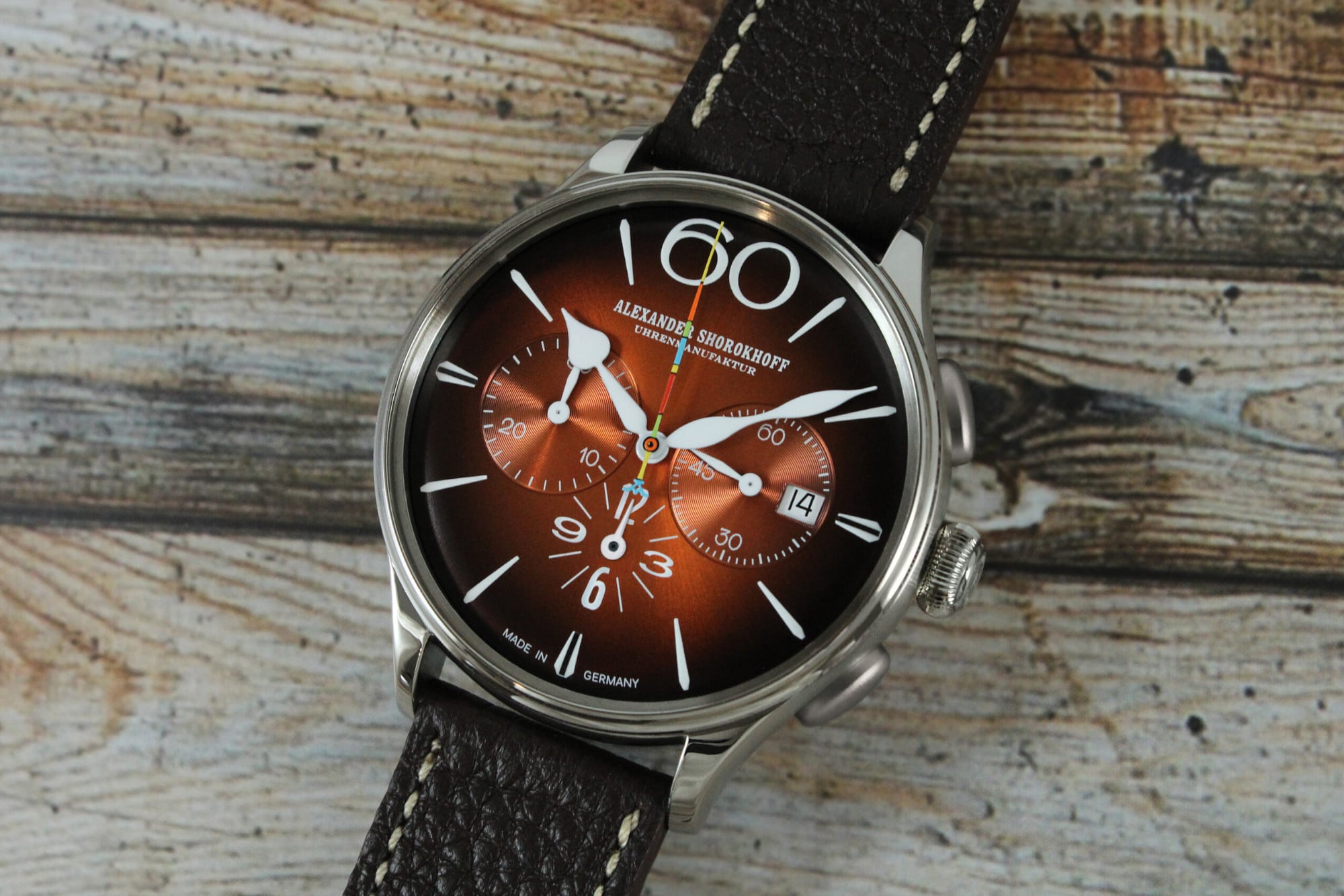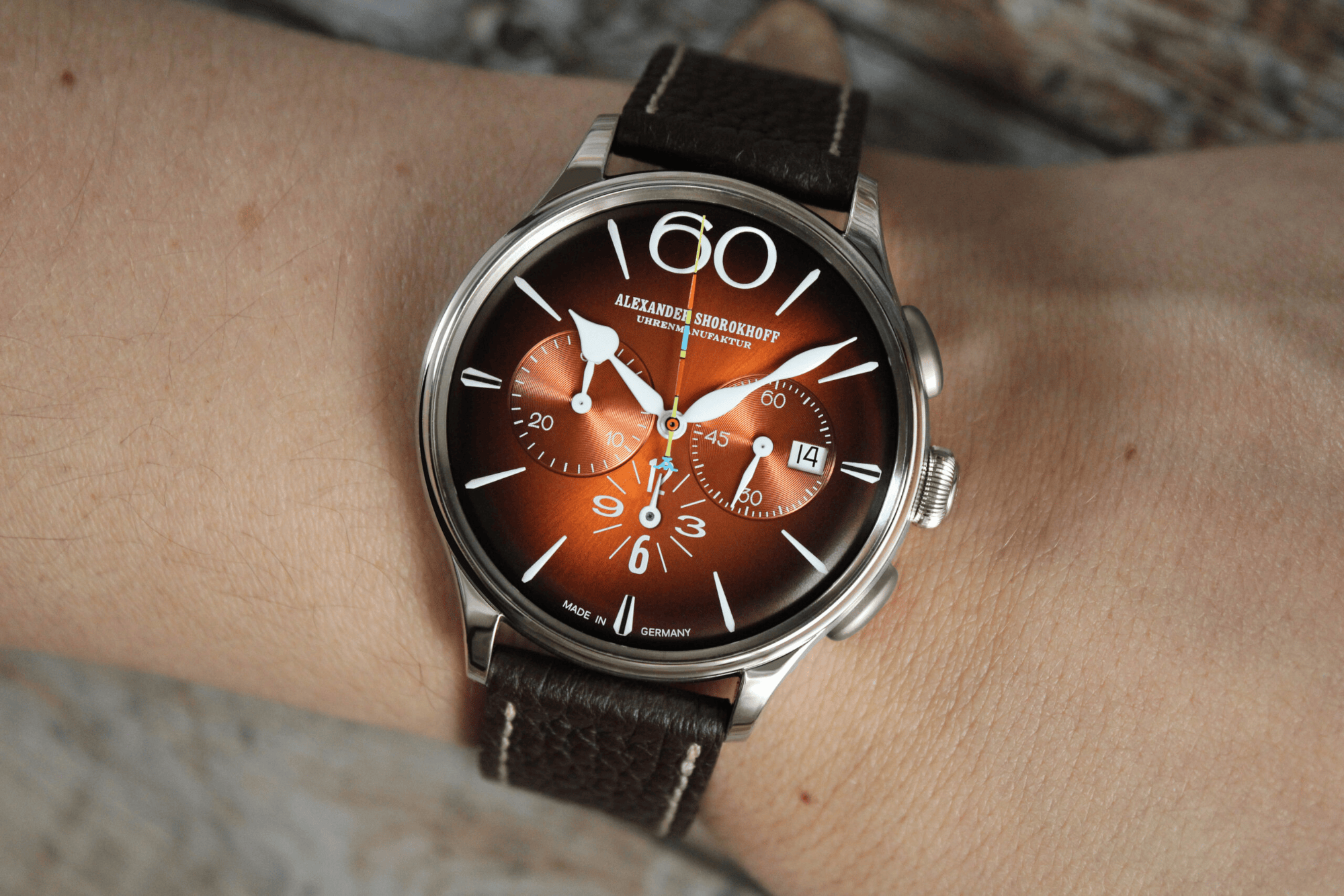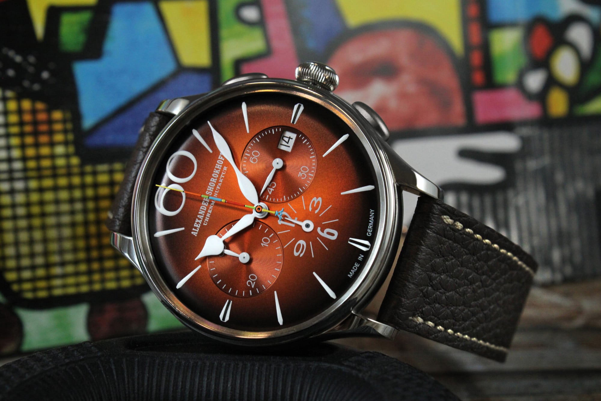 The “Happy Second” model is expanding its collection! After the bold first version, the successor comes with a completely new color design. The new chronograph “Happy Second Orange” shines with a dial in a warm retro orange that transitions into a deep dark brown on the sides—an unusual color combination for Alexander Shorokhoff, who usually delights with his bold, colorful creations.