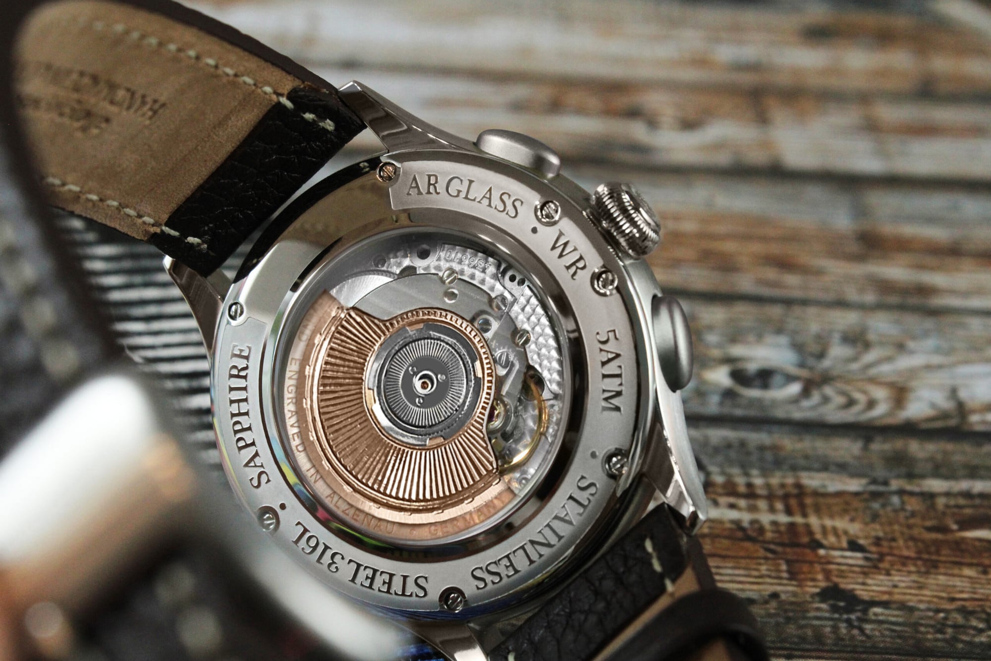 Inside, the precise ETA 2894 chronograph ticks, with a total height of only 6.10 mm. It offers a stop function with a central second hand, a decentralized minute display at 9 o’clock, and an hour display at 6 o’clock. The rotor, as with all Alexander Shorokhoff watches, is intricately hand-engraved and refined.