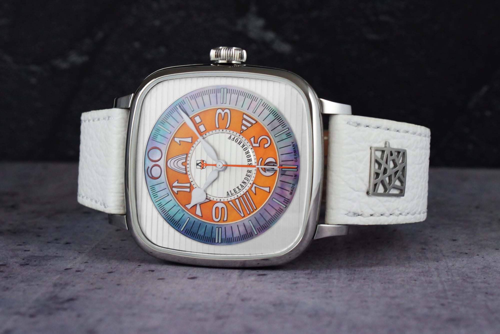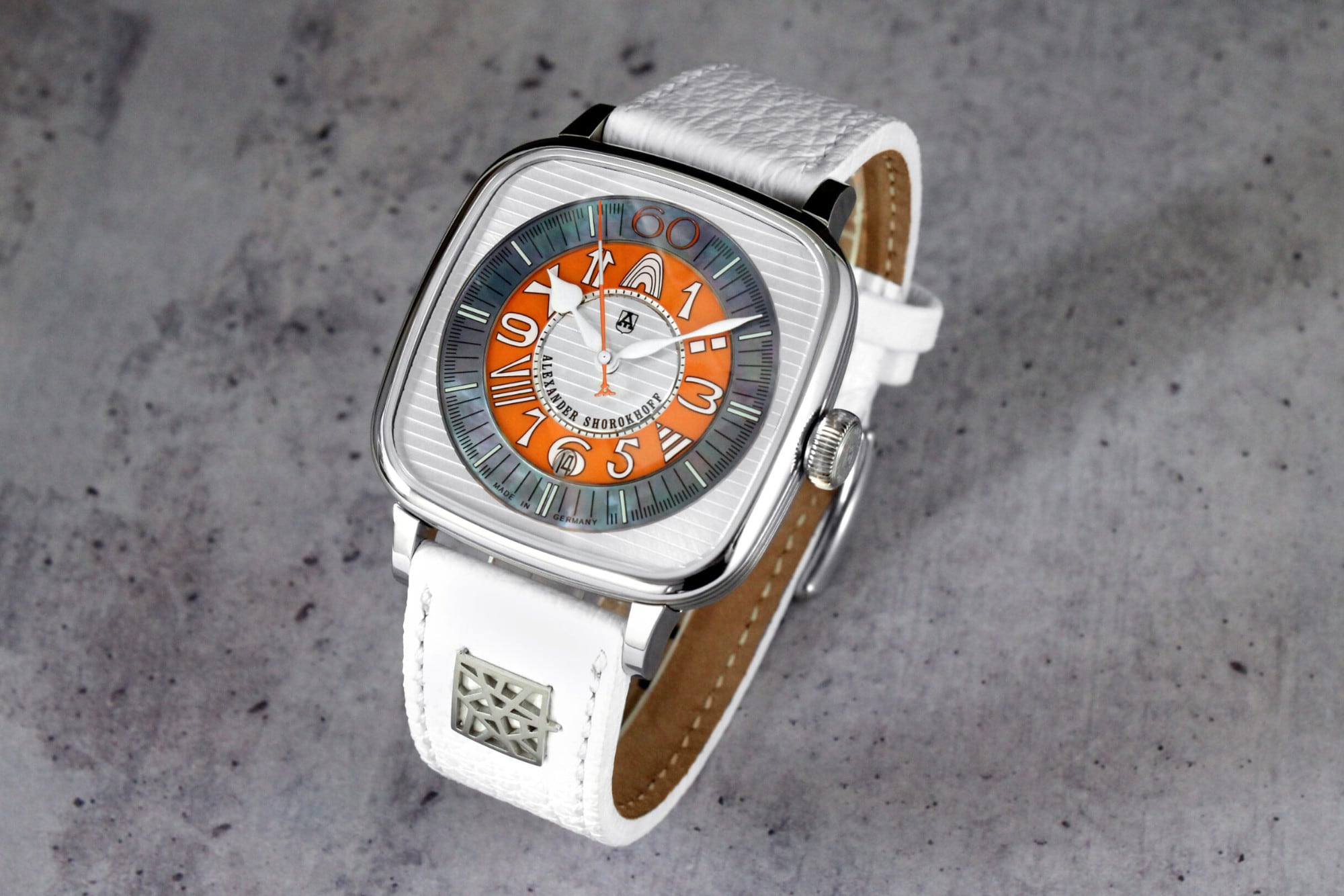 A fascinating dynamic is created by the harmonious combination of a round dial and a square case. The guilloché dial features colored mother-of-pearl inlays in orange and blue, making it a true work of art. The light blue mother-of-pearl provides a clean, sporty layout, while the orange ring offers a playful, creative interpretation of time. For example, the number 4 is represented by four triangle elements, and the 8 appears in Roman numerals—a subtle wink for design enthusiasts.