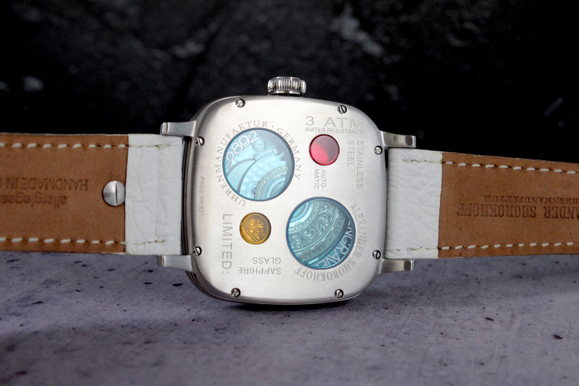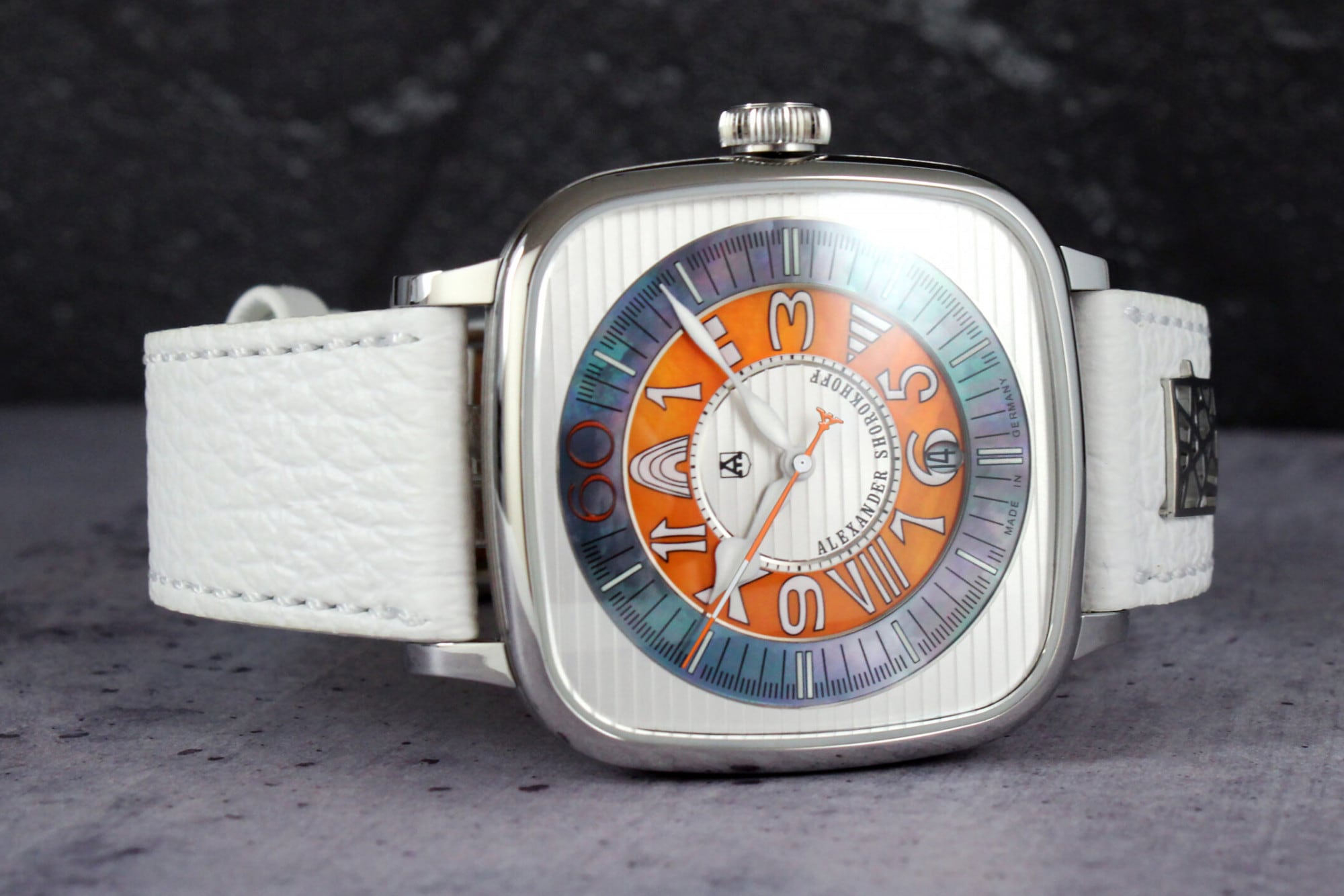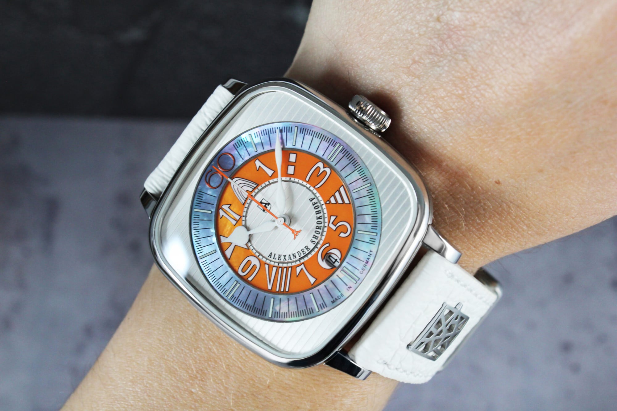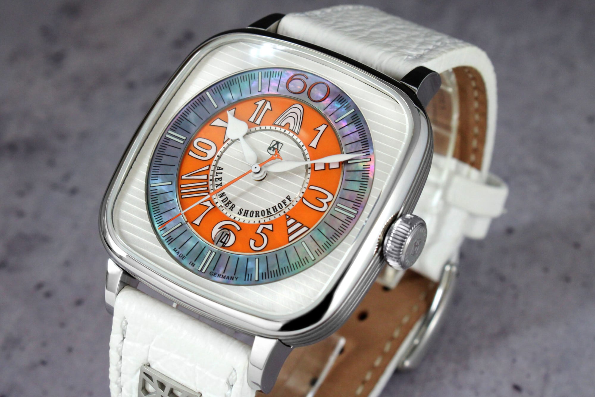 Just in time for the warm season, Alexander Shorokhoff presents an extraordinary automatic timepiece for those who love color, form, and individuality: the new “Kandy Sport Unique”. This sporty, avant-garde automatic watch makes a bold statement with its unmistakable design and is available in two striking color variants.