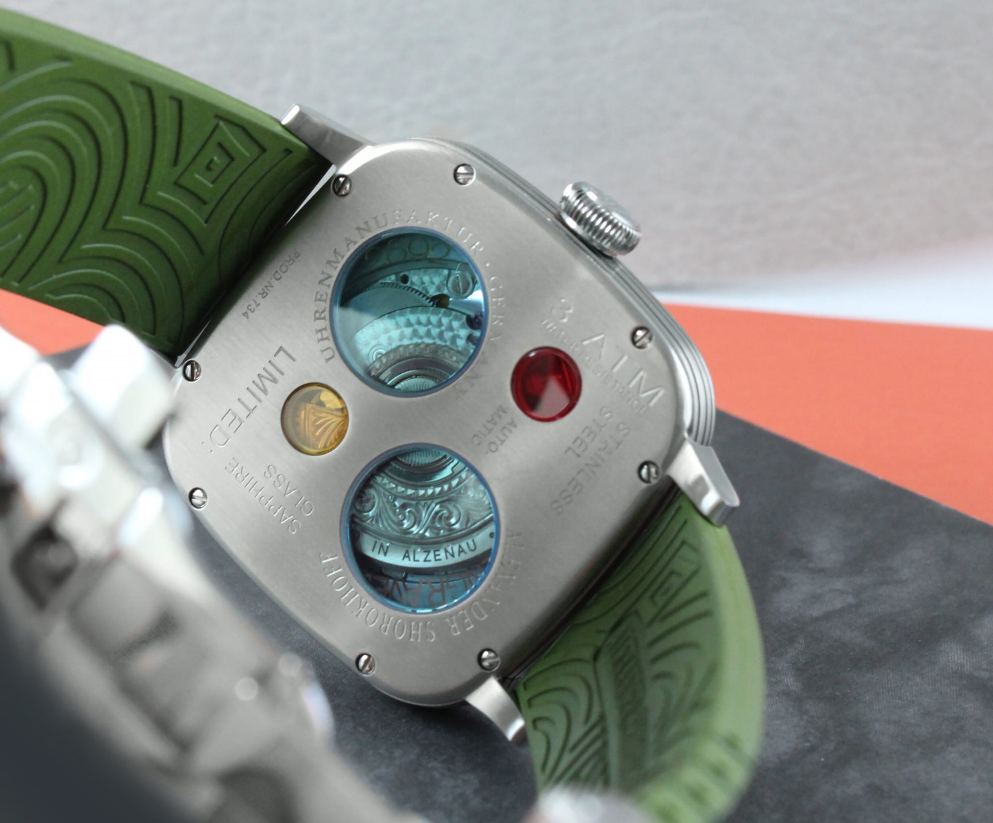 The rectangular stainless steel case with three recesses in the middle section gives the watch a modern, dynamic, and at the same time sporty and fresh character. A true highlight is the unique case back featuring four small glass windows in avant-garde colors—red, yellow, and blue—making a strong design statement.
