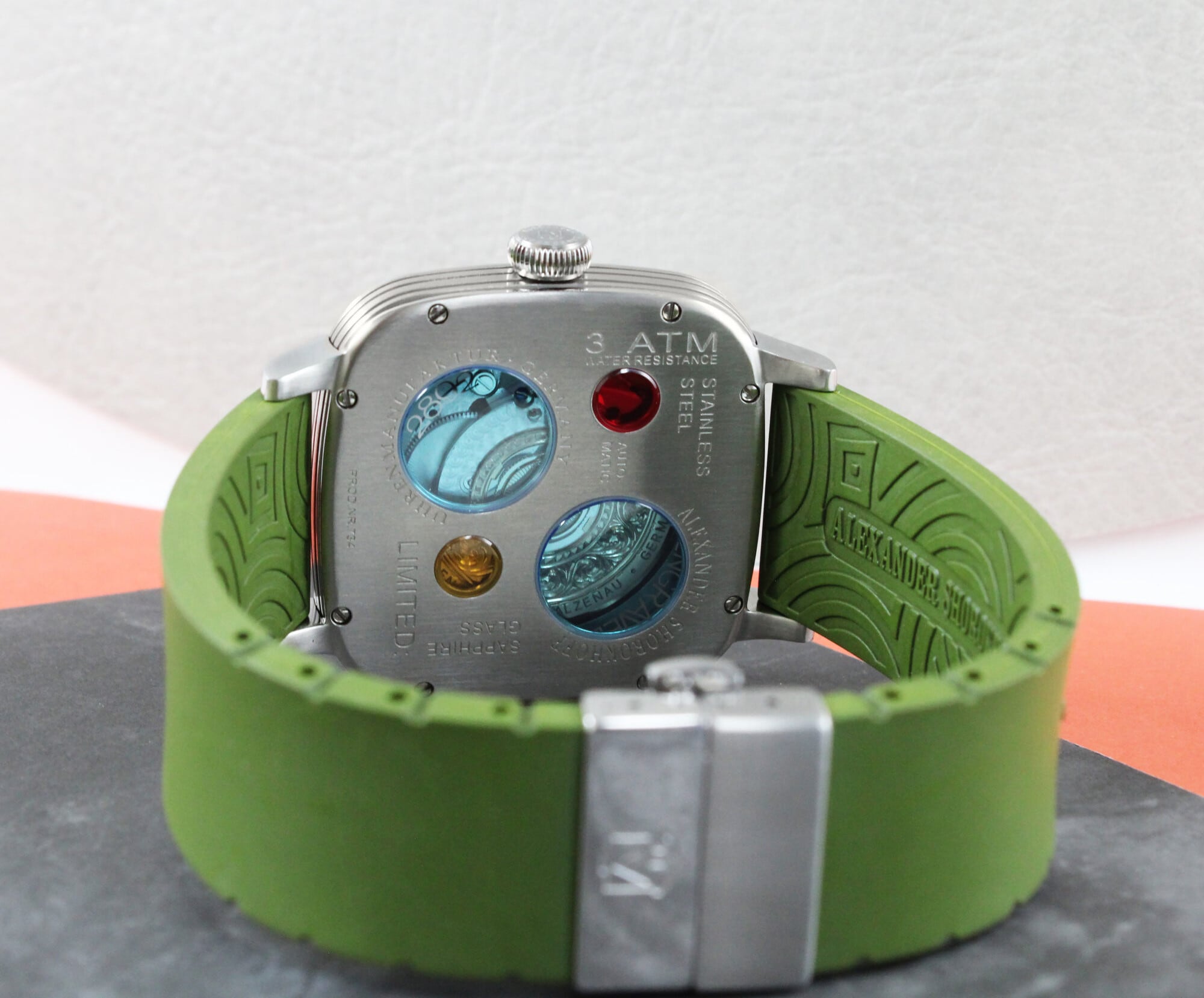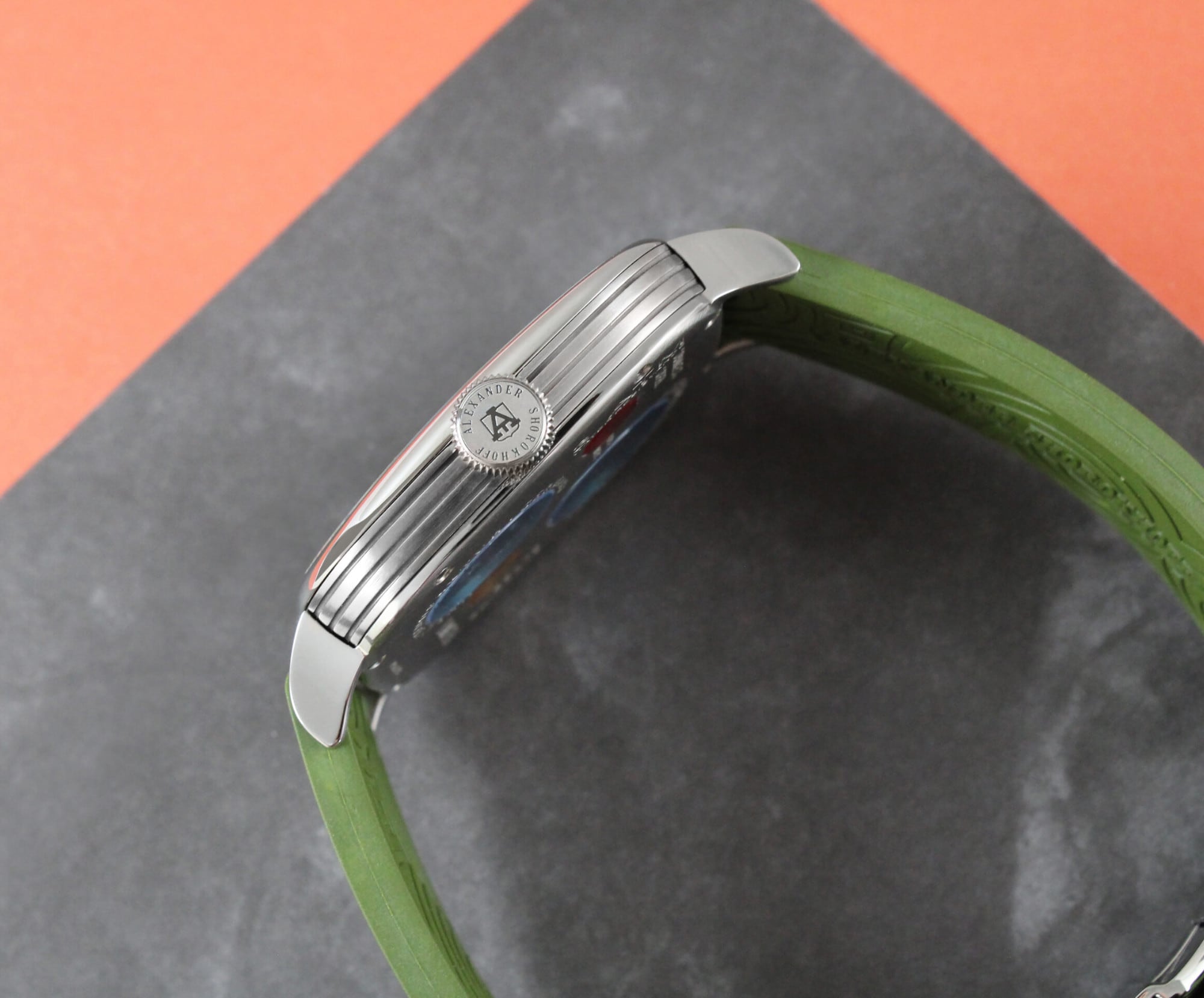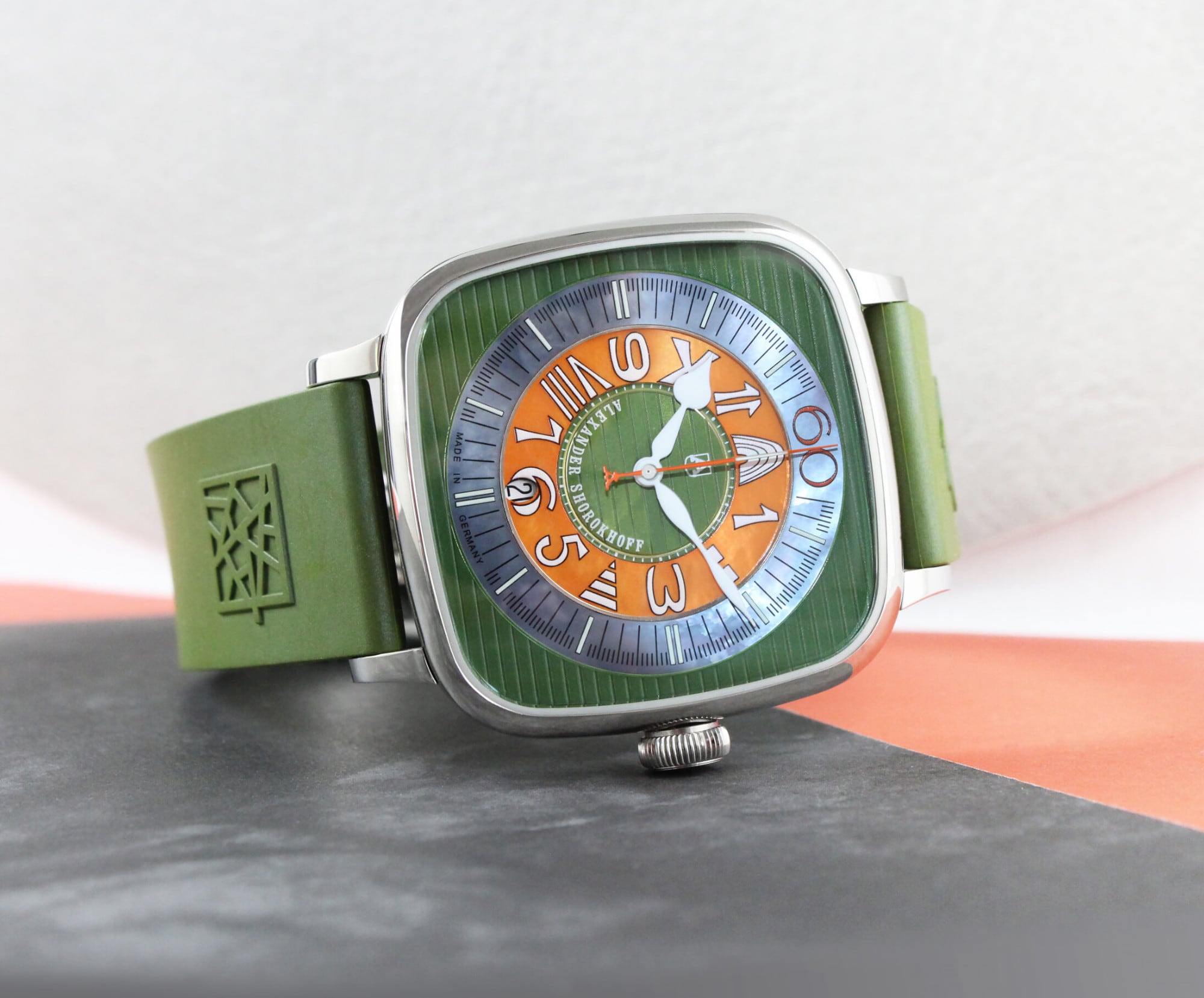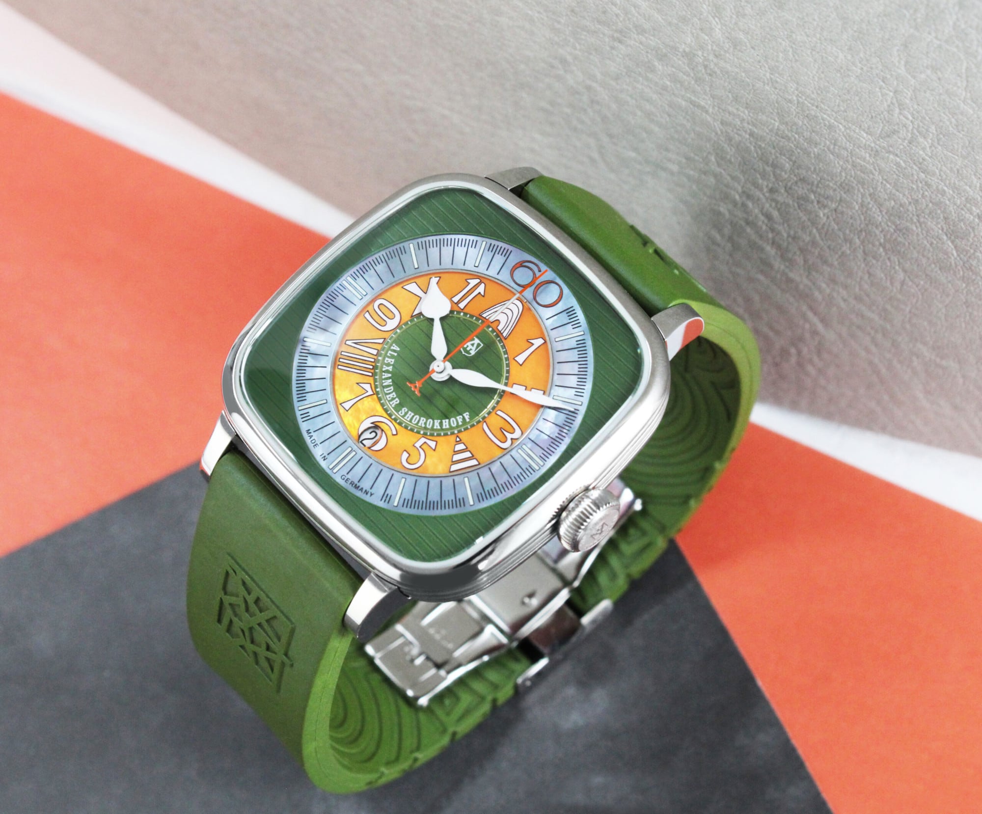 Just in time for the warm season, Alexander Shorokhoff presents an extraordinary automatic timepiece for those who love color, form, and individuality: the new “Kandy Sport Unique”. This sporty, avant-garde automatic watch makes a bold statement with its unmistakable design and is available in two striking color variants.
