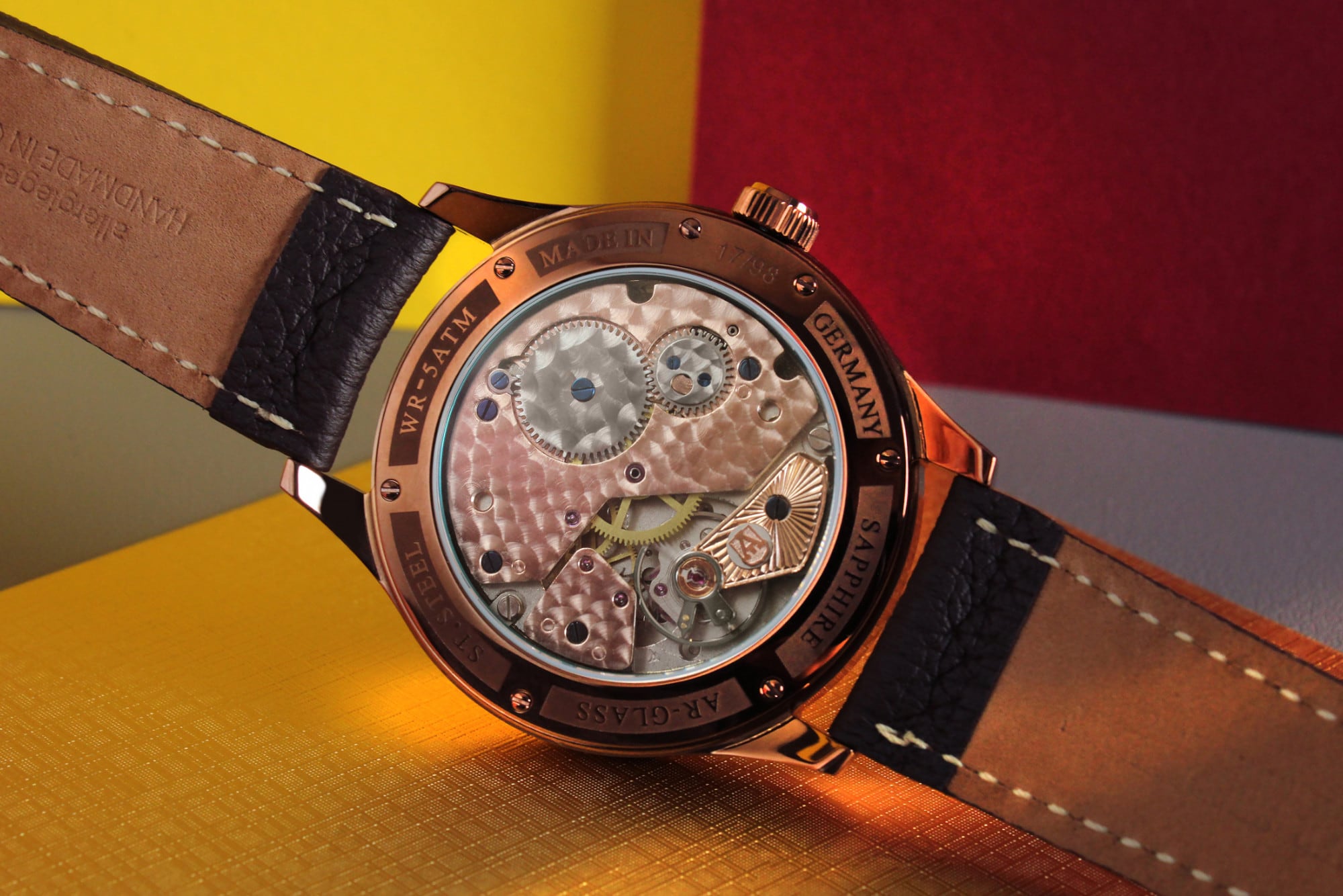 Inside, the refined 3105.AS hand-wound movement is visible through the high-quality sapphire crystal case back. The movement impresses with its delicate engravings, cloud finish, rose gold coating, and hand-polished and blued screws – an expression of the finest German watchmaking craftsmanship.