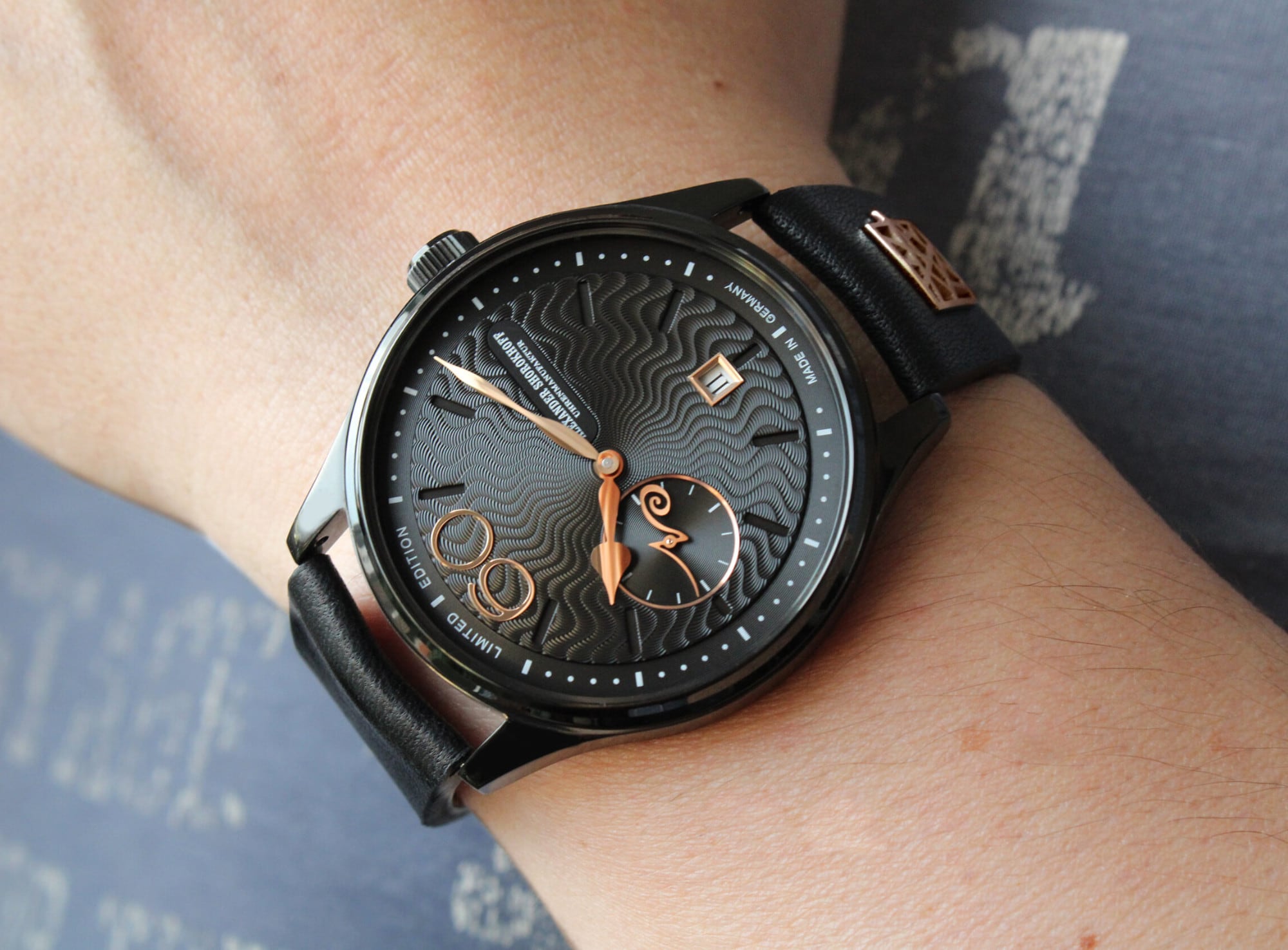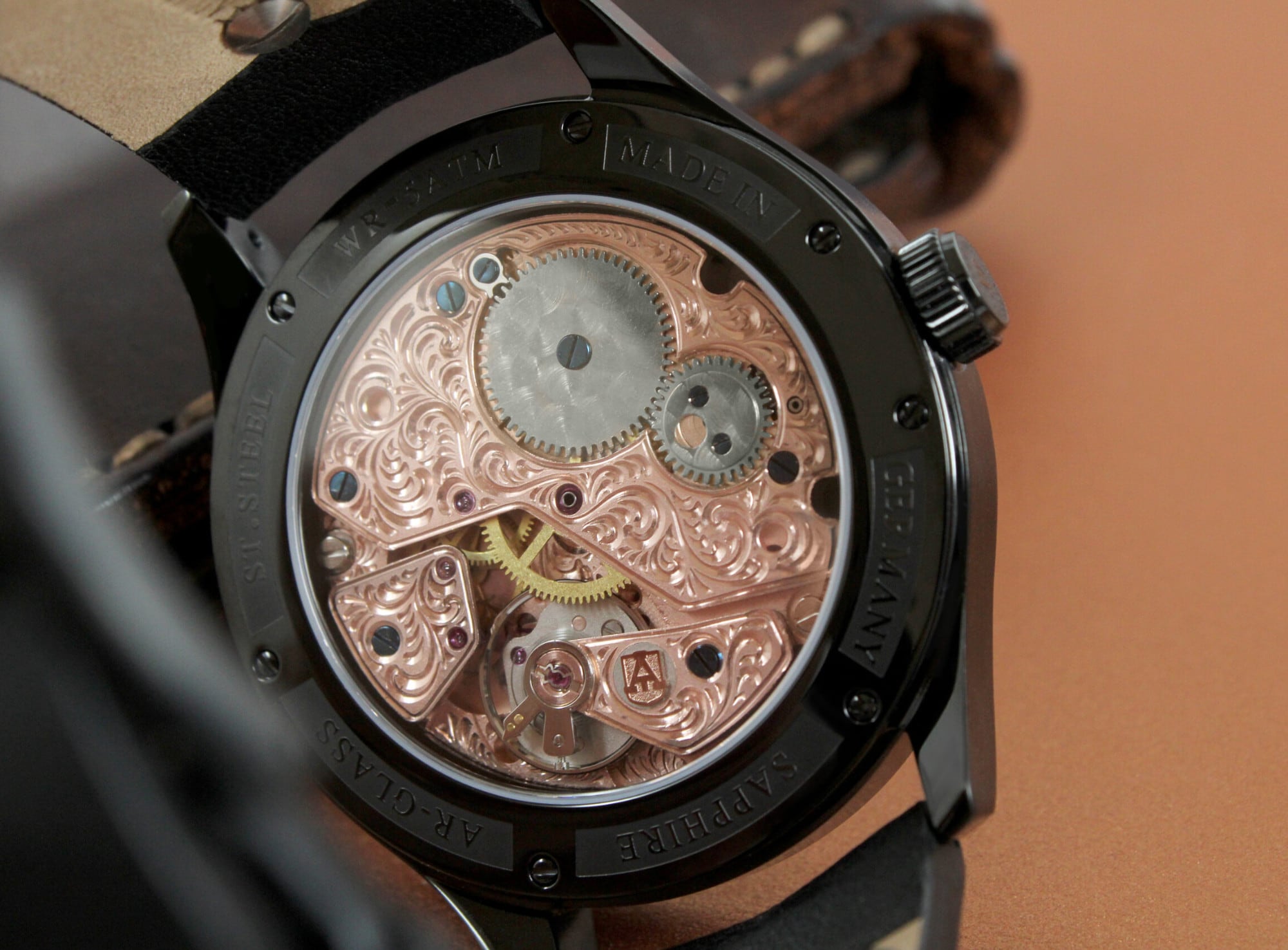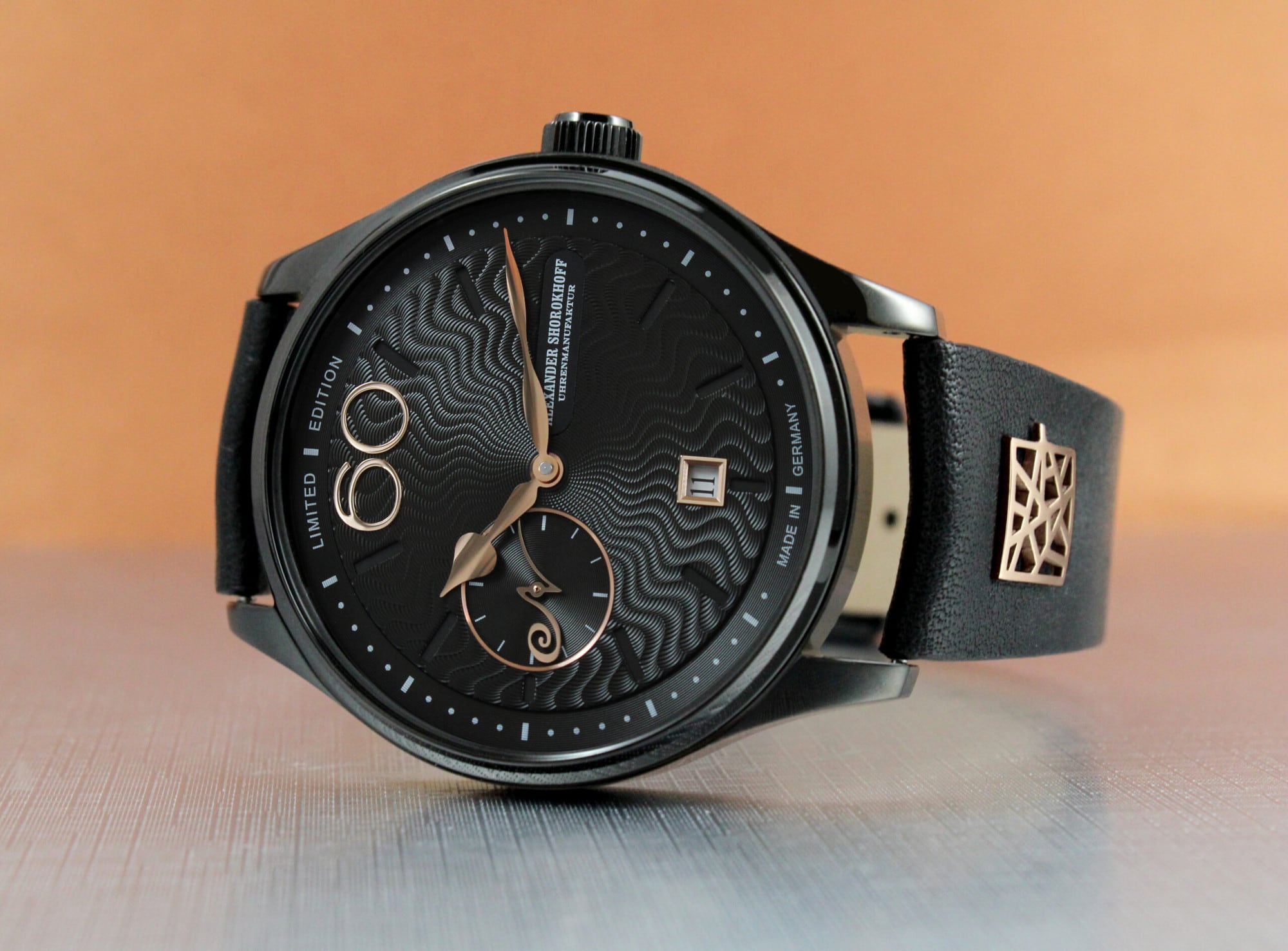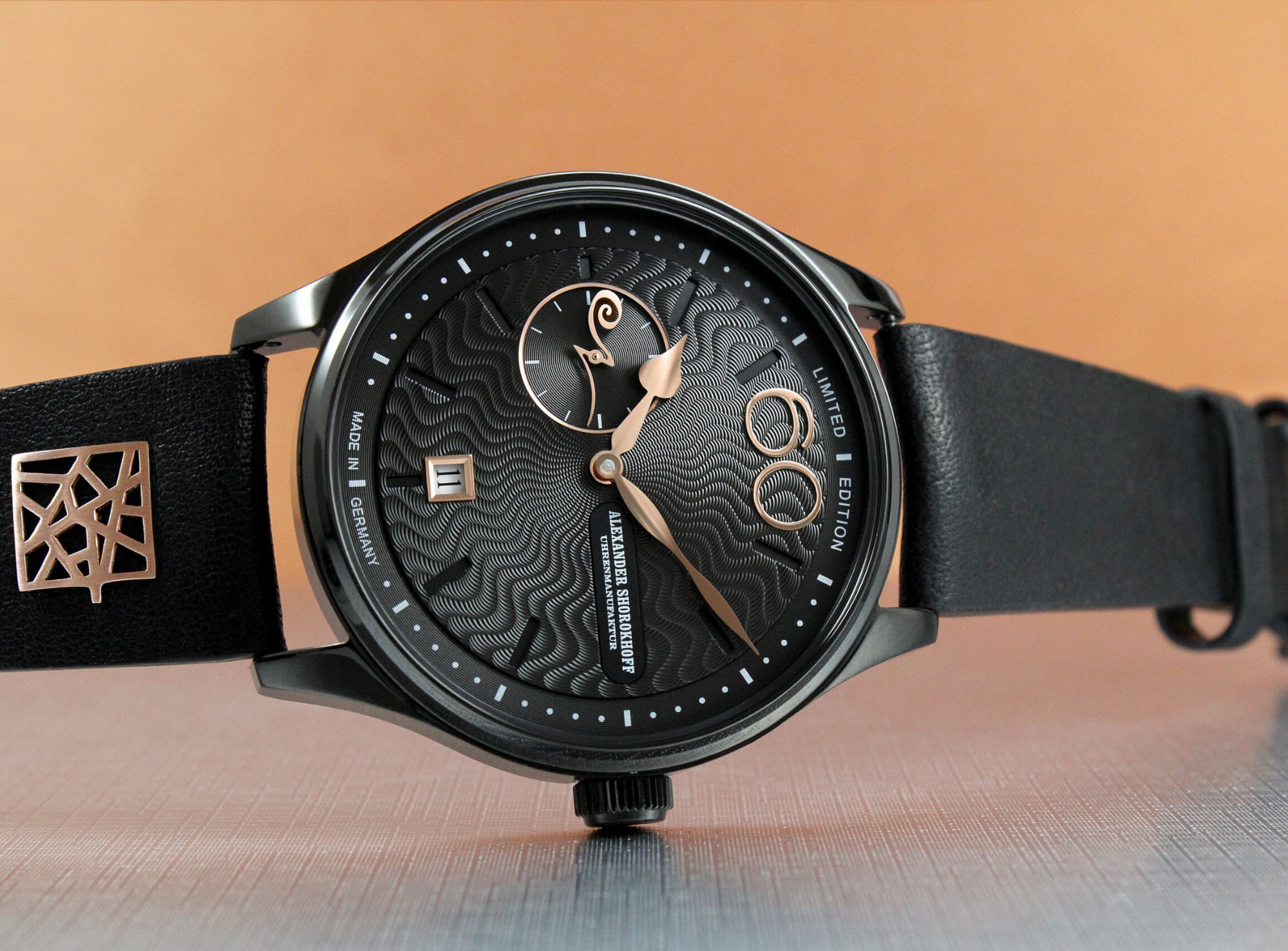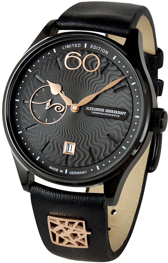 At the heart of these masterpieces beats the Russian caliber 3105.Poljot, a descendant of the Swiss Valjoux caliber 7734, though without the chronograph function. This movement is completely overhauled, re-oiled, adjusted, tested, and meticulously hand-engraved at the “Alexander Shorokhoff” watch manufactory. Polished and blued screws complete the movement, which can be admired through the sapphire crystal case back. As these movements are no longer produced, the manufactory has secured a limited quantity and produces this series in a small, limited edition: The rose gold variant is limited to only 9 pieces, while the sporty-elegant black IP-coated variant is limited to 30 pieces.
