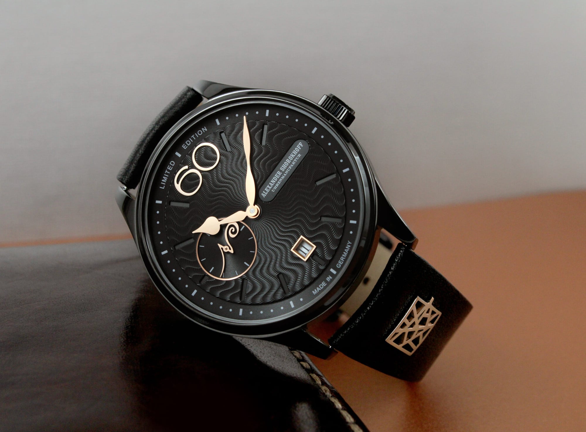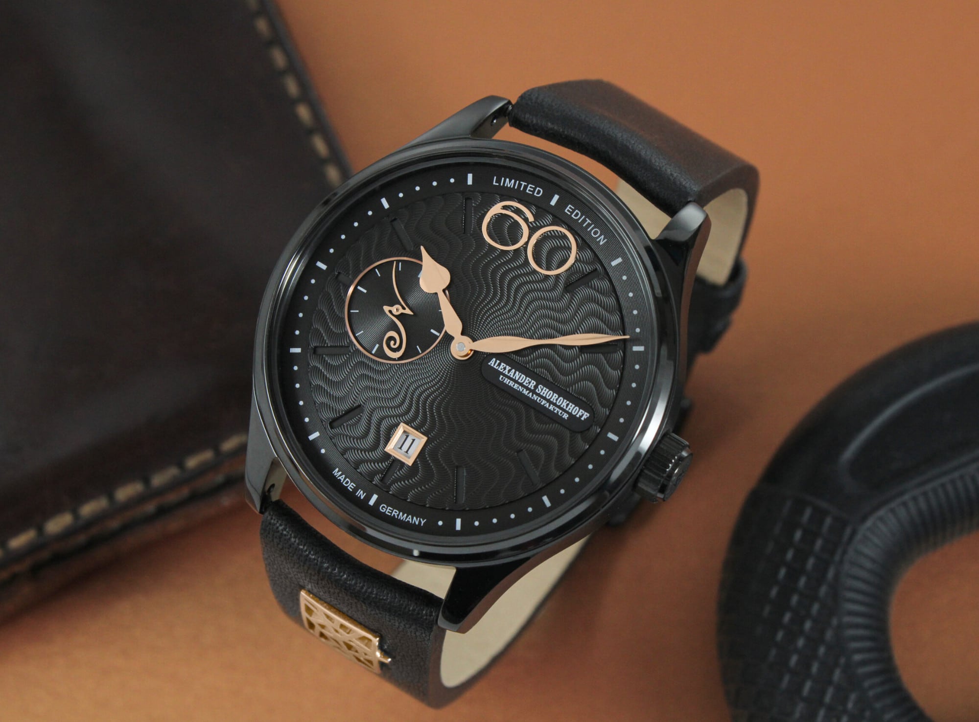 The stainless steel case of the first variant is black IP-coated, while the second variant shines with a rose gold IP-coating. Both case variants imbue the watch with a sense of mystery and allure. Rose gold hands, the date window, and the distinctive large number “60” shine on the black dial, adding gleaming accents.