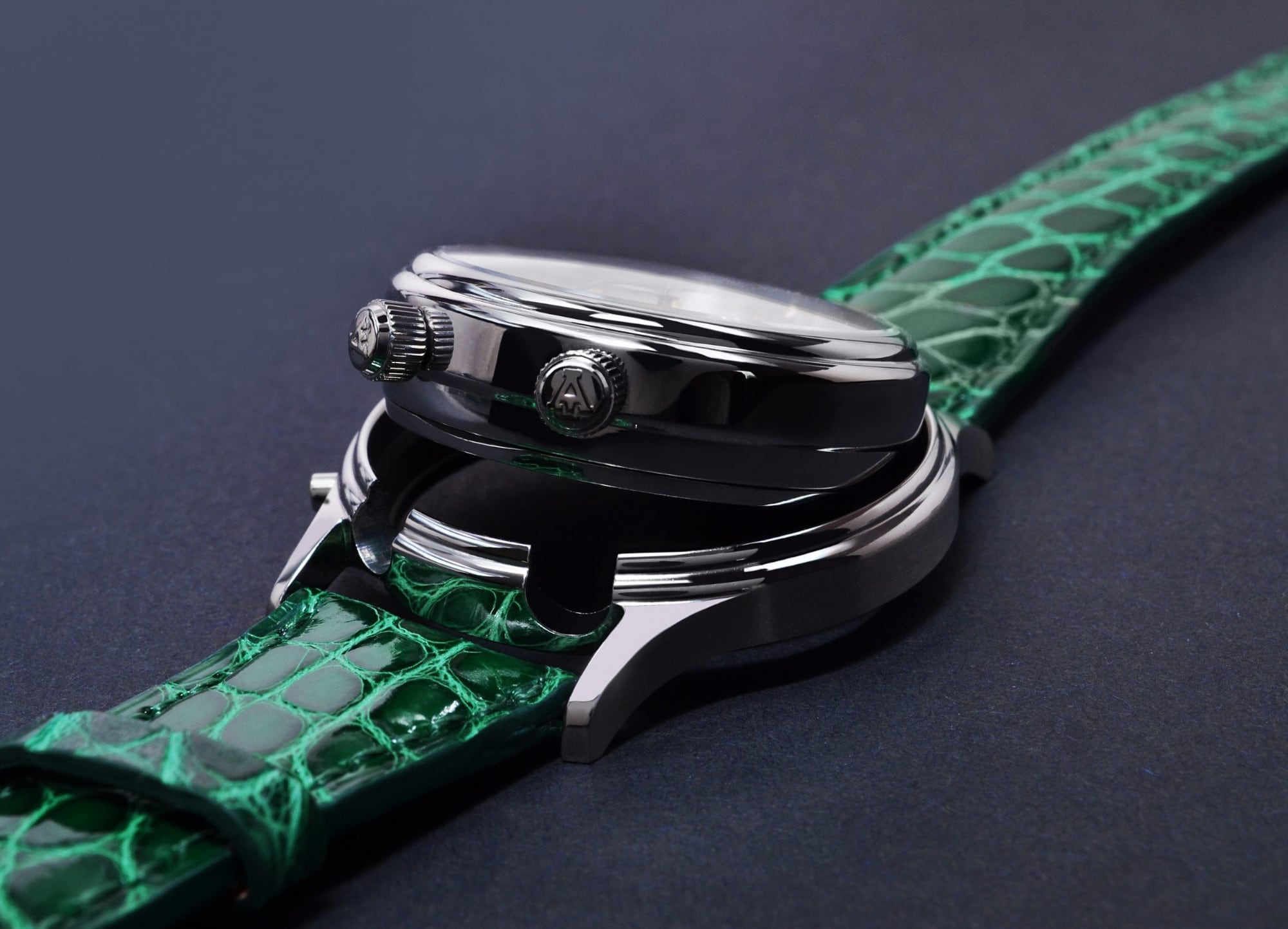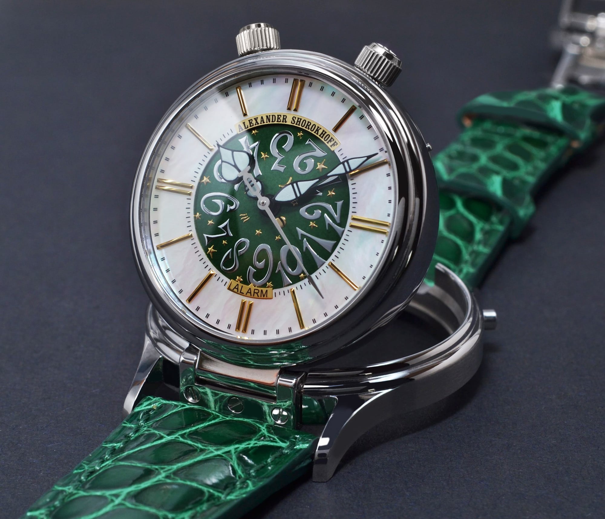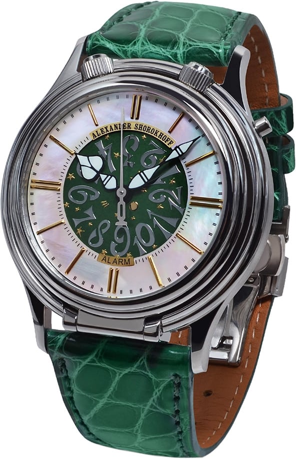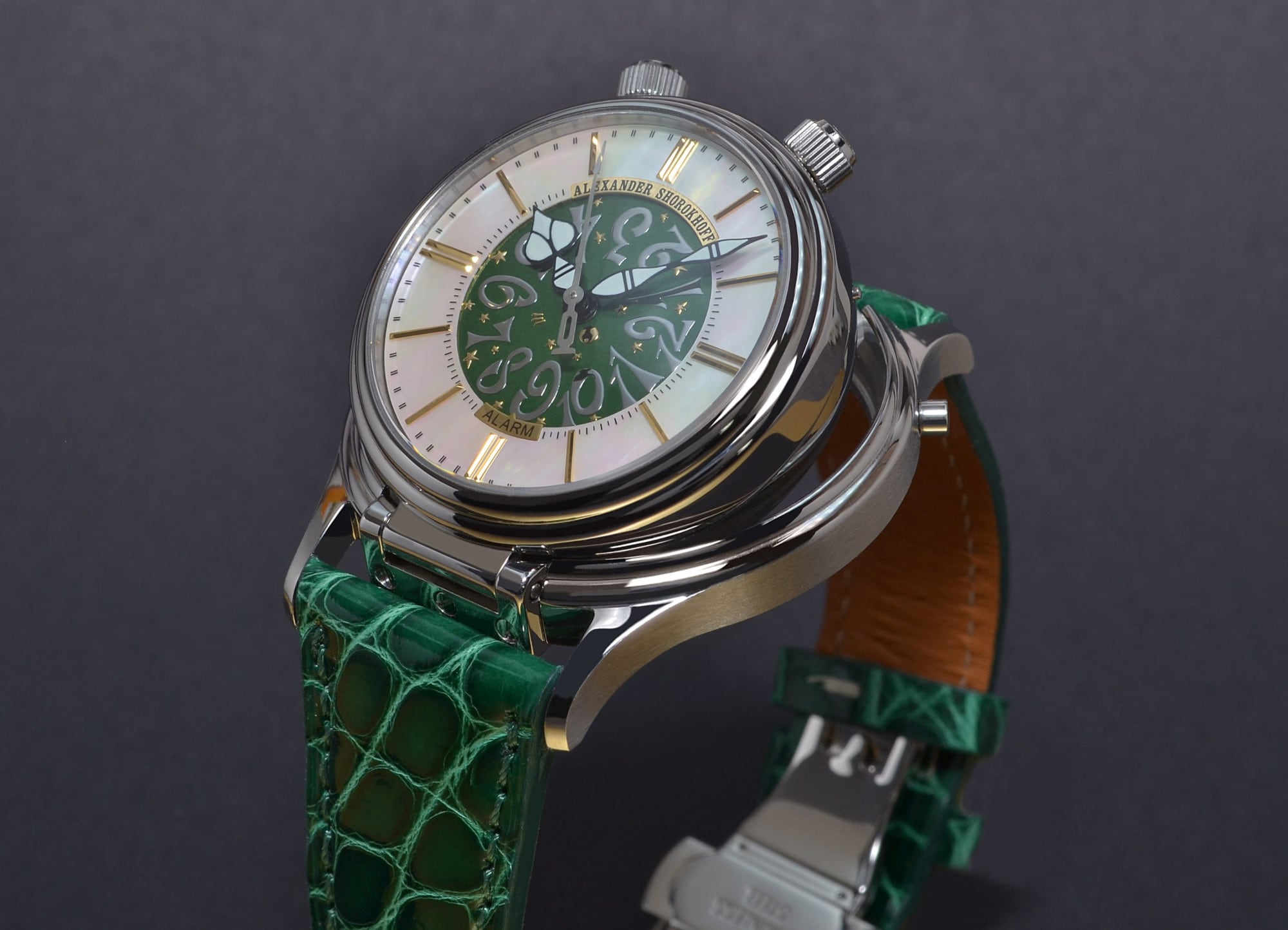 The dials are available in different versions. The outer area of the dial of the green variant embodies the softness of the watch with a light mother-of-pearl, while the inner alarm disc shines in a rich green. Other colors in blue and red will follow. The hour and minute hands were designed in the usual “Alexander Shorokhoff” style with luminous material, so that the time can be easily read even at night. The gold-plated hour appliqués emphasize the glamorous watch.