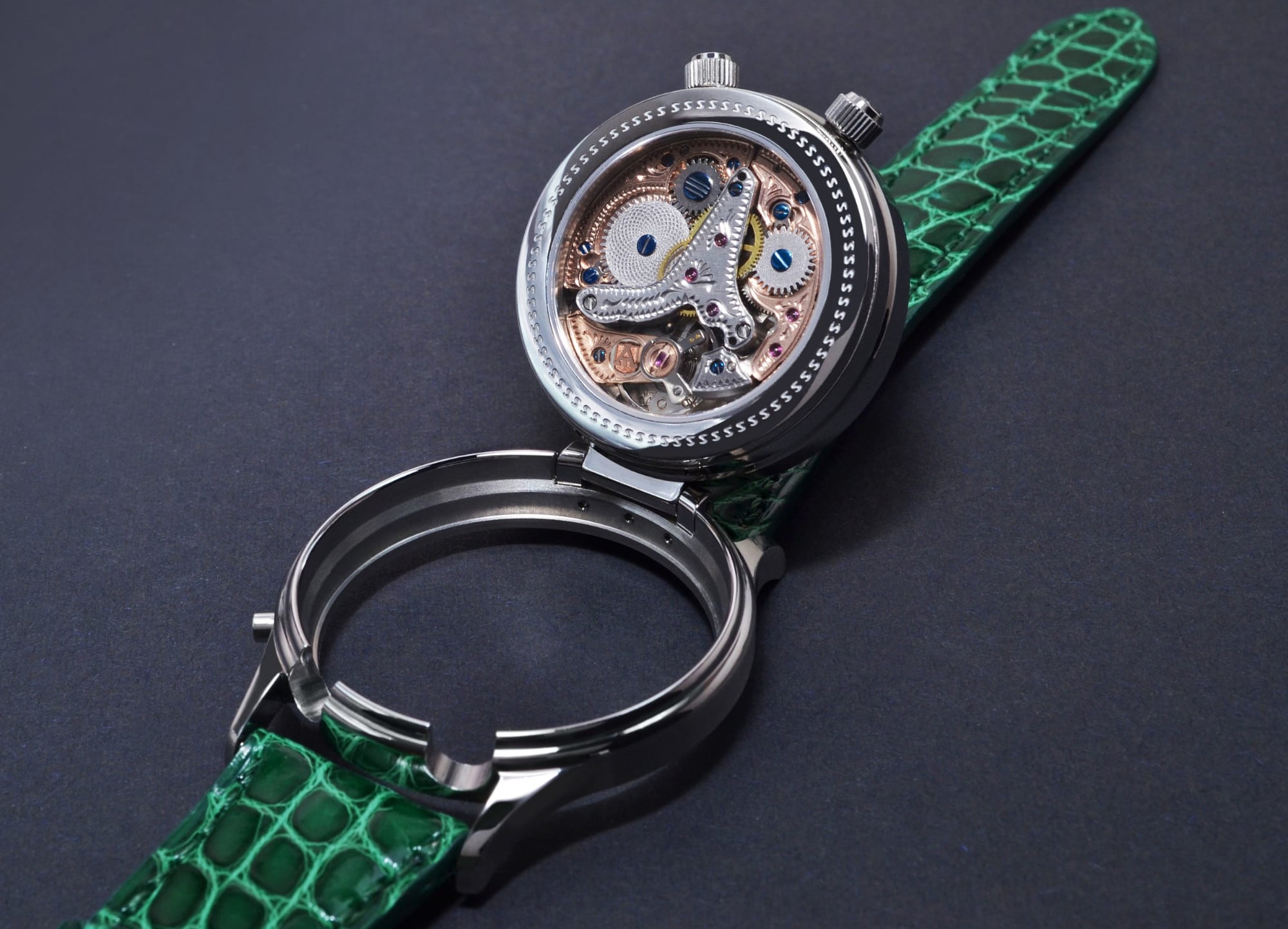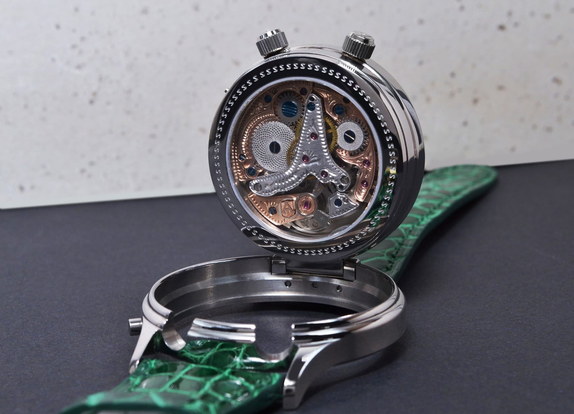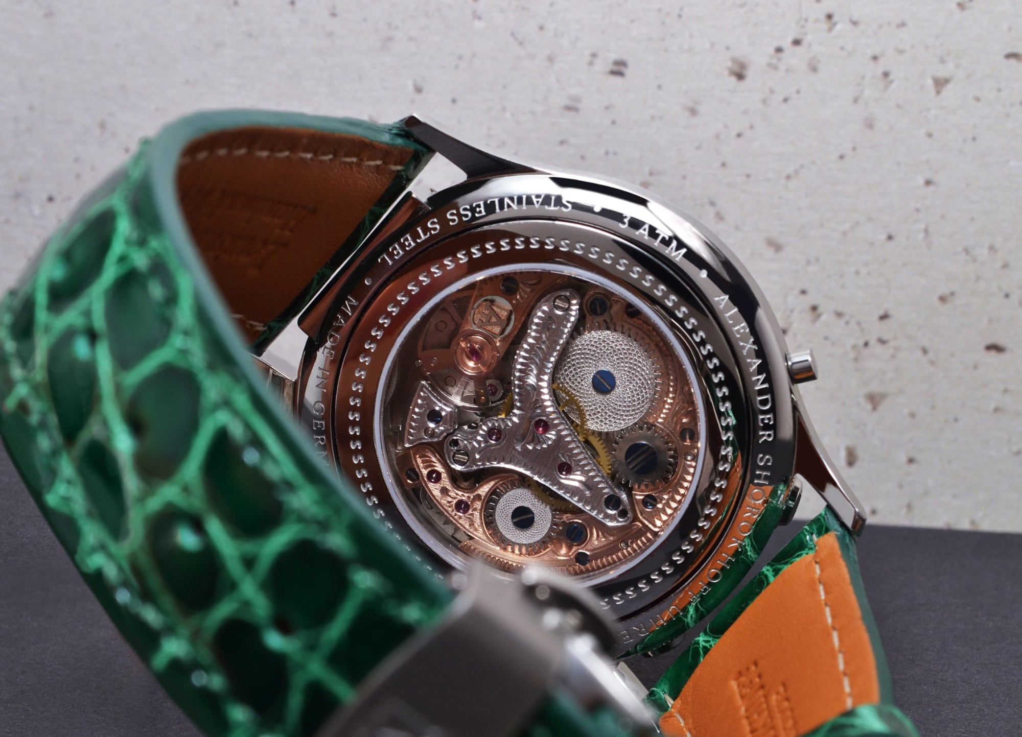 The engravers of the “Alexander Shorokhoff” watch manufactory have also done a great job with the finishing of the movement. The movement has been imaginatively engraved and valuably refined. Traditionally engraved motifs of the bridges, as well as the guilloché of the cogs create a nostalgic feeling. After engraving and polishing, all bridges are gold-plated or rhodium-plated, as well as the screws are blued to give the movement a particularly beautiful look. Little by little, a fantastic little work of art is created, which can be admired in all its beauty through a sapphire crystal case back.
