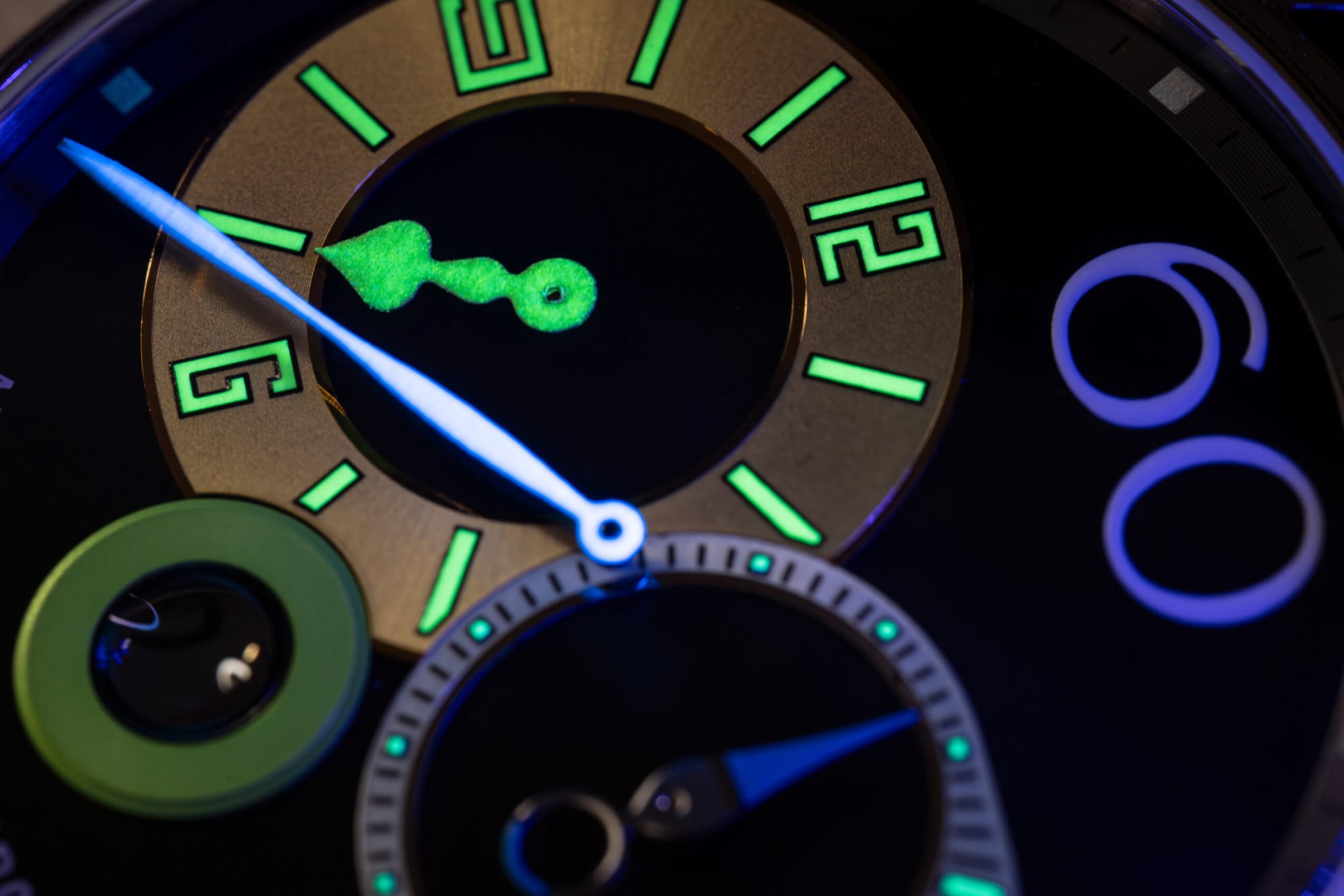 The hour display is also equipped with luminous paint, which is not only visible during the day but also allows for clear time reading at night or in low-light conditions. The green luminescence not only gives the watch a modern and futuristic appearance but also serves a practical purpose by ensuring the time is easily and distinctly visible around the clock.