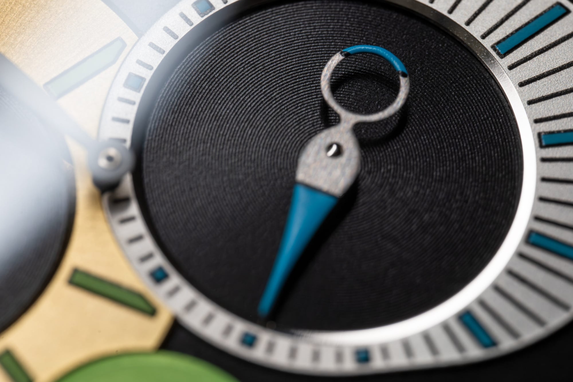 The hour display, in a rich green hue, appears at 9 o’clock, while the seconds are counted in radiant white along the outer minute ring. The minutes, presented in a vibrant blue, are found at 3 o’clock. This design not only ensures precise time reading but also provides a distinct color scheme that clearly distinguishes the various time elements. The unique color combination exudes modernity and innovation while simultaneously celebrating the time-honored craftsmanship of watchmaking.