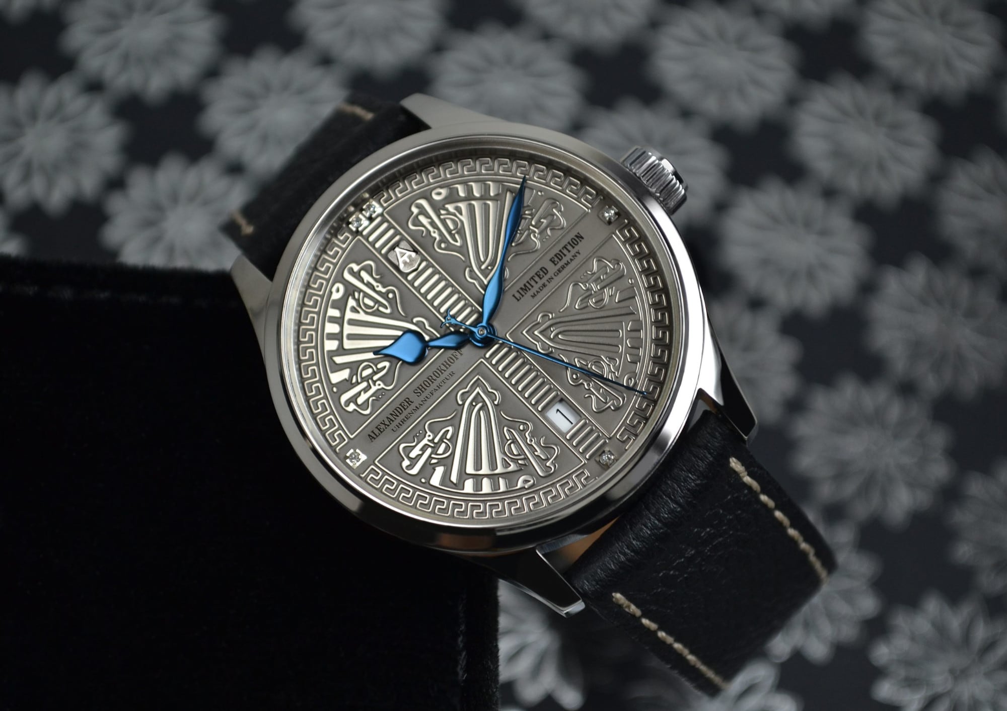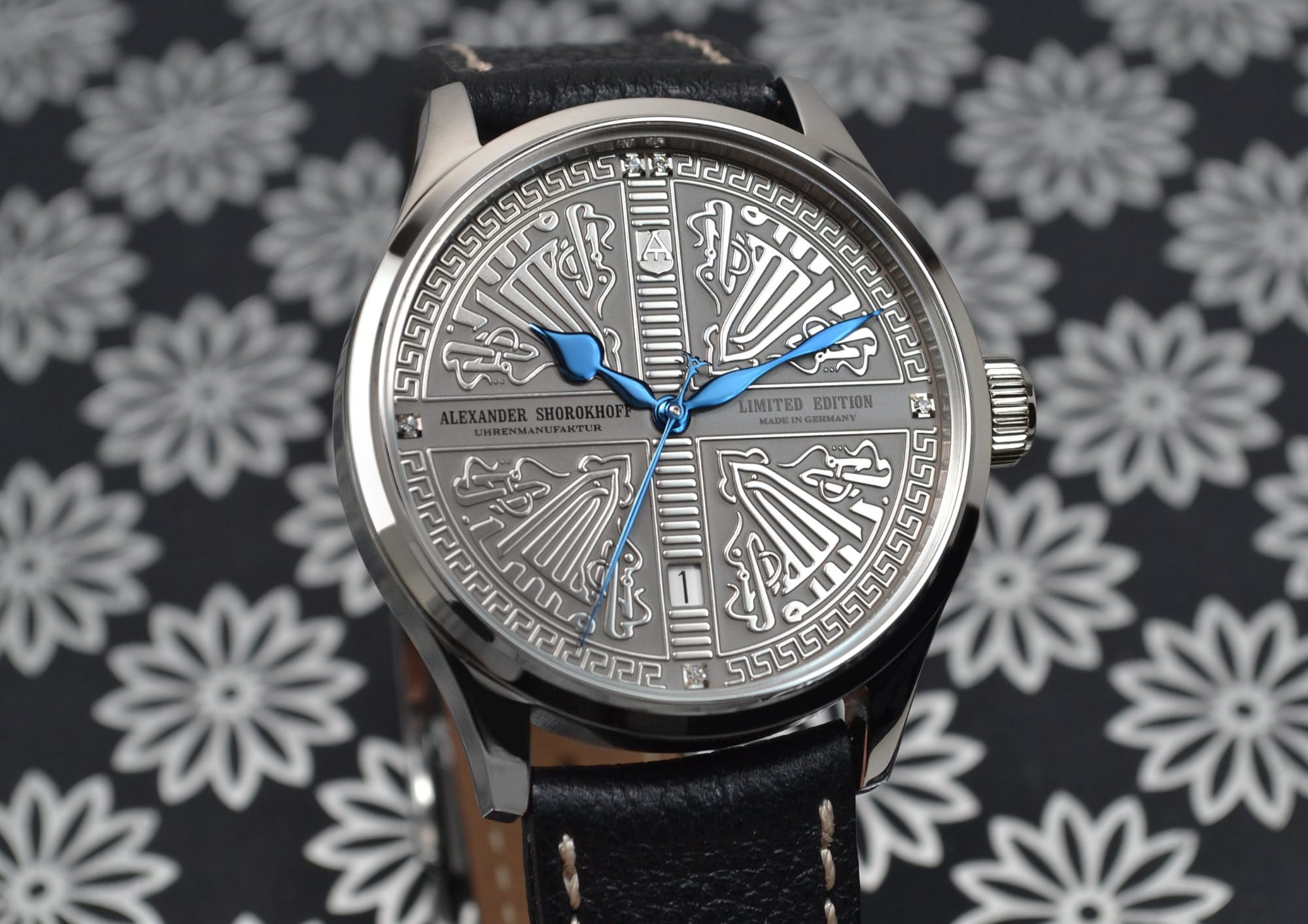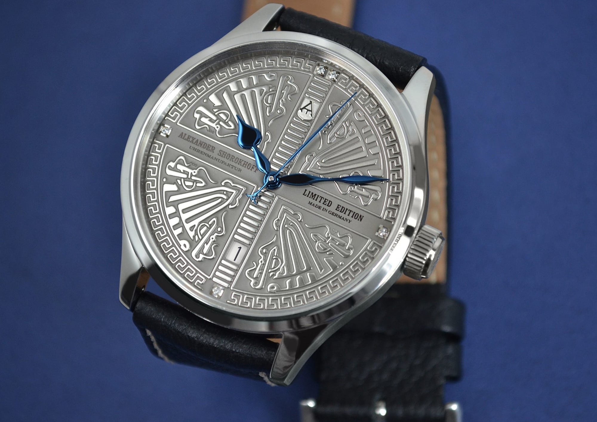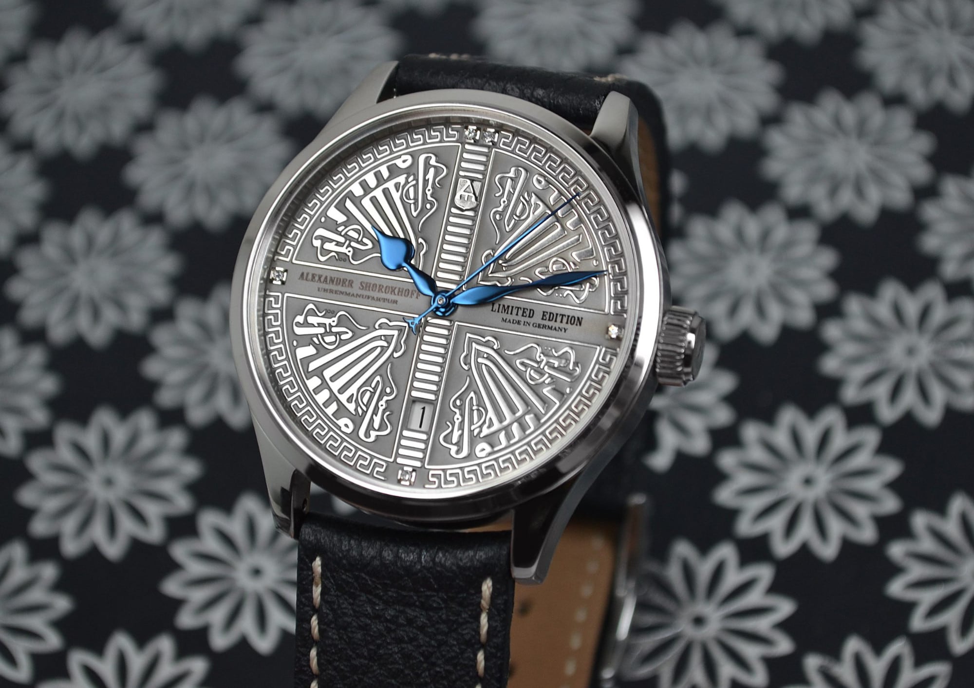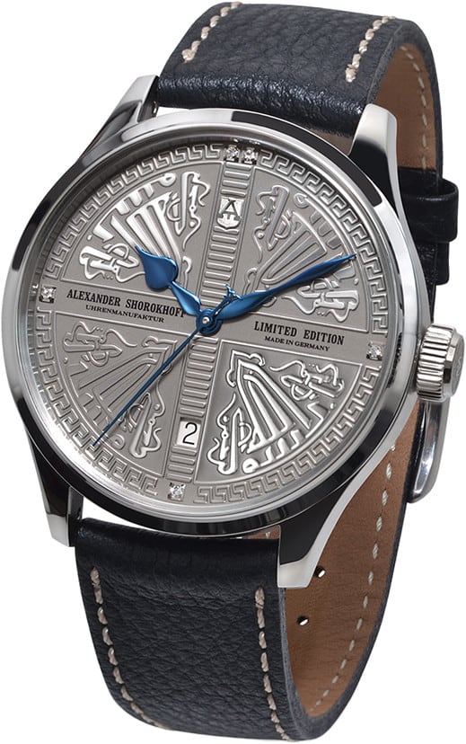 The ornaments gathered from Arabic calligraphy present themselves in a new interpretation. The dial is divided into four sectors, surrounded by a meander – a motif from the art of ancient Greece.