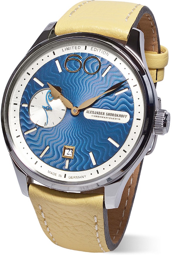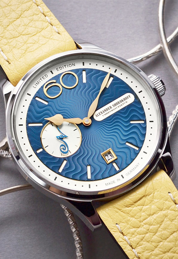 Enchanting and stylish, magical and aesthetic: the new NEVA by “Alexander Shorokhoff”. The new NEVA by Alexander Shorokhoff. The wavy guilloche on the dial is inspired by the migty and most water-rich European river Neva. The small, curved second hand is shaped like the letter “N” and thus refers to the name of the clock and the magnificence of the city through its curved shape.