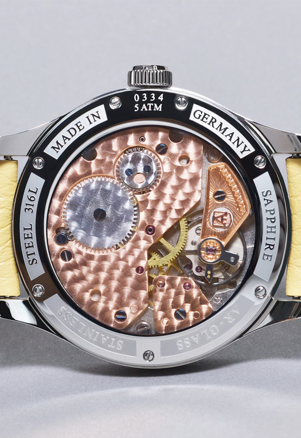 For the movement, the Russian caliber 3105.Poljot is used, which is derived from the Swiss Valjoux caliber 7734, but without chronograph function. The movement is completely overhauled, re-oiled, adjusted and tested at the “Alexander Shorokhoff” watch manufacture. The bridges, as always with “Alexander Shorokhoff” brand watches, are hand-engraved or cloud-cut, and the screws are polished and blued. This beauty can be viewed through the sapphire crystal bath. These movements are no longer reproduced today. However, the “Alexander Shorokhoff” watch manufactory has secured a limited quantity and produces this series in a small limited number.