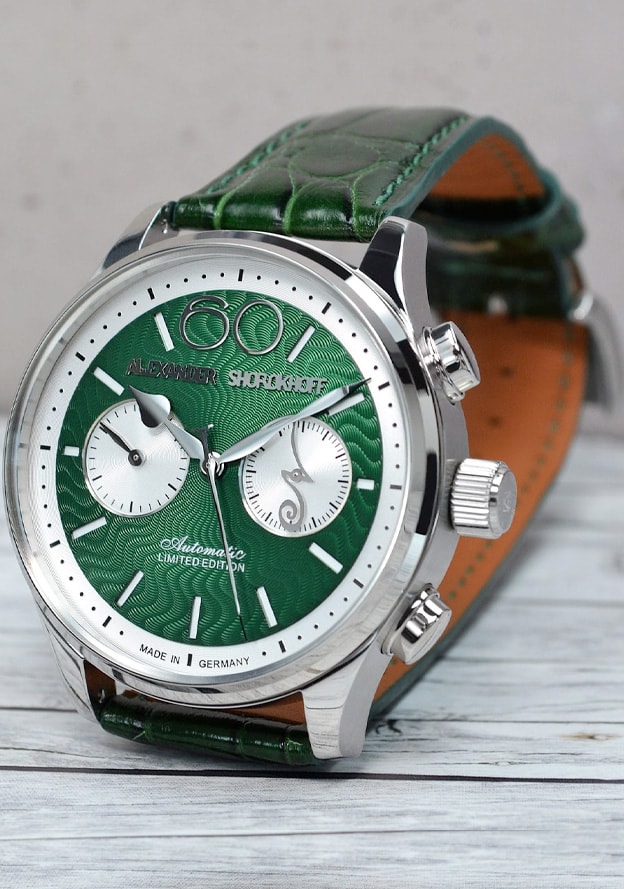From this inspiration the wavy guilloché dial was created and the new model included a colorful palette of many different finishes with dials in blue, yellow, red, silver and green. These new NEVA models established themselves as the perfect entry level models for a high quality mechanical watch from Alexander Shorokhoff.