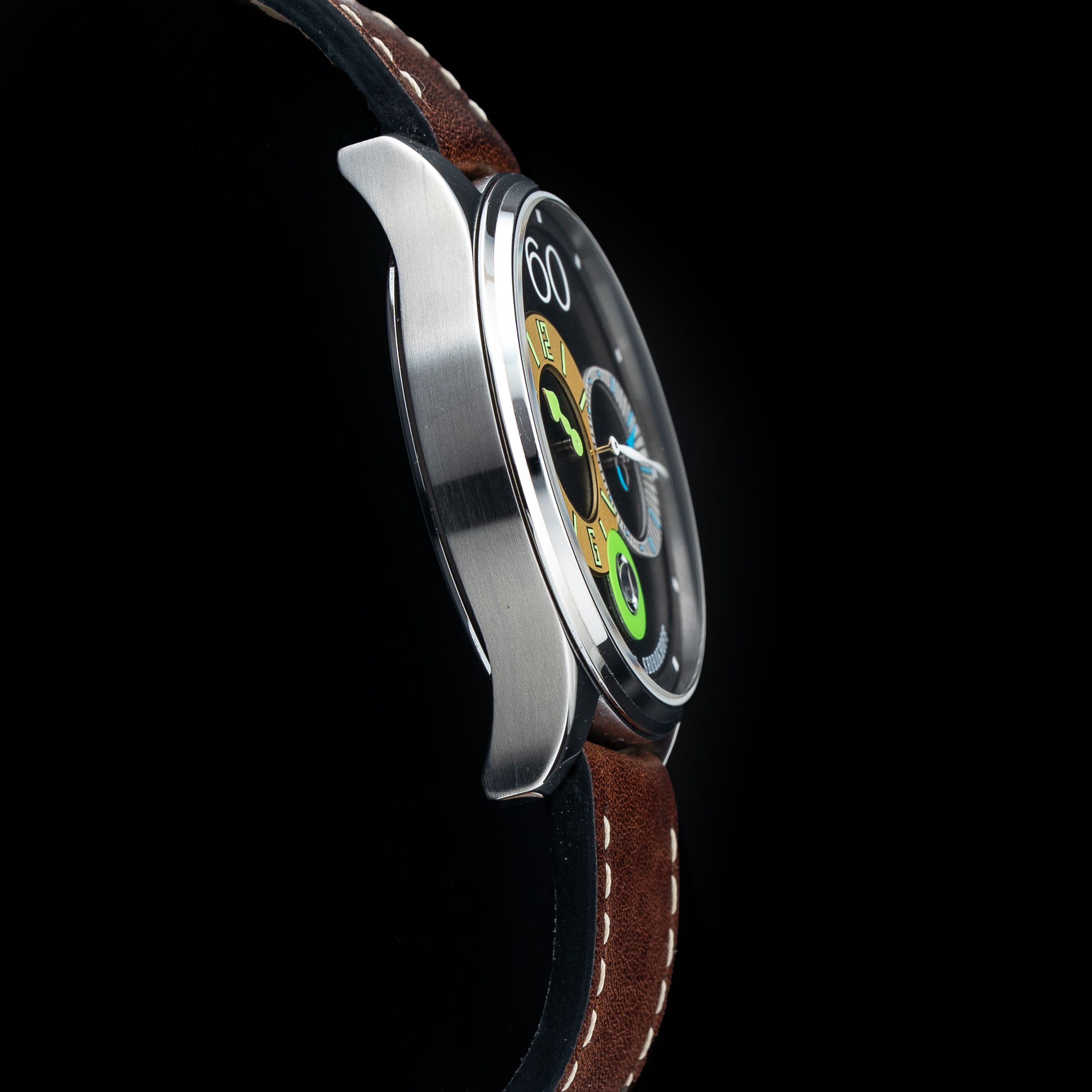 This watch features a 43mm stainless steel case on leather strap. This watch also sports a black dial. Powered by an autoamtic movement. Water resistance up to 50 meters.