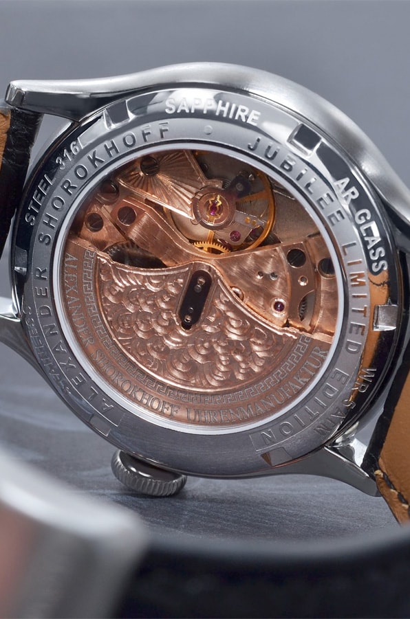 The movement is the Poljot caliber 2616.2H, which was first introduced in 1972. It has a diameter of 26 mm, with the rotor overhanging the movement by another 1.5 mm, resulting in a diameter of 27.5 mm. The movement also features a date mechanism, albeit not a simple one, but an instantaneous date change, implemented by a lever. It is completely disassembled, engraved, refined, re-oiled, assembled, adjusted and certified at the Alexander Shorokhoff Manufacture. After that, you get a mechanical beauty that can be viewed through the sapphire crystal caseback.