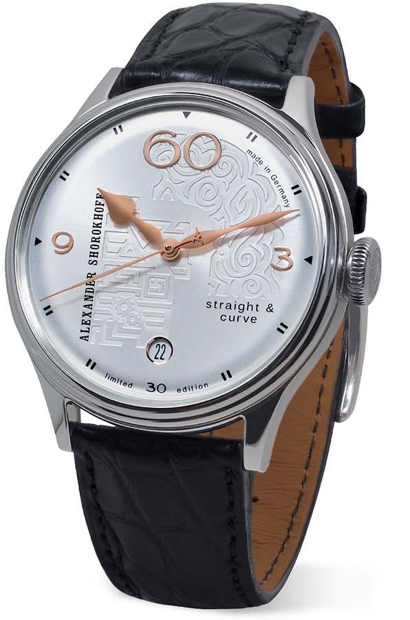 And that’s exactly what you see in his latest creation, the “Straight & Curve”. The model combines exactly these straight lines with the curved ones in a harmonious appearance. The entire dial is not obtrusive and cluttered, but playfully manages to combine the two elements as the main actors of the dial. They unconsciously set the tone of this elegant automatic watch. The curved line patterns meander to match the shape of the dial in the upper right area of the dial, while the straight lines find their place to the left of the “Alexander Shorokhoff” lettering. They exude a certain contrarian harmony, and that’s what makes the watch so special.