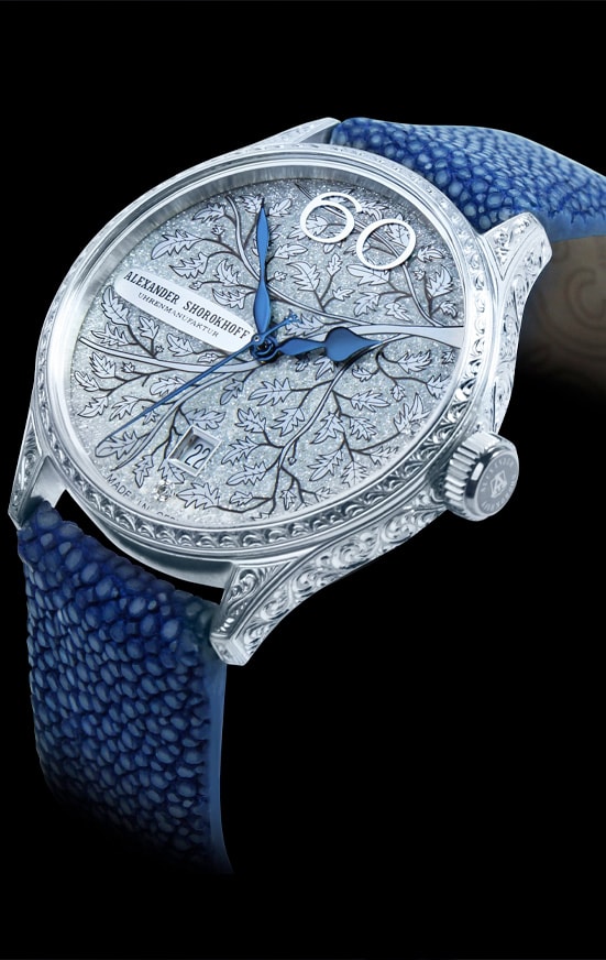 The hand-engraved and embellished rotor of the automatic movement perfectly complements the hand-engraved 925 silver case, sized at 39 millimeters. The double-sided sapphire glass underscores the high standards of the Alexander Shorokhoff watch manufacture.