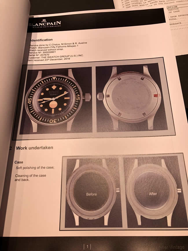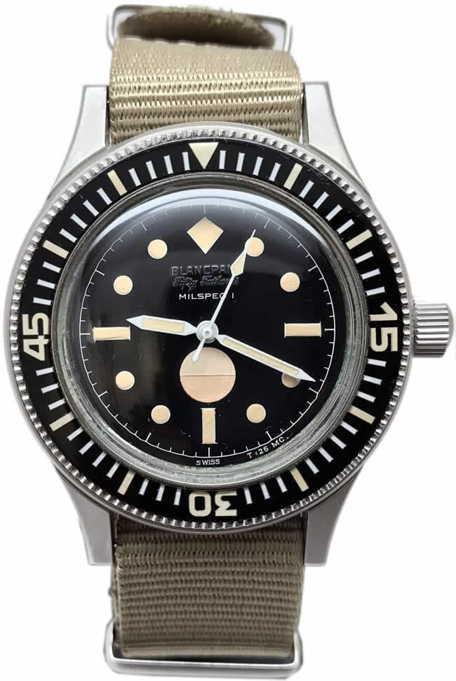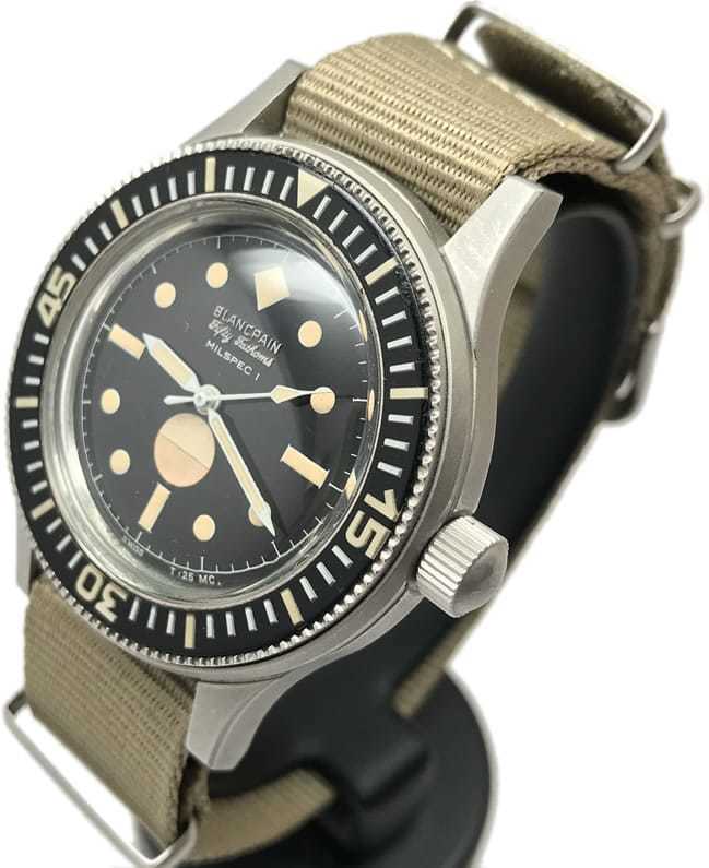 This Fifty Fathoms is known as a Civilian or Demo Milspec 1. There were only about 20 known pieces made globally which makes this extremely rare. The condition of the watch is very close to perfect and still has about a 1 year warranty on movement through Blancpain. It was send back last year for a service and overhaul and the vintage watchmaker at Blancpain considered it to be a gem and stated it is very hard to come across especially in this condition. All of the parts on the watch are original and not damaged or replaced from about 1967. The watch will come with the bill from the service which was $2,500, a certificate of authenticity, and also a full photo timeline/booklet showing more than 10 photos of the movement as well as description of what was done to the watch. The NATO strap is also original and came from the vintage watchmakers personal collection.