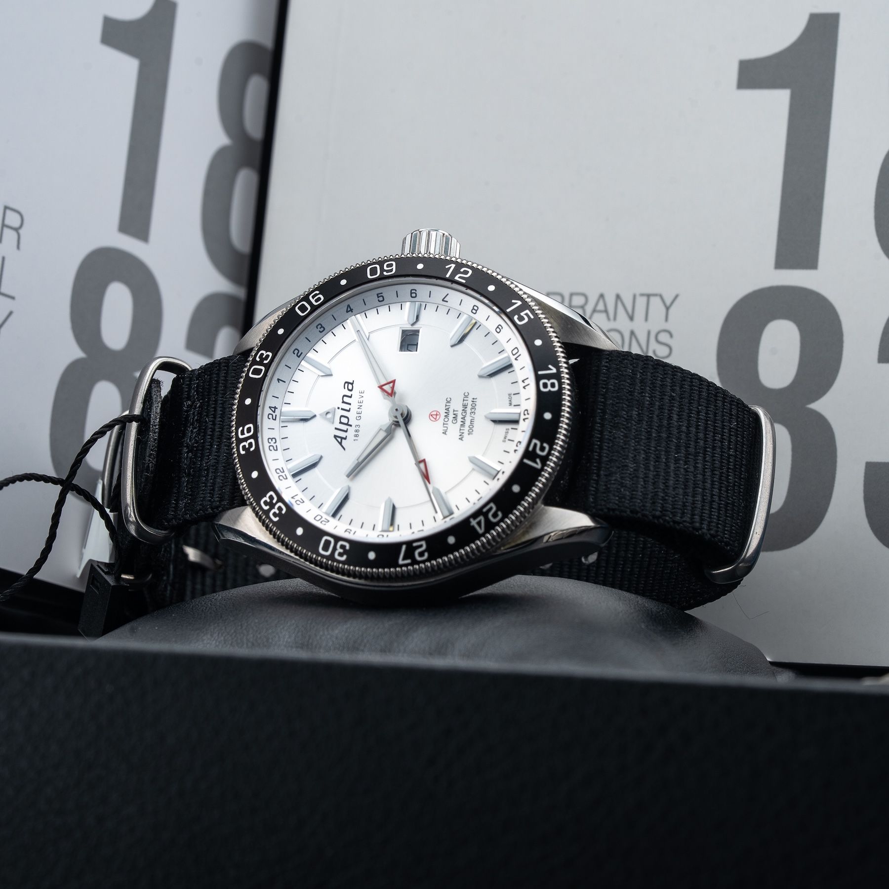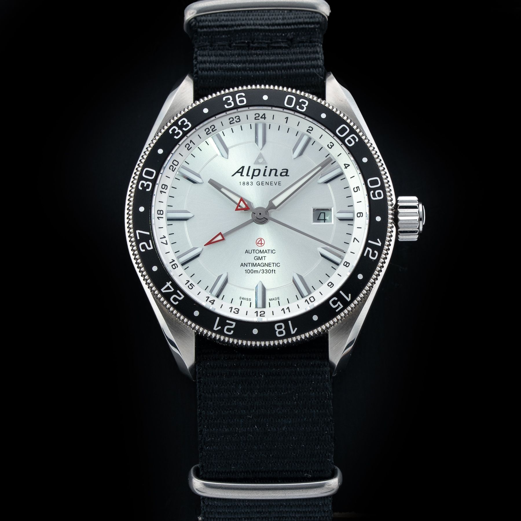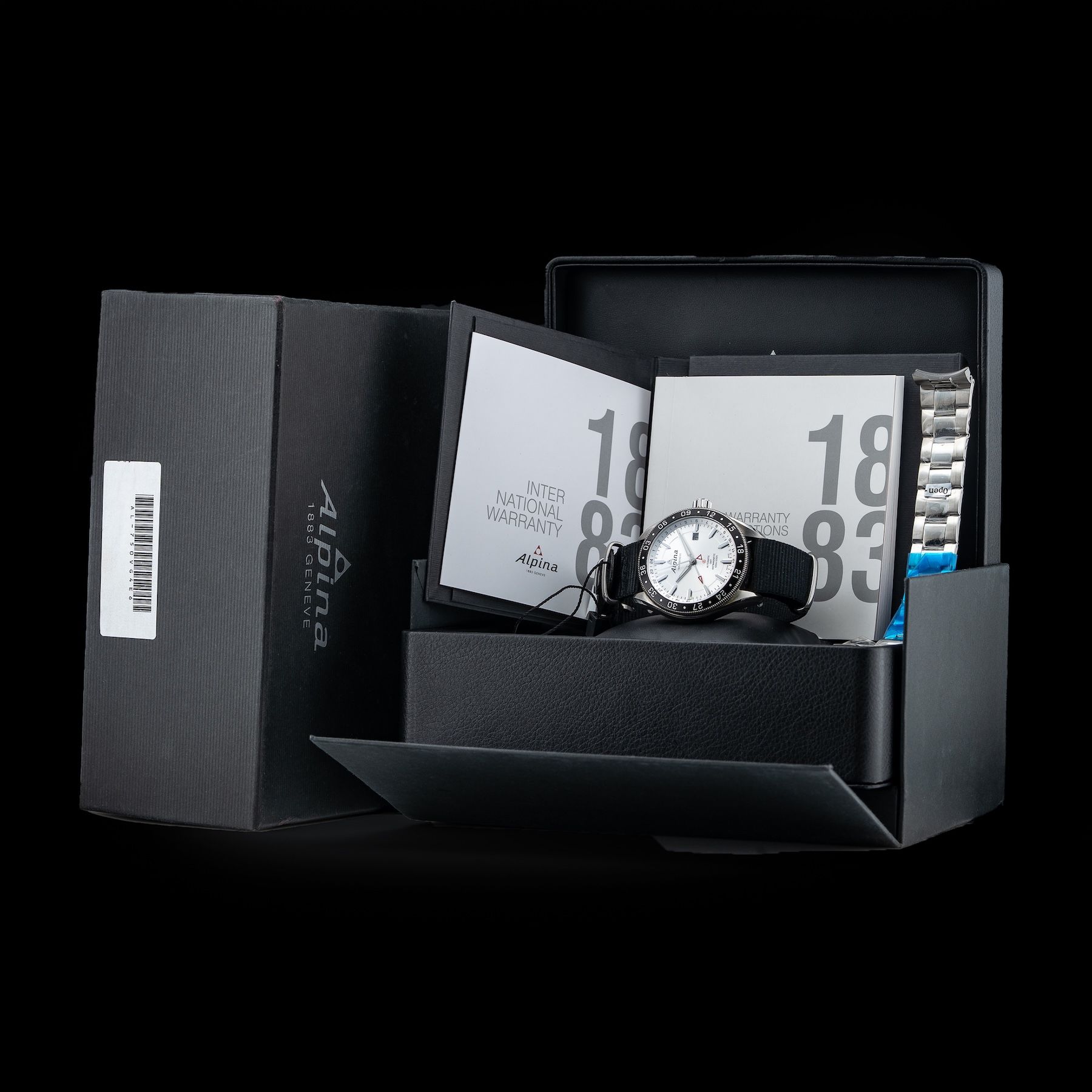 This Alpina AL-550X5AQ6 Alpiner 4 GMT is in GREAT condition. This watch includes its Original Box, Original Papers and Warranty Card Not Dated, Extra Bracelet. This watch has been fully authenticated and certified by Exquisite Timepieces. Please note, the photos shown are of the actual watch you will receive.