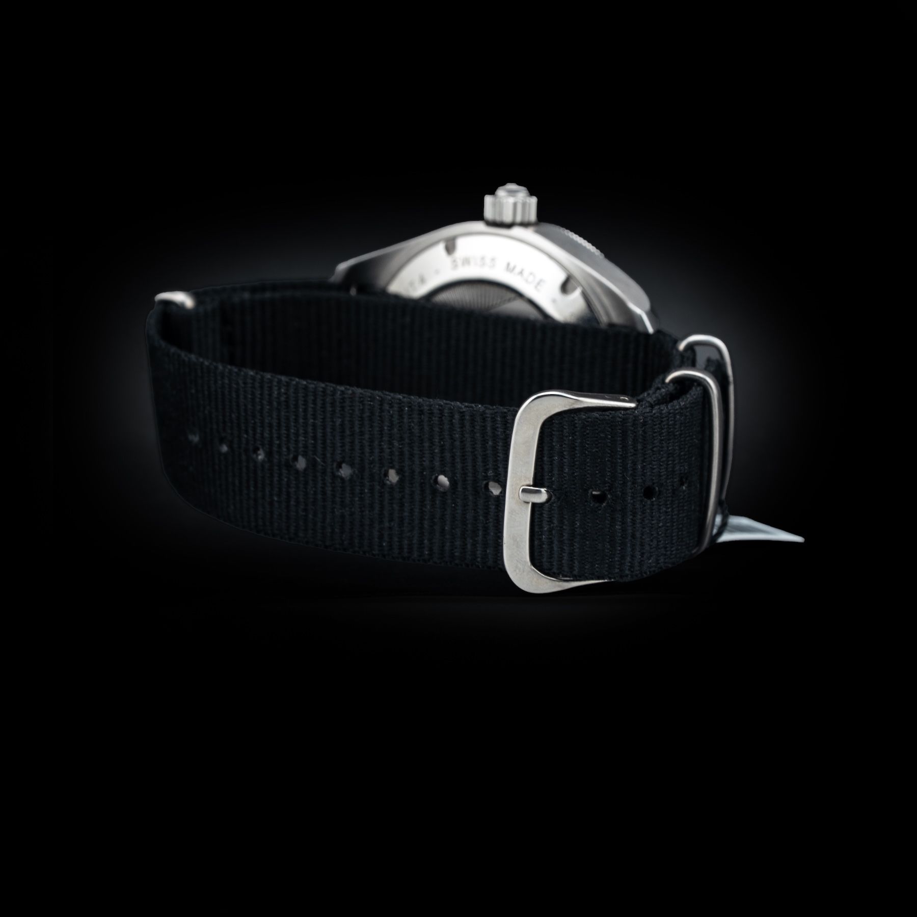 This watch features a 44mm stainless steel case on nylon strap. This watch also sports a silver sunray dial. Powered by a self-winding mechanical movement. Water resistance up to 100 meters.