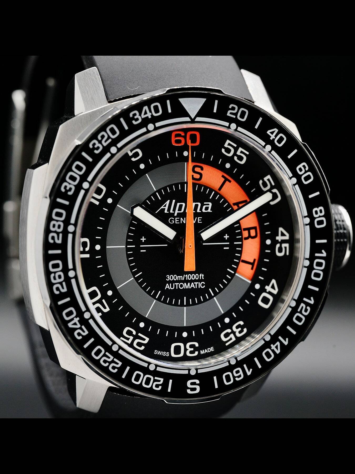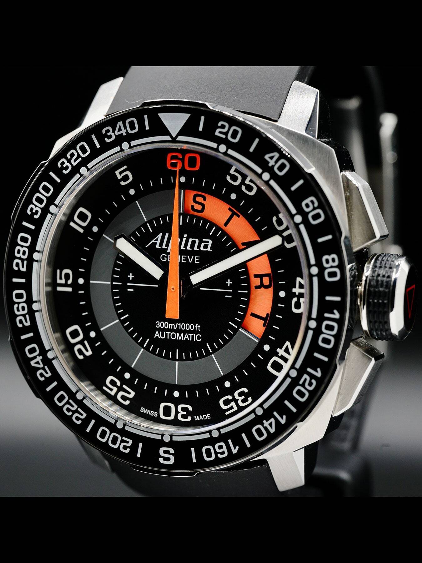 This is the highest end watch Alpina Makes. Using its all Swiss in-house movement AL880. At the start of 2013 Alpina introduced a new model in the Sailing Collection: the Alpina Sailing Yachttimer Countdown. This model has a countdown window from 12 o’clock to 4 o’clock, with the indicator disk changing from 10 to 1 and leading to the fluorescent START indicator. It has a 44mm case with 22mm lug width and 17mm case height. This is a seriously unique luxury watch. Limited edition and has been sold out for quite some time.