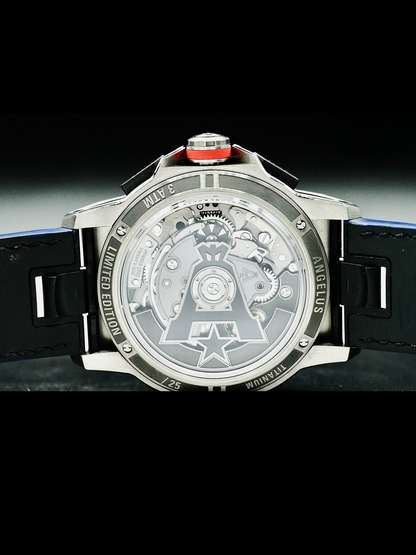 Mechanical Automatic movement powered by Angelus Caliber A-500. Water resistant up to 30 meters.