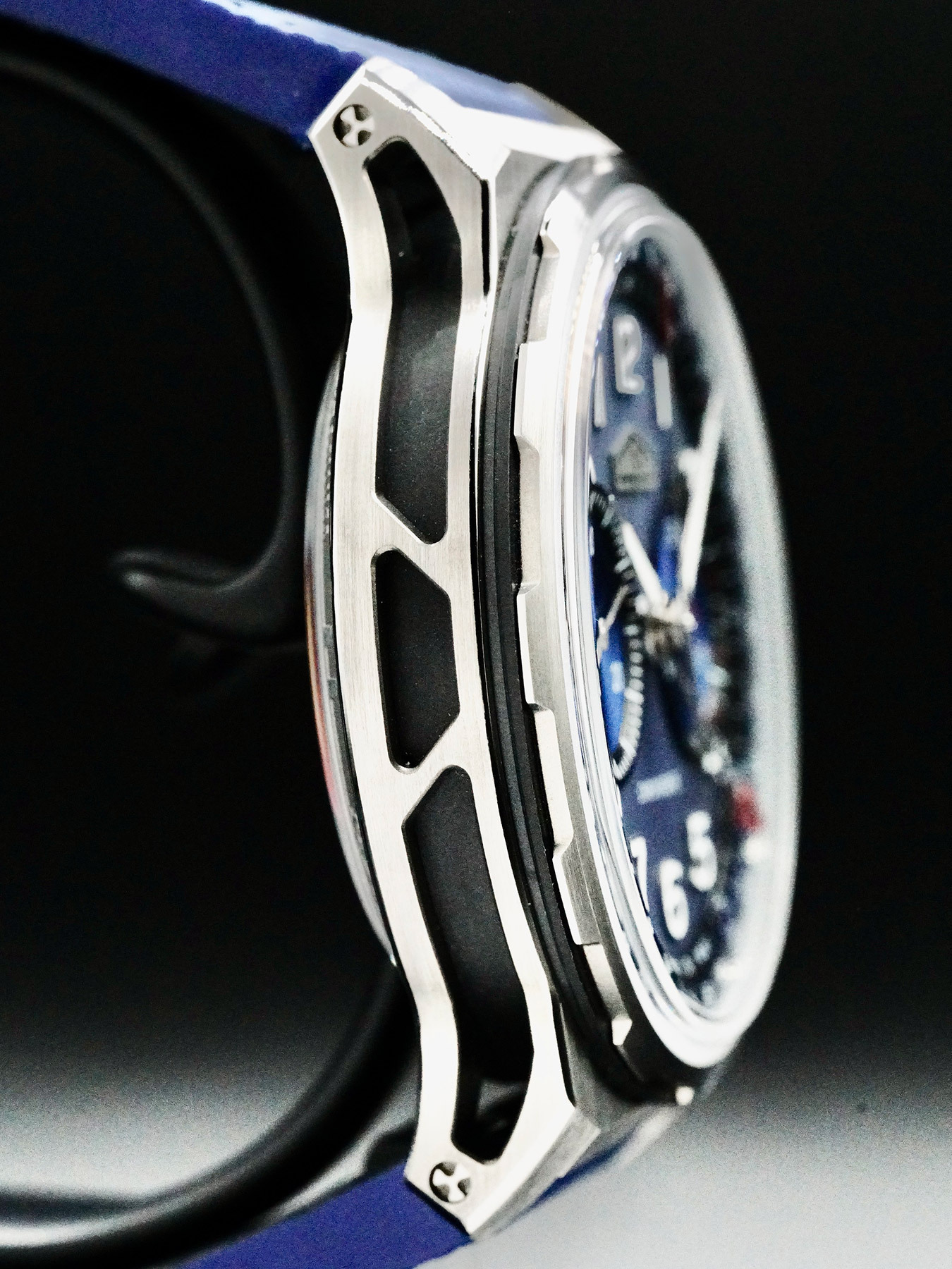 This Angelus Chronodate features a 42.5mm titanium case with a display case back on a blue rubber strap. This watch also sports a blue PVD, frosted centre dial with rhodium-plated applied details coated with white Super-LumiNova emitting a blue glow, black minute track, rhodium-plated applied logo, covered by scratch resistant sapphire crystal.