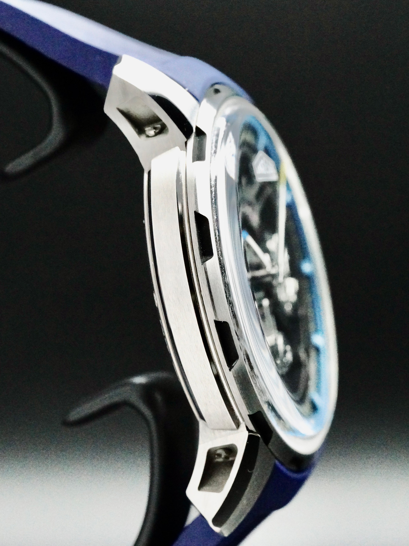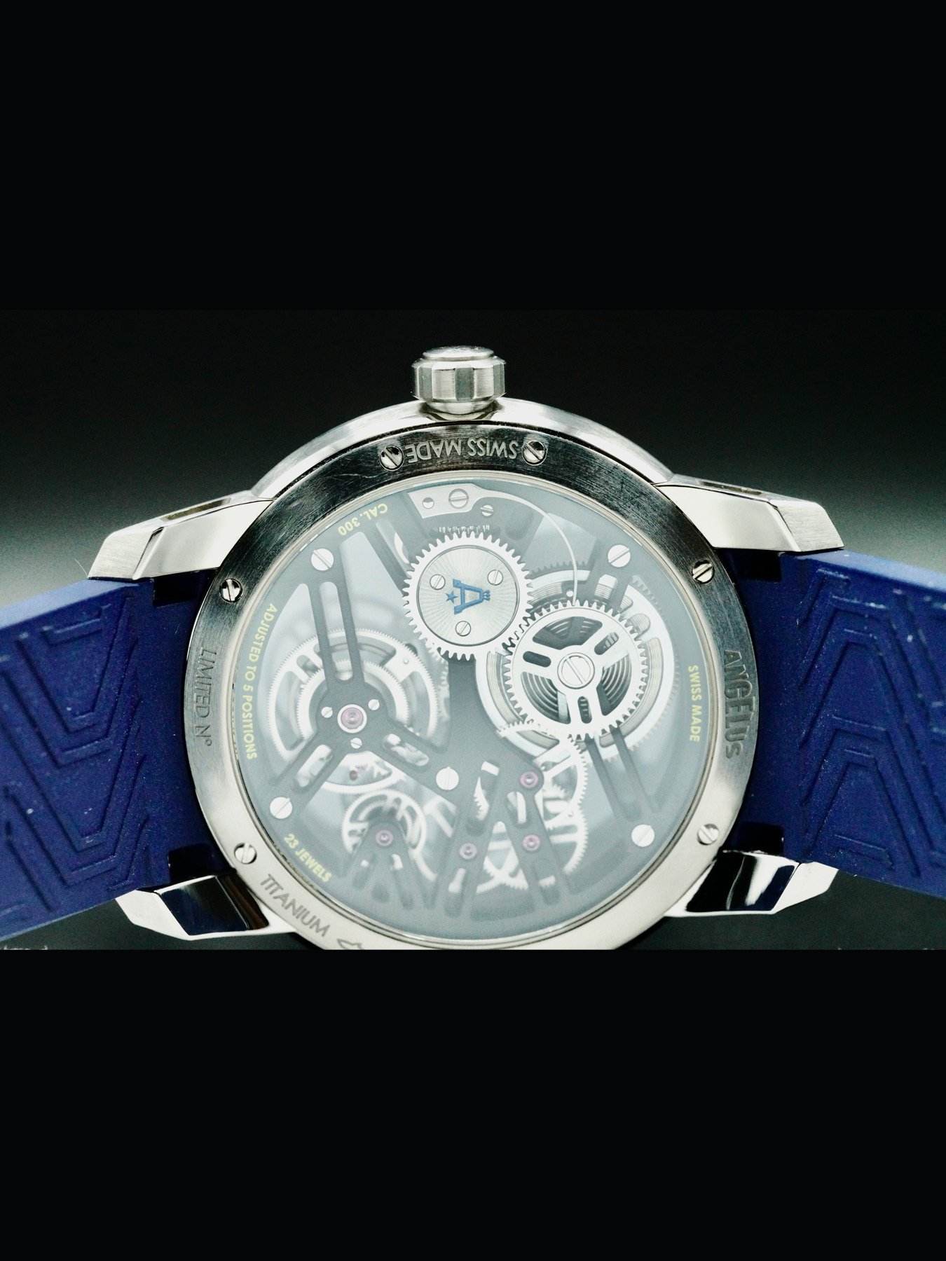 This Angelus U41 Blue Tourbillon Skeleton features a 42mm titanium case with a display case back on a blue rubber strap. This watch also sports a skeleton dial with luminous hands and index dial markers covered by scratch resistant sapphire crystal.