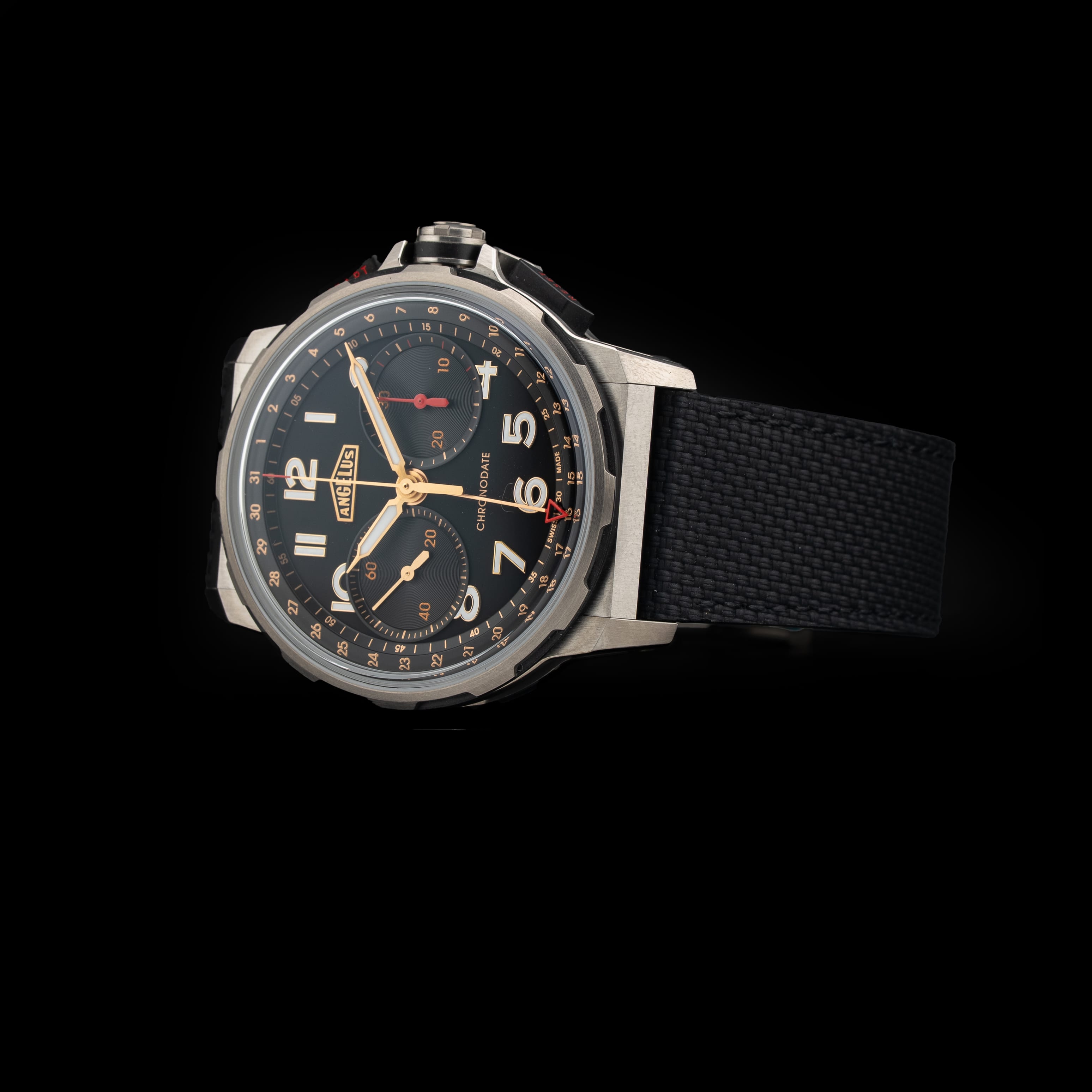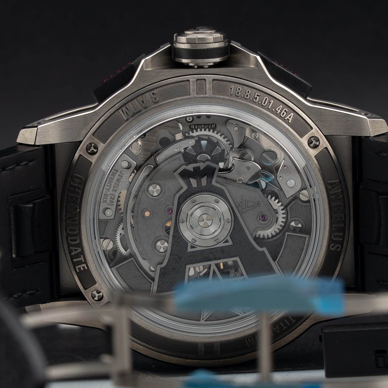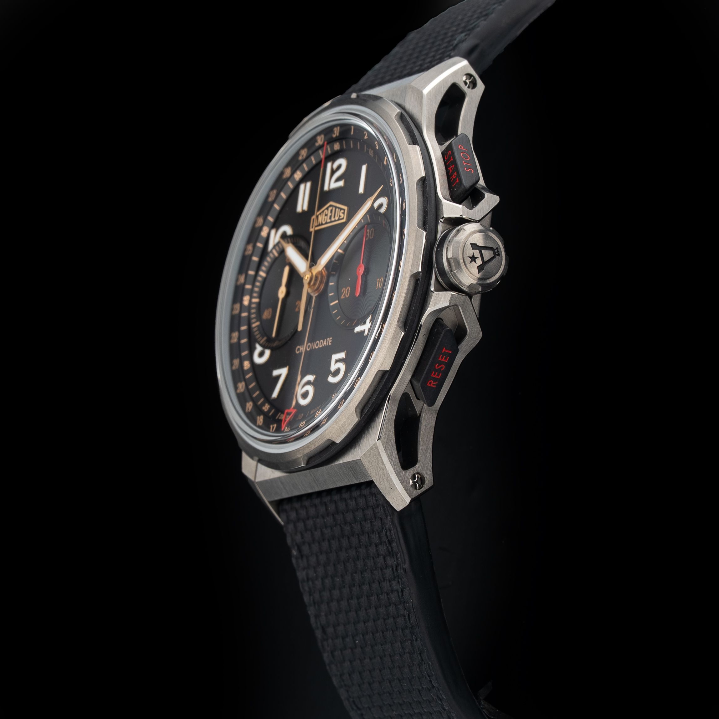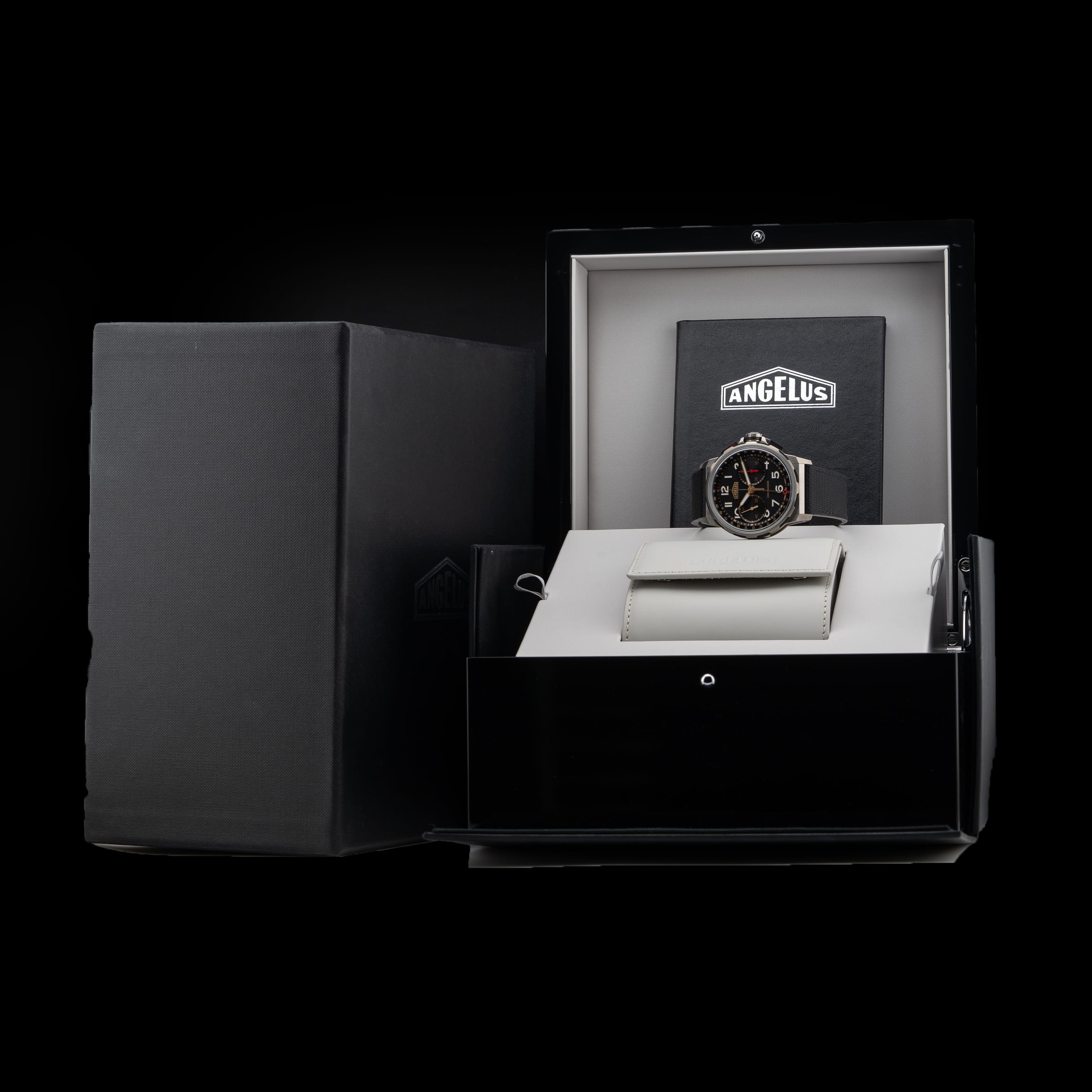 This Angelus 0CDYF.B02A.K009B Chronodate Titanium Black is in GREAT condition it has box, papers and warranty card. This watch has been fully authenticated and certified by Exquisite Timepieces. Please note, the photos shown are of the actual watch you will receive.