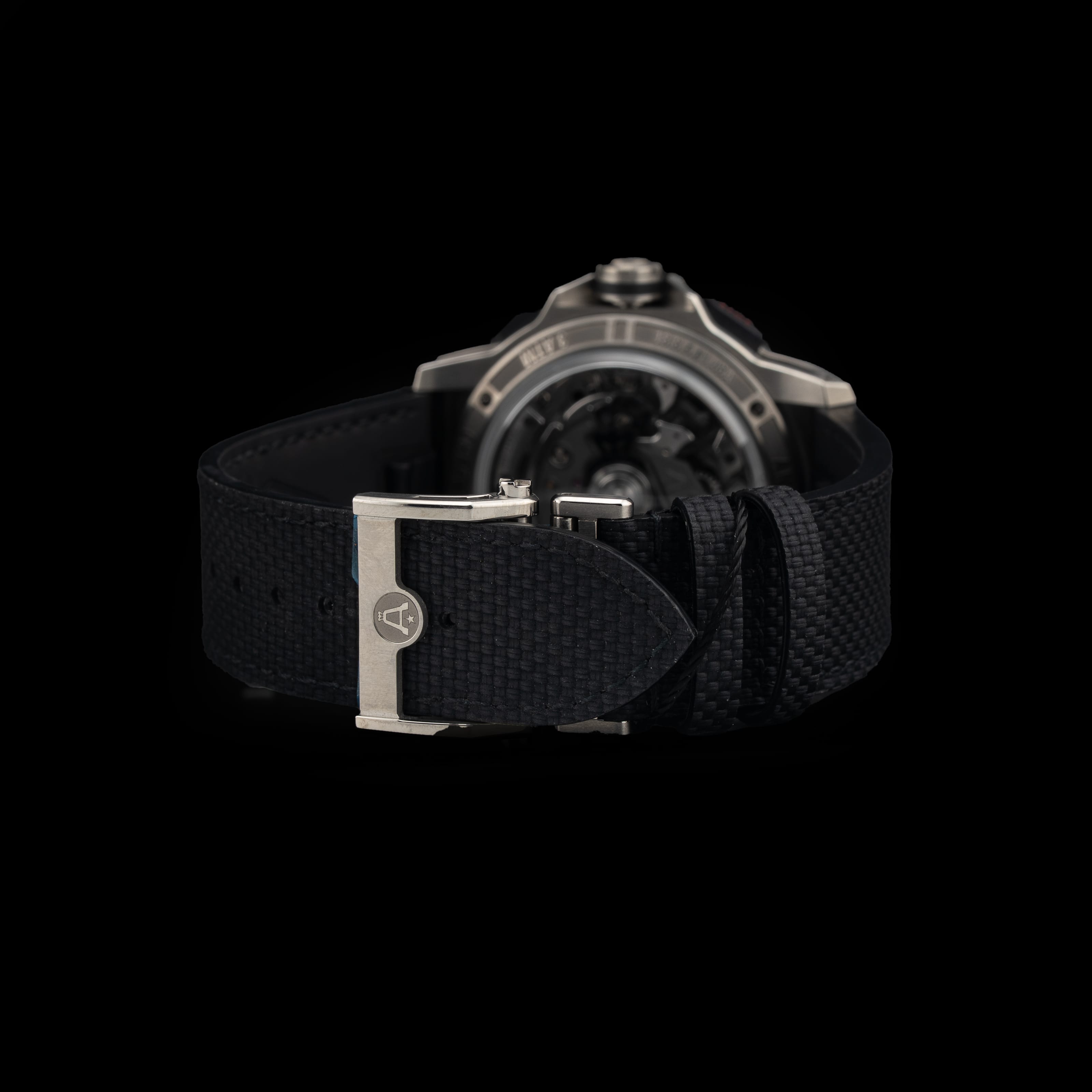 - This timepiece features a 42mm titanium case paired with a high quality rubber strap. It showcases a distinctive black dial and is powered by a precise automatic winding movement. The watch is designed with a water resistance of up to 30m.