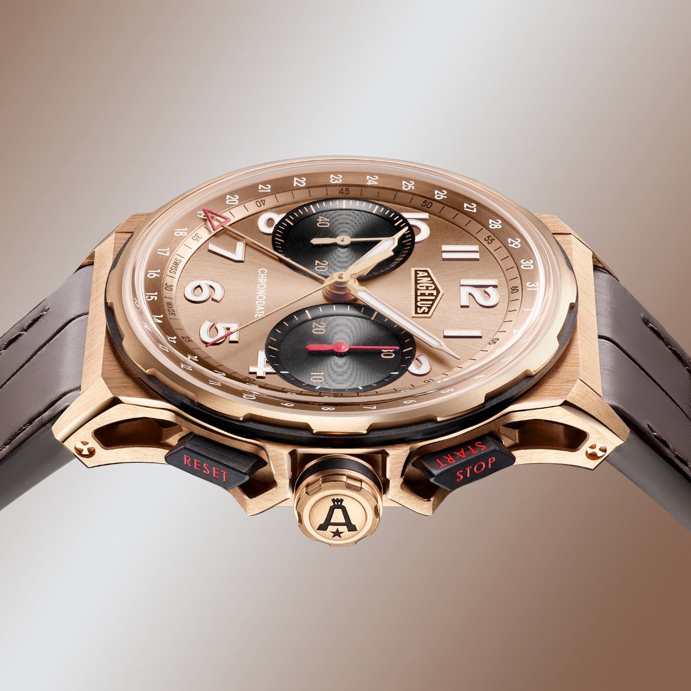 Mocha is a word that conjures up delicious, roasted flavours that blend sweetness and intensity. It also evokes the amber colour adorning the new dials in the Chronodate collection. Paired with a multi-material case and the A-500 self-winding chronograph calibre, this chocolate-tinged theme also extends to the large scales of an alligator strap. Between golden hues and satin-finished textures, the mocha spirit reveals the richness of a refined universe in two limited editions: five red-gold timepieces and twenty-five titanium timepieces.