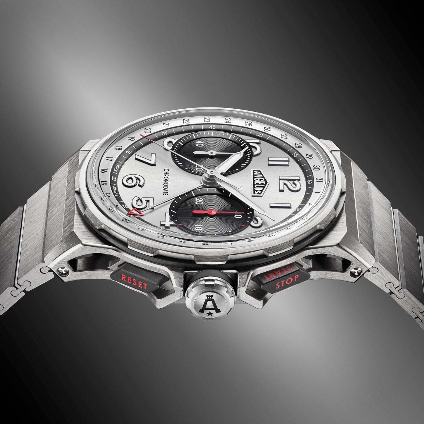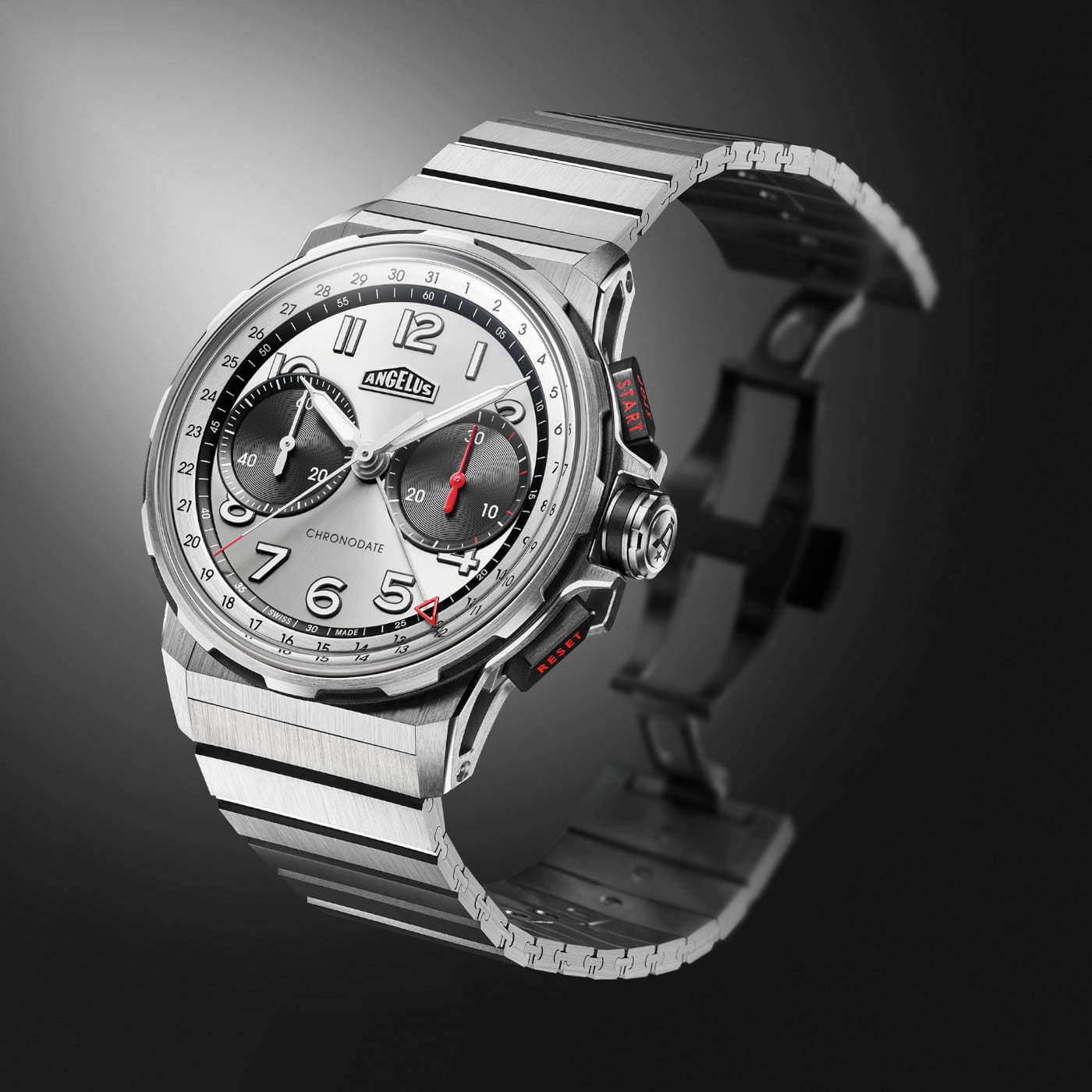 The omnipresent grey of titanium extends into the sunray-brushed grey of the "Magnetic Silver" dial. Chronodate Titanium expresses its technical sophistication in an ensemble where deep black contrasts with a hint of red. With this ultra-sporty, understated and intense new colour scheme, Chronodate Titanium catches the eye, fixes it and draws it towards the horizon.