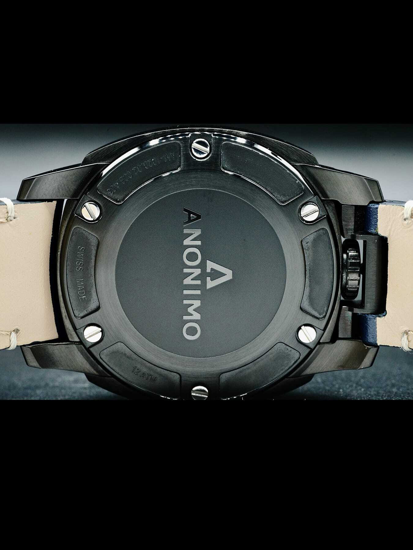 This Anonimo Militare Automatic Steel DLC Blue Dial features a 43.4mm steel DLC case mounted on leather strap. This watch also sports a blue dial.