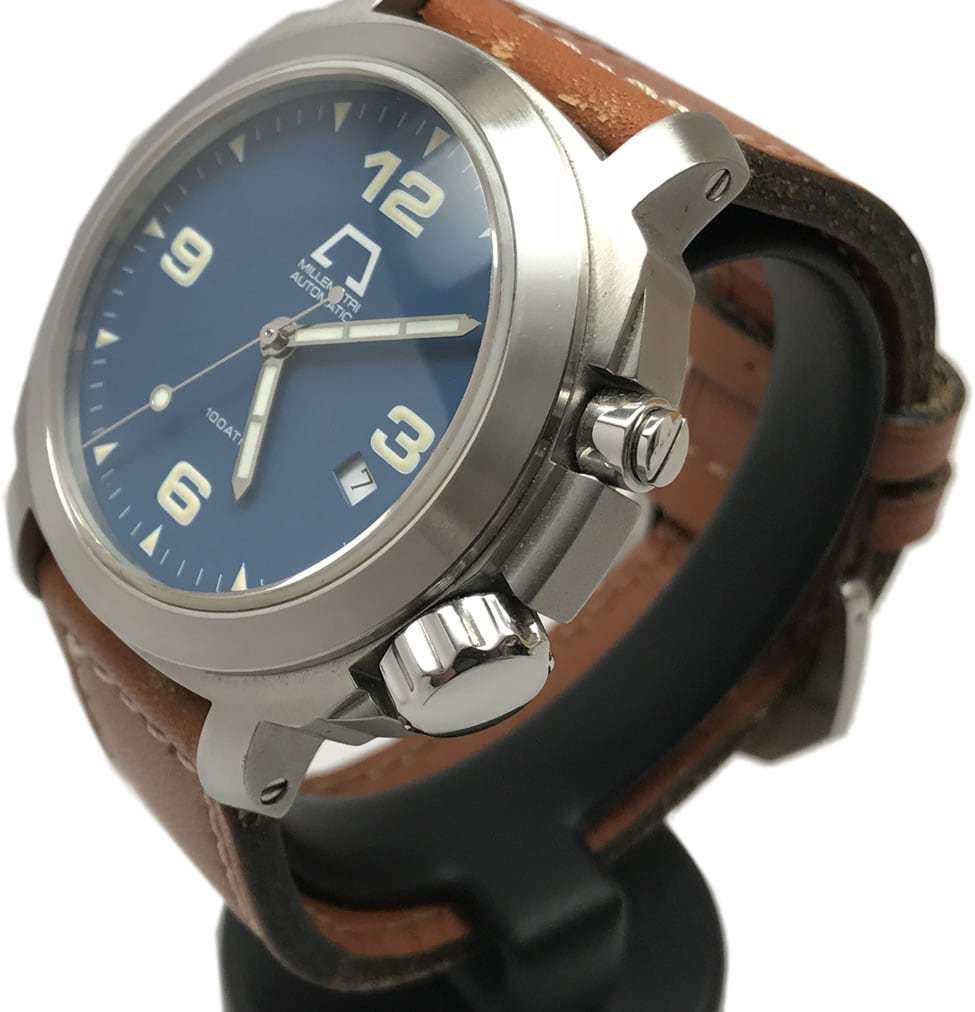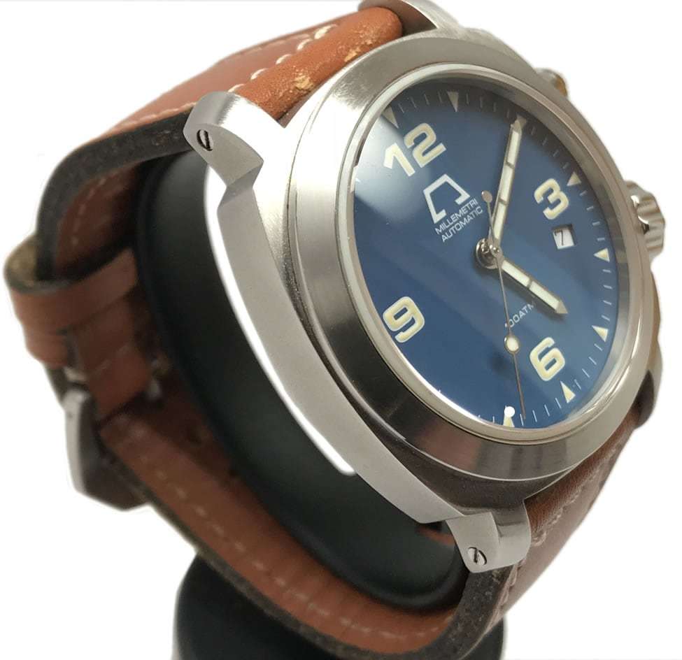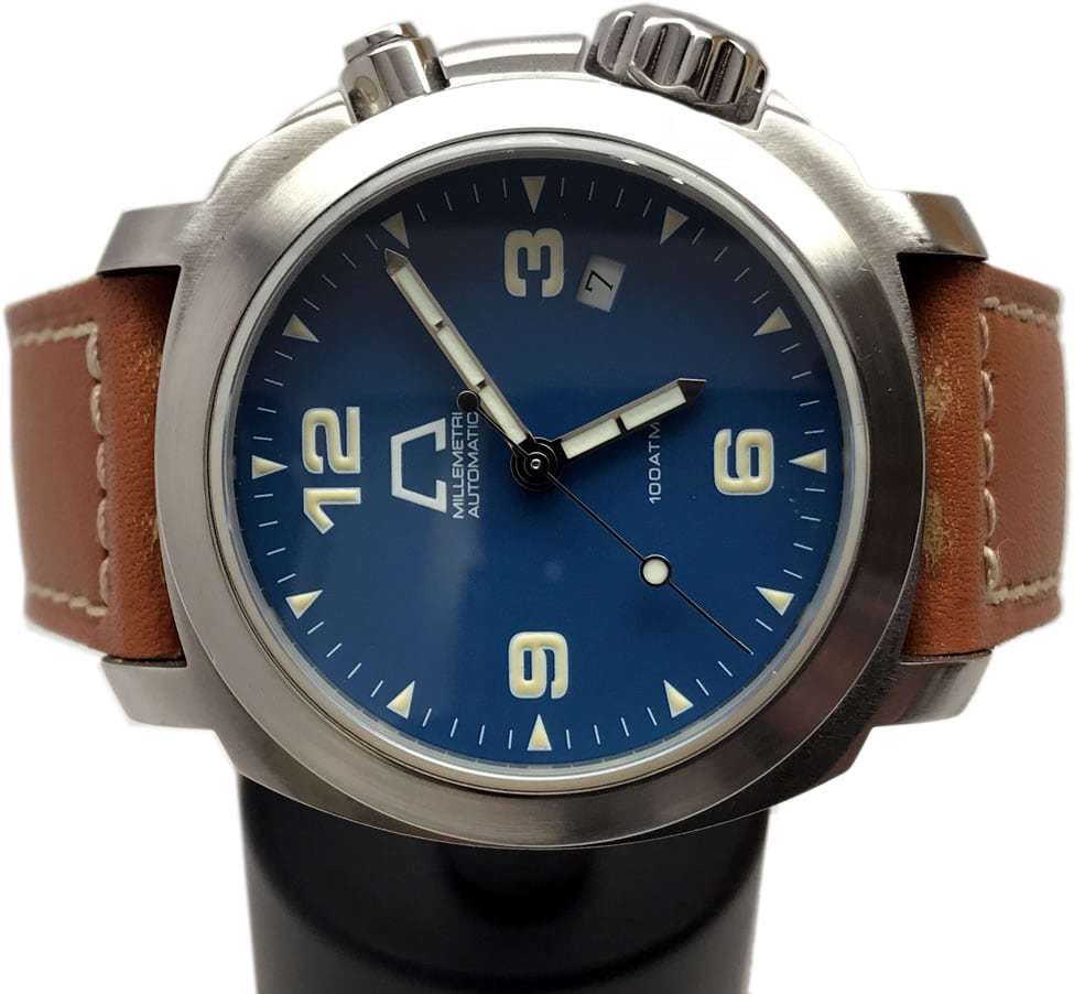 - This timepiece features a 42mm steel case paired with a high quality leather strap. It showcases a distinctive blue dial and is powered by a precise automatic winding movement. The watch is designed with a water resistance of up to 1000M.