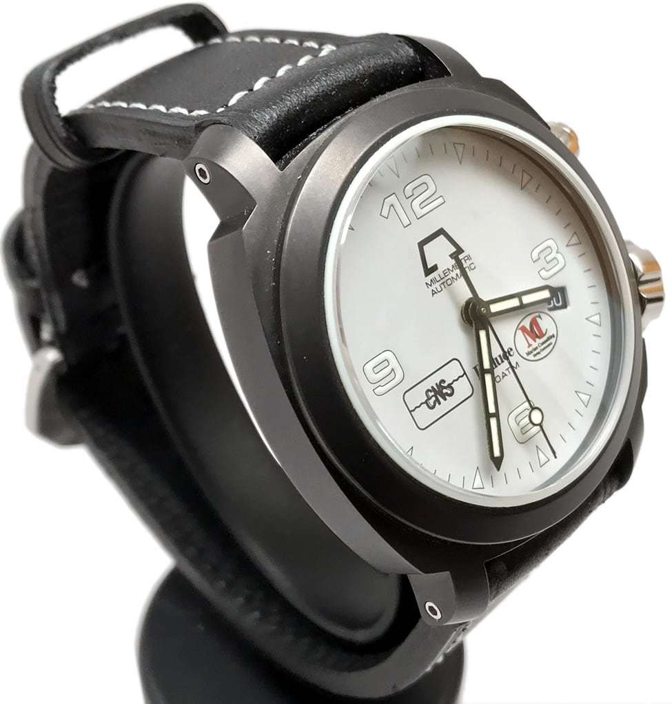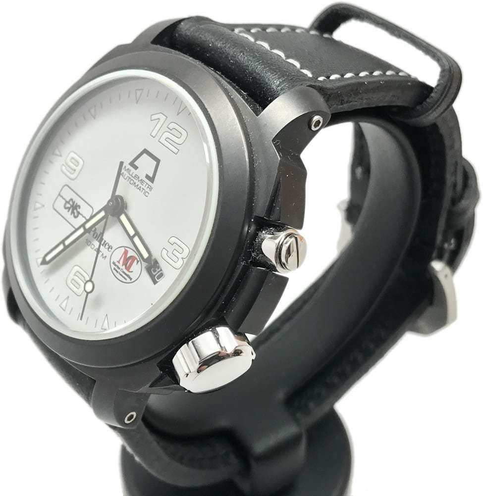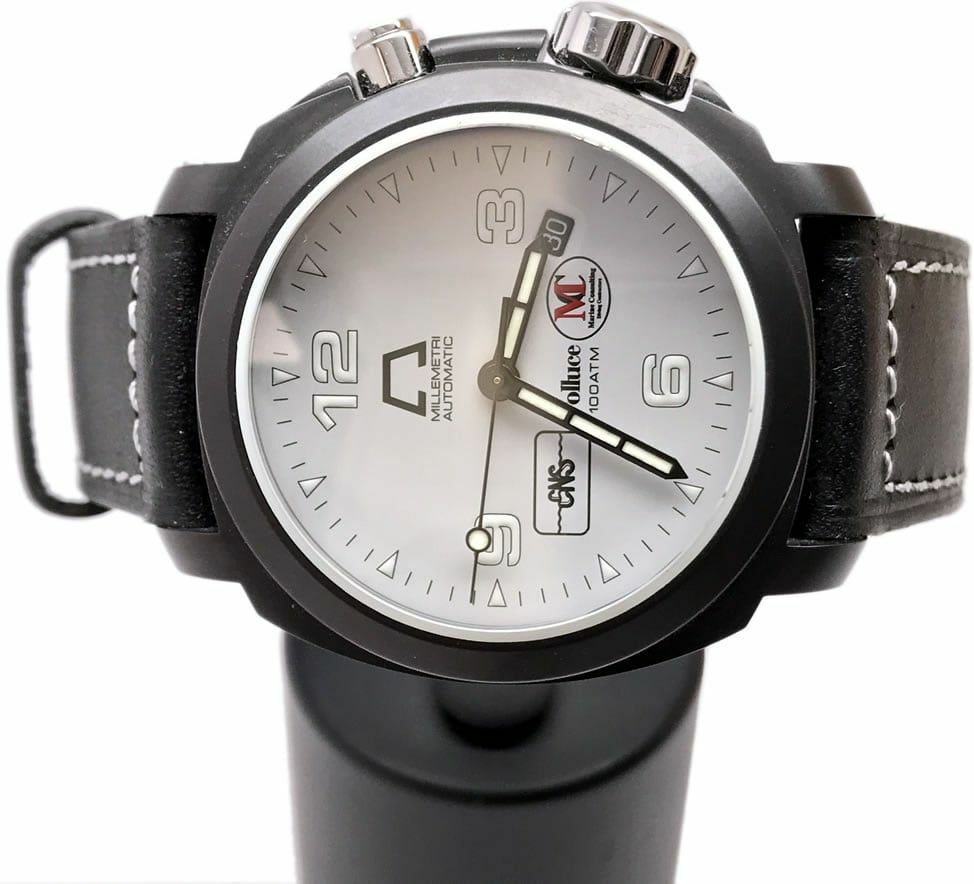 - This timepiece features a 44mm steel case paired with a high quality leather strap. It showcases a distinctive white dial and is powered by a precise automatic winding movement. The watch is designed with a water resistance of up to 1000M.
