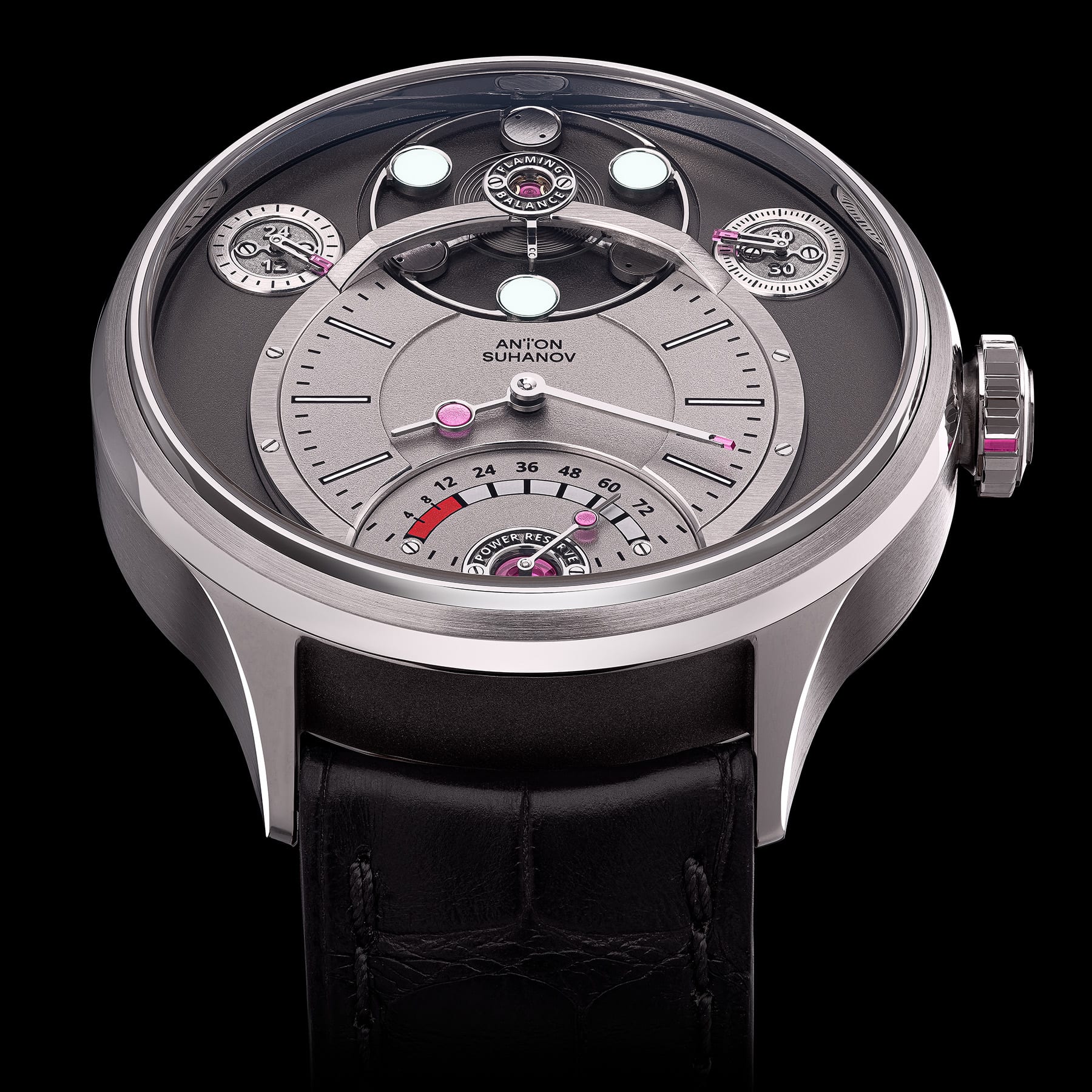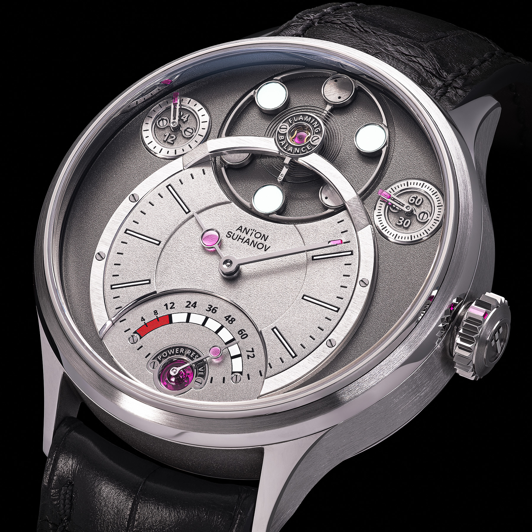 The power reserve indicator hand is also adorned with a ruby cap jewel. The small seconds and 24-hour hands, featuring ruby palettes, are executed in the distinctive "tweezer" style originally developed by Anton Suhanov for the Chronotope watch.
