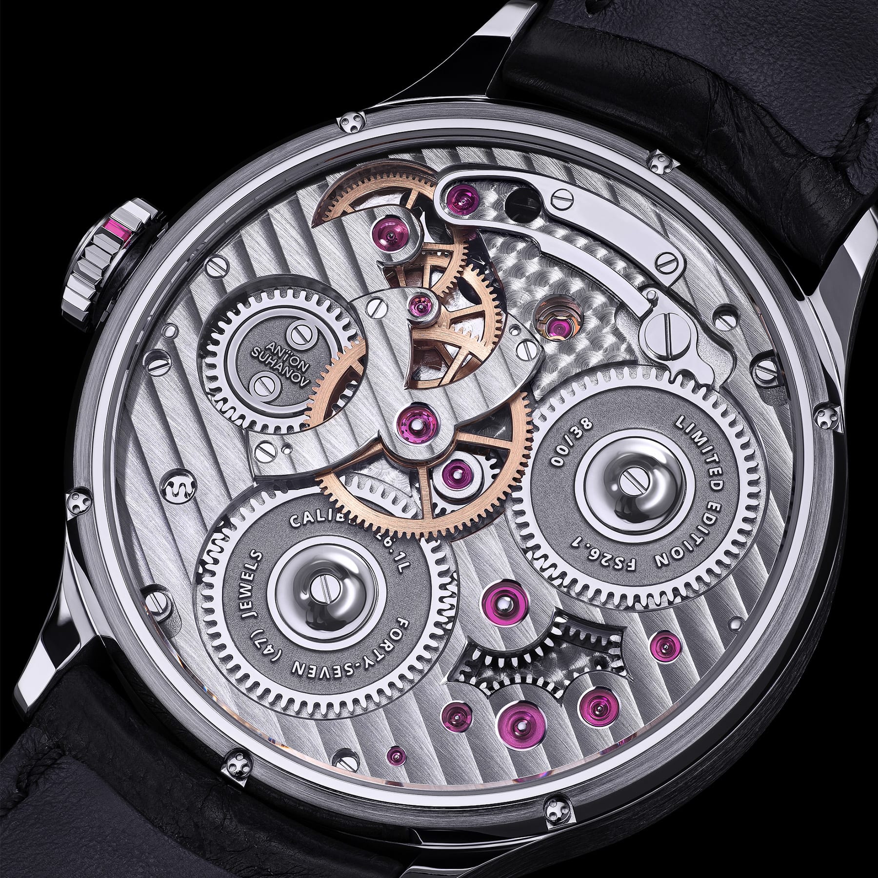 The central Y-shaped bridge of the second and third wheels alludes to St Petersburg, Anton Suhanov's hometown. Its shape evokes the stylised outline of the district where the Neva River divides into the Bolshaya Neva and Malaya Neva at the Peter and Paul Fortress, marked by a jewel. The logo on the movement is positioned exactly where the Anton Suhanov manufacture is located.