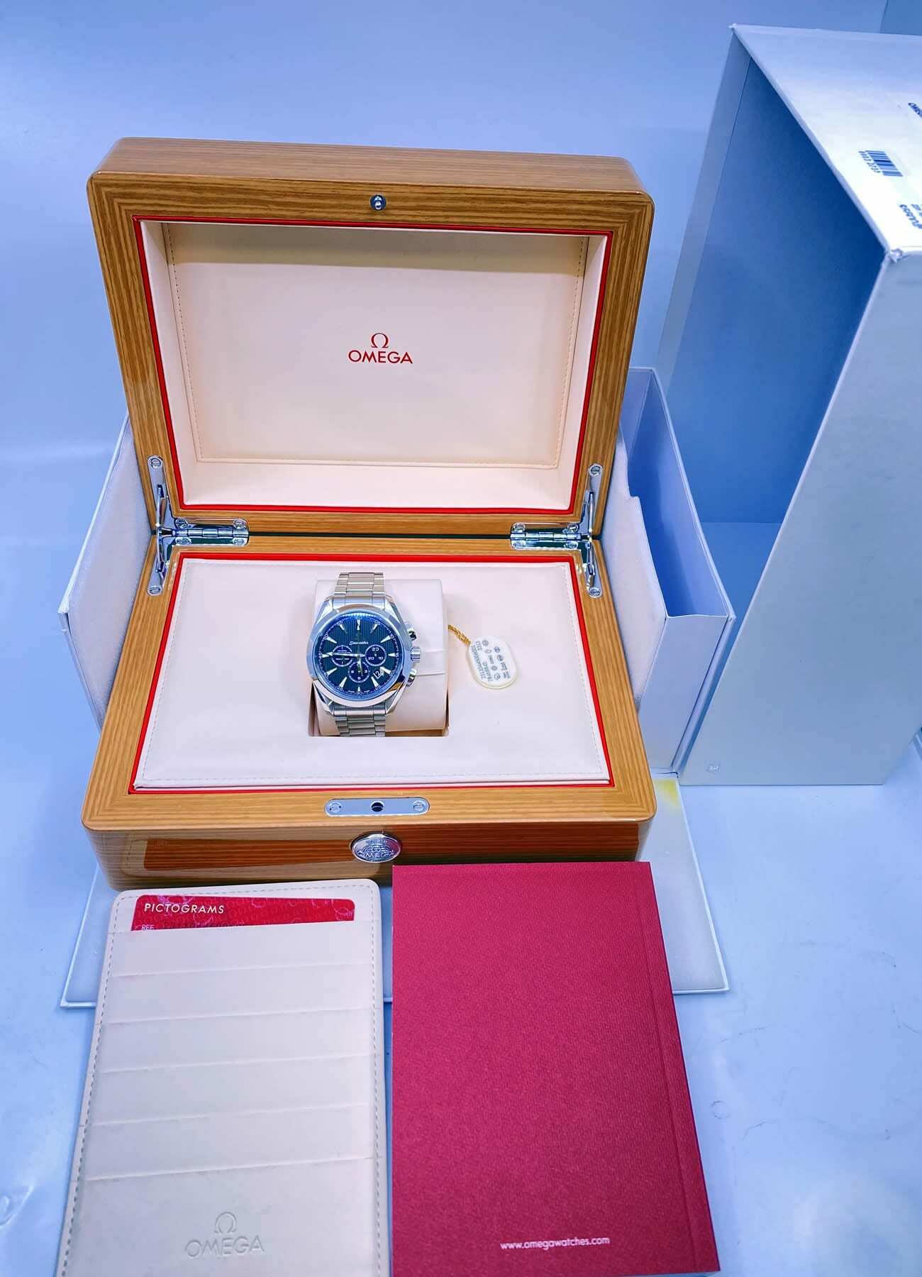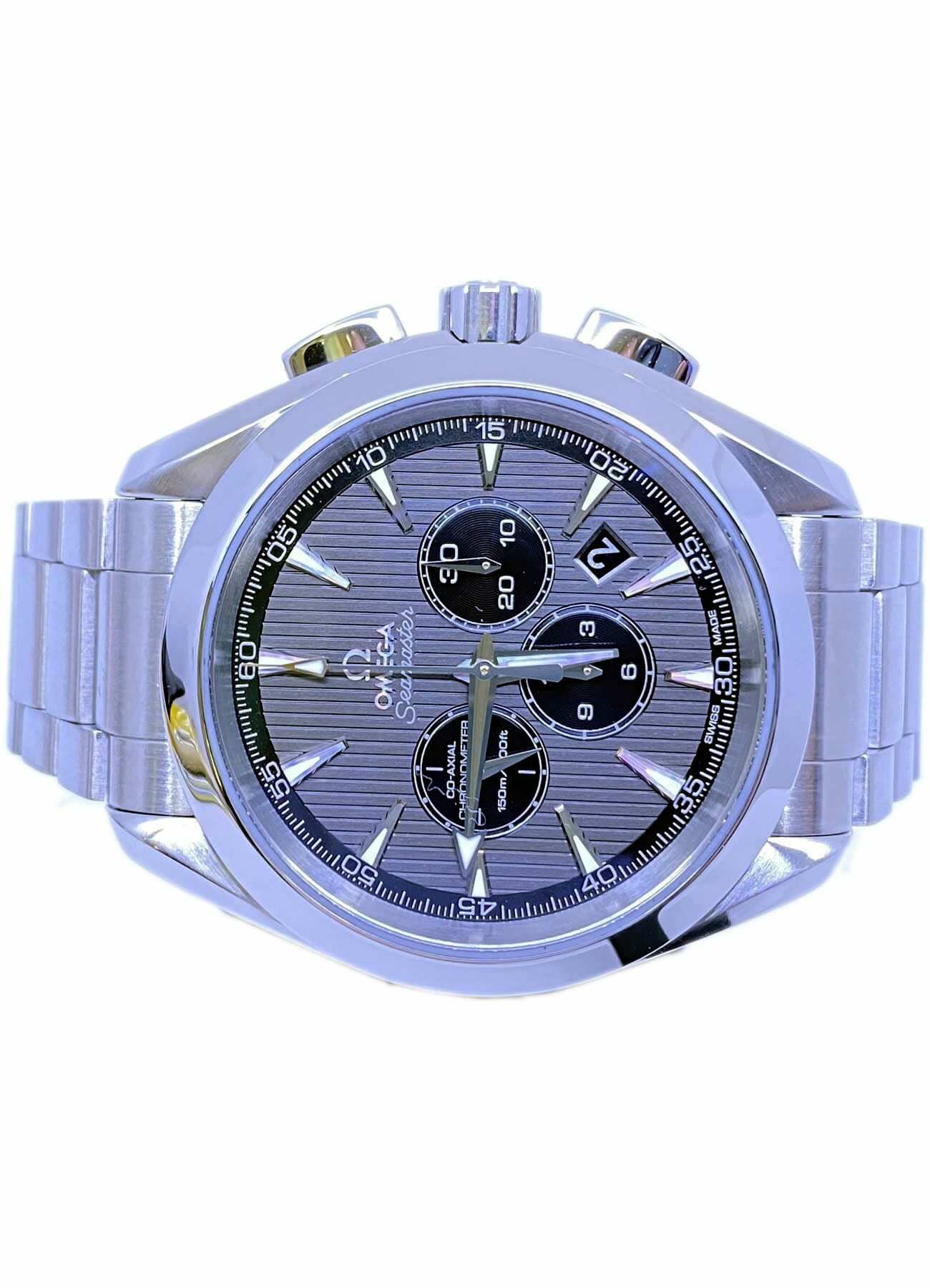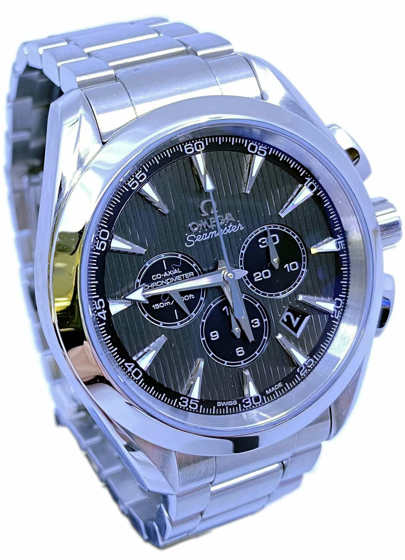 This classic yet robust timepiece represents a tribute to OMEGA's rich maritime heritage. The dramatic and easily-recognisable dial design of the OMEGA Seamaster Aqua Terra 150M collection recalls the wooden decks of luxury sailboats. This model features a grey dial decorated with the Teak Concept pattern and a date window. Thirty-minute and 12-hour recorders, and a small seconds dial can be found at the 3, 6 and 9 o'clock positions, respectively. A scratch-resistant sapphire crystal protects this unique dial. The bezel is mounted on a 44 mm stainless steel case on a stainless steel bracelet. This certified chronometer is powered by the Co-Axial calibre 3313 which can be seen through the transparent caseback.