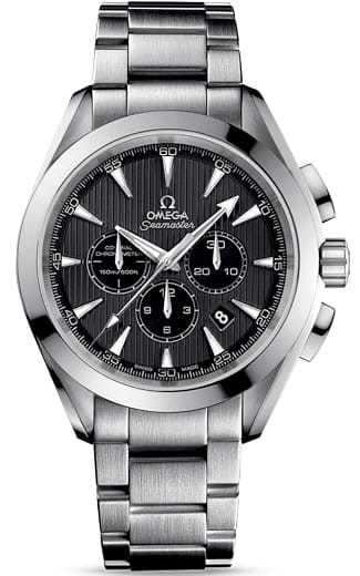 This classic yet robust timepiece represents a tribute to OMEGA's rich maritime heritage. The dramatic and easily-recognisable dial design of the OMEGA Seamaster Aqua Terra 150M collection recalls the wooden decks of luxury sailboats. This model features a grey dial decorated with the Teak Concept pattern and a date window. Thirty-minute and 12-hour recorders, and a small seconds dial can be found at the 3, 6 and 9 o'clock positions, respectively. A scratch-resistant sapphire crystal protects this unique dial. The bezel is mounted on a 44 mm stainless steel case on a stainless steel bracelet. This certified chronometer is powered by the Co-Axial calibre 3313 which can be seen through the transparent caseback.