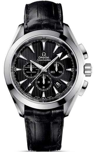This classic yet robust timepiece represents a tribute to OMEGA's rich maritime heritage. The dramatic and easily-recognisable dial design of the OMEGA Seamaster Aqua Terra 150M collection recalls the wooden decks of luxury sailboats. This model features a black dial decorated with the Teak Concept pattern and a date window. Thirty-minute and 12-hour recorders, and a small seconds dial can be found at the 3, 6 and 9 o'clock positions, respectively. A scratch-resistant sapphire crystal protects this unique dial. The bezel is mounted on a 44 mm stainless steel case on a black leather strap. This certified chronometer is powered by the Co-Axial calibre 3313 which can be seen through the transparent caseback.